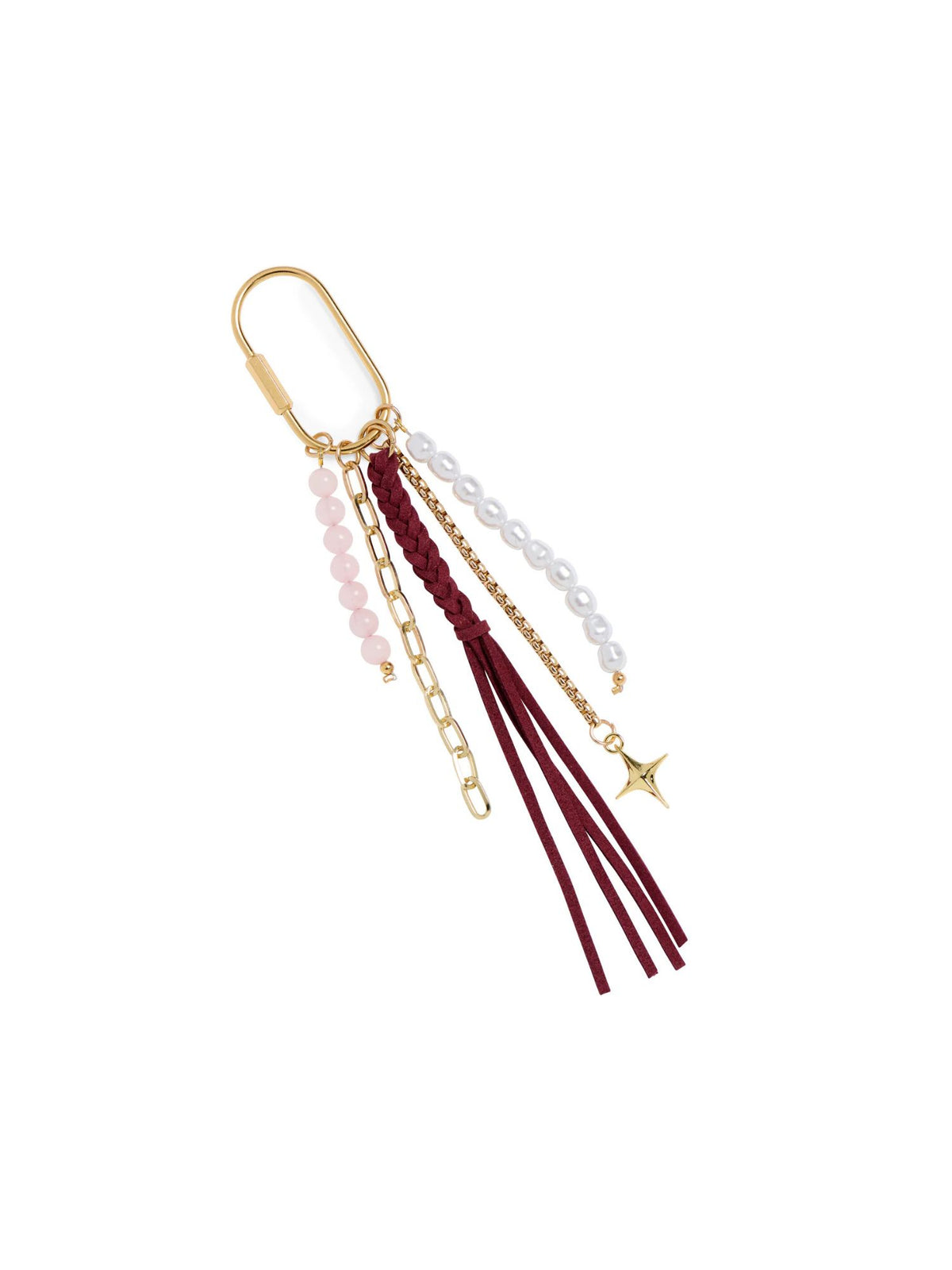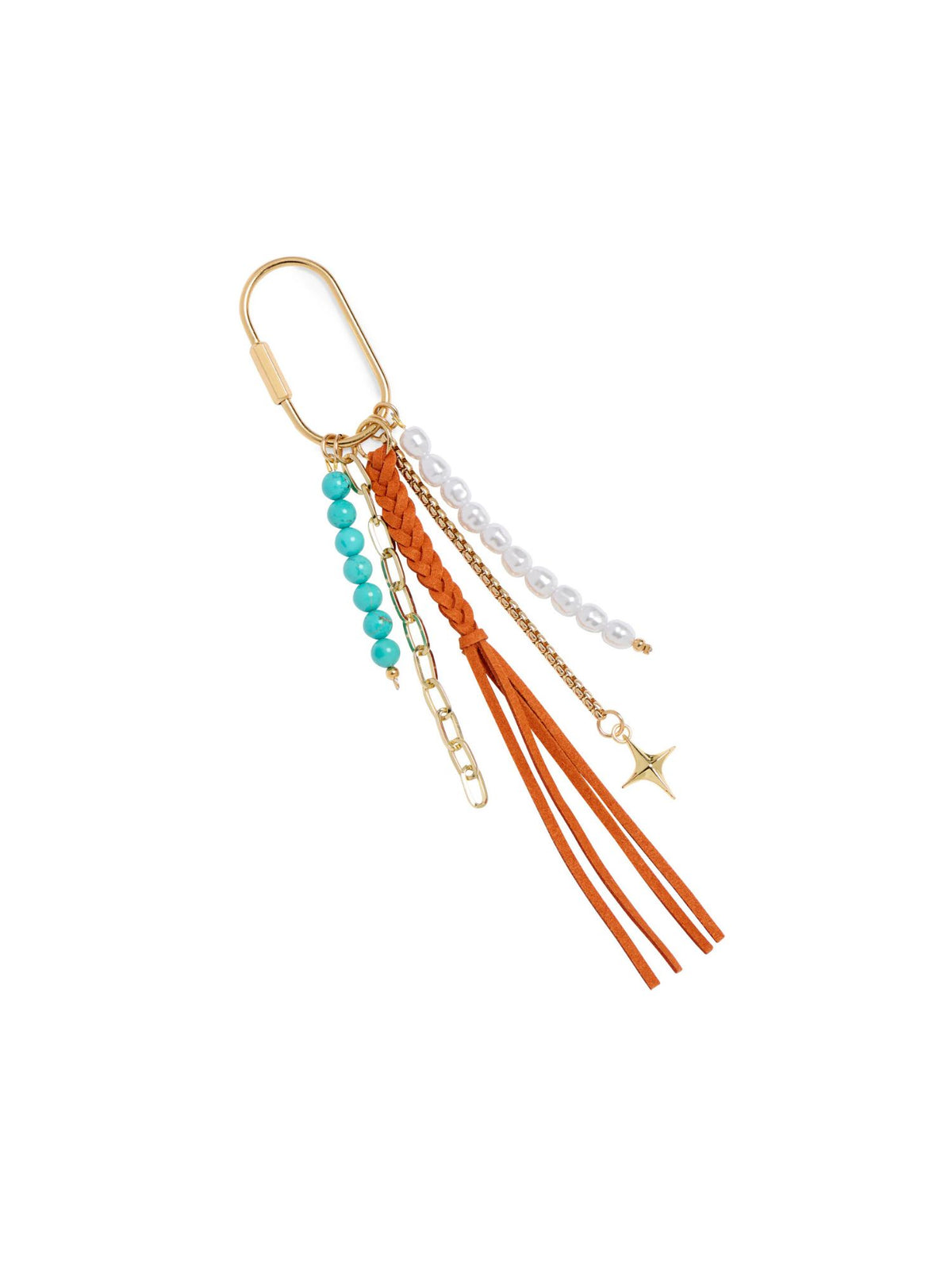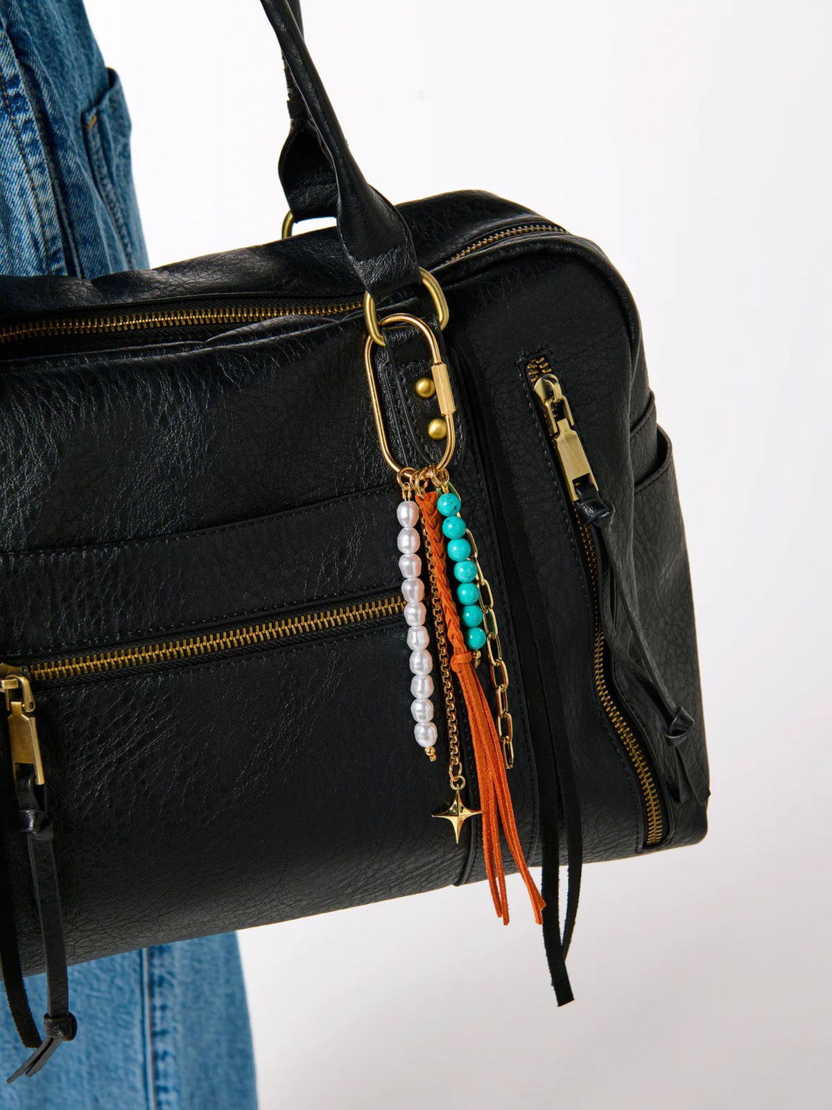 Transform your tote into a conversation starter with our Tassel Bag Charm. This whimsical accessory blends faux suede fringe, lustrous pearls, and stone beads with polished gold-tone chains for a textured, eye-catching look. The oversized clasp clips effortlessly onto bags or keychains, letting you swap styles whenever the mood strikes. Choose from multiple colors to match your vibe and add that perfect pop of personality to your everyday carry.