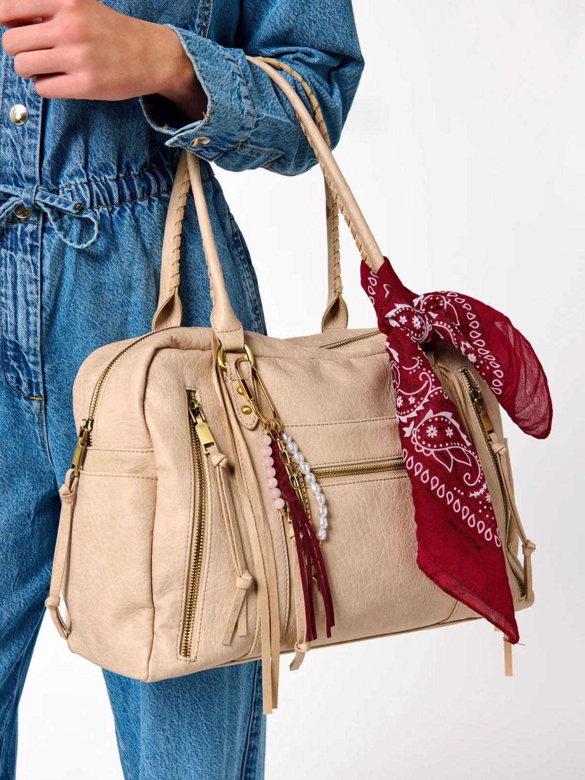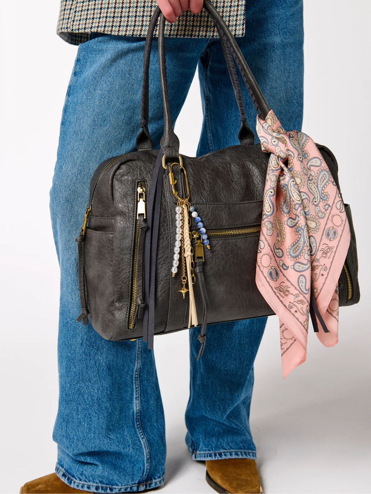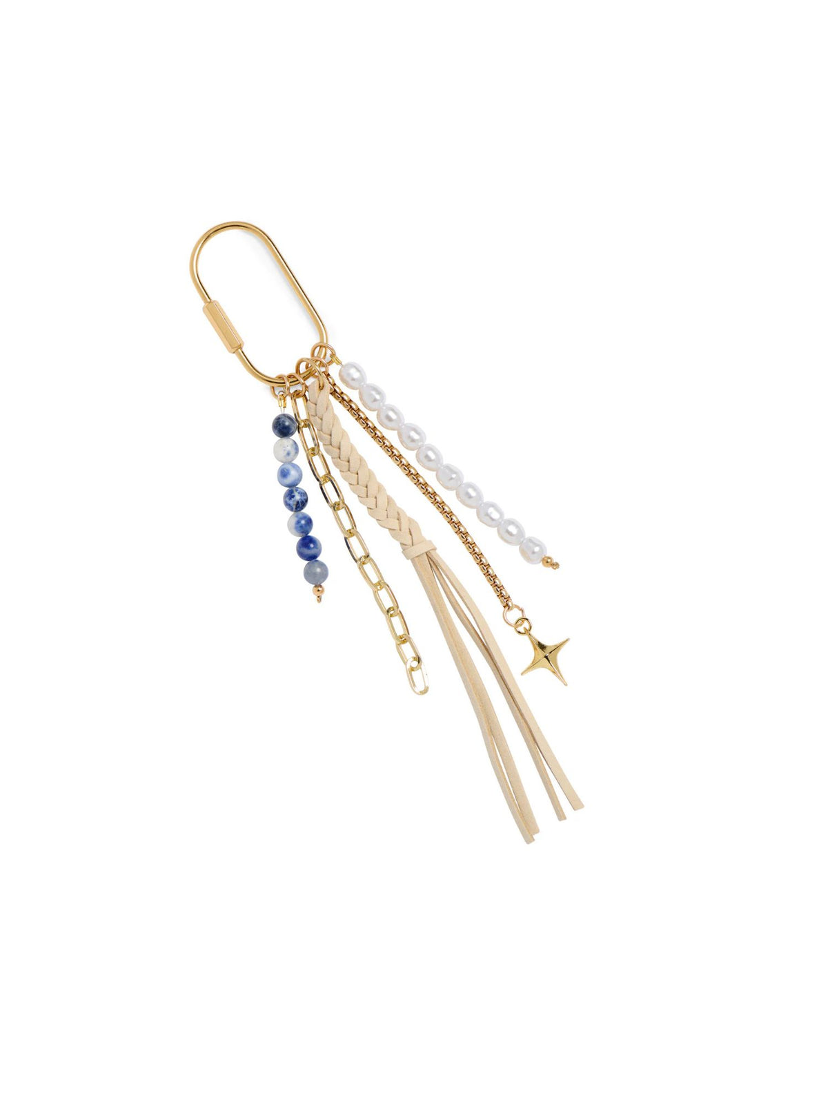 Transform your tote into a conversation starter with our Tassel Bag Charm. This whimsical accessory blends faux suede fringe, lustrous pearls, and stone beads with polished gold-tone chains for a textured, eye-catching look. The oversized clasp clips effortlessly onto bags or keychains, letting you swap styles whenever the mood strikes. Choose from multiple colors to match your vibe and add that perfect pop of personality to your everyday carry.