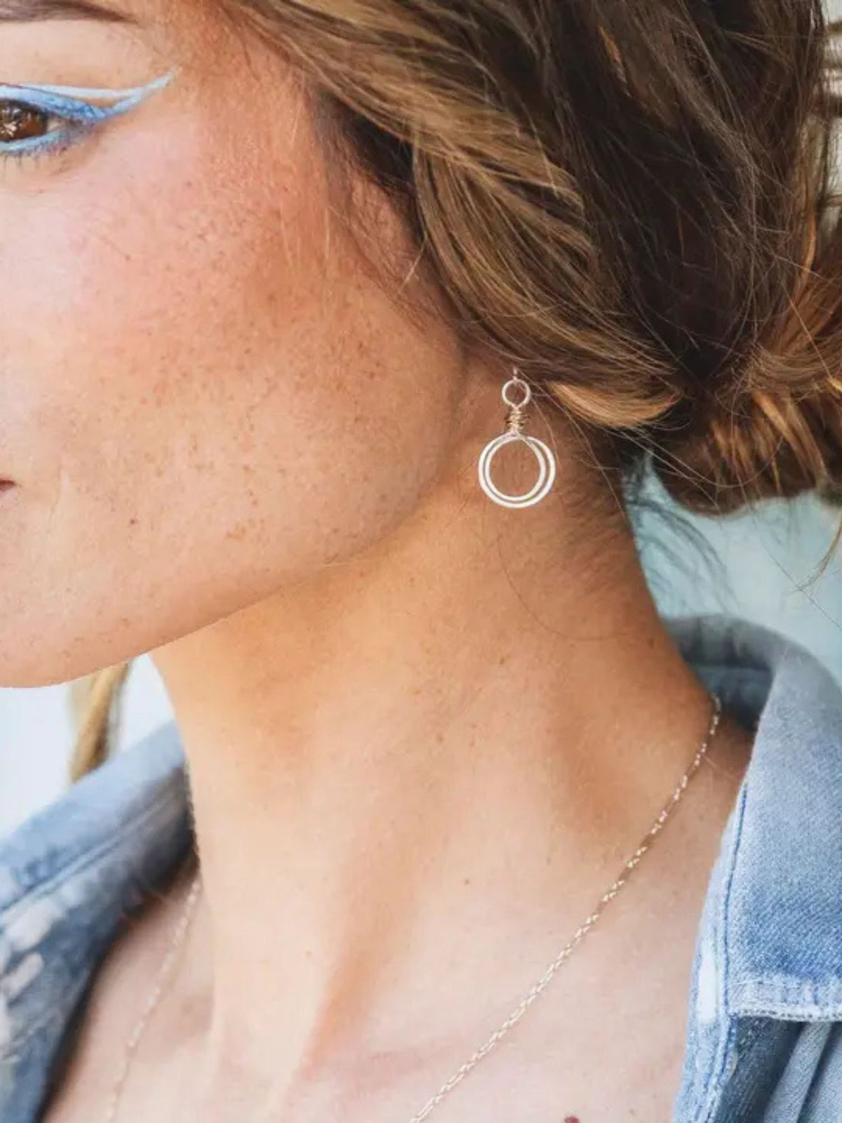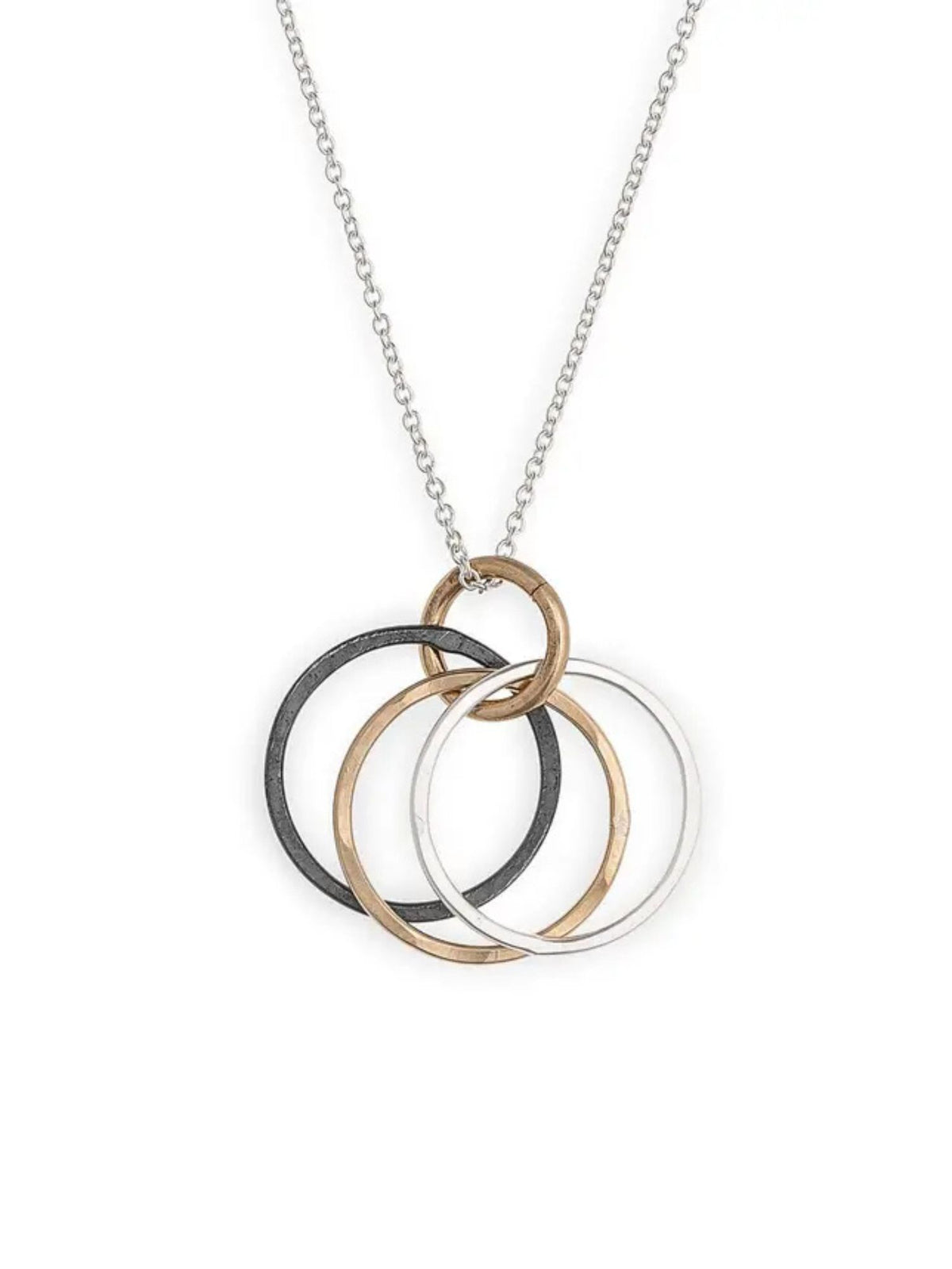 A sleek blend of metals, the Hustle Necklace features interlocking rings crafted from sterling silver, oxidized sterling silver, and gold-filled metal. Each textured circle adds dimension and visual interest, creating a modern, layered look. Suspended on a delicate 16" sterling silver chain, this mixed-metal piece pairs effortlessly with both casual and dressy outfits for versatile, everyday style.