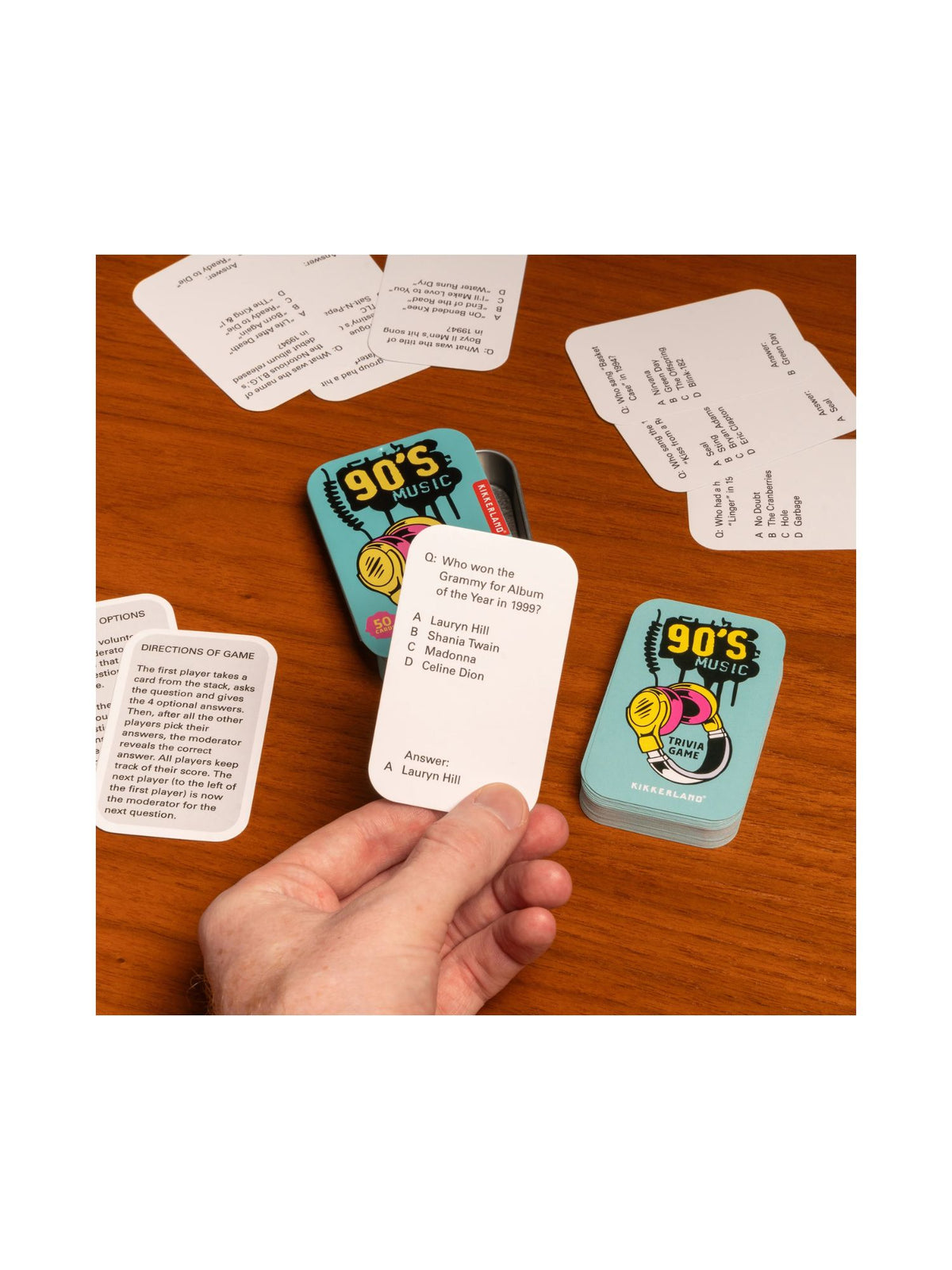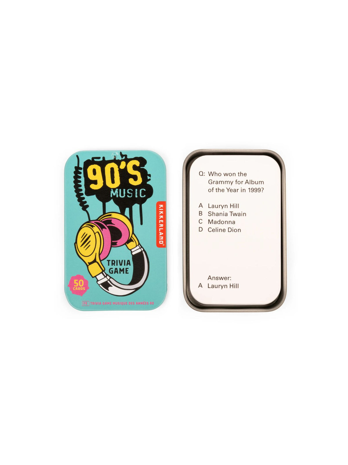 Relive the groovy 90s with this pack of 50 music trivia questions! Packed in a portable tin, bring the fun on-the-go for parties or road trips. Get ready to rock out and test your knowledge!