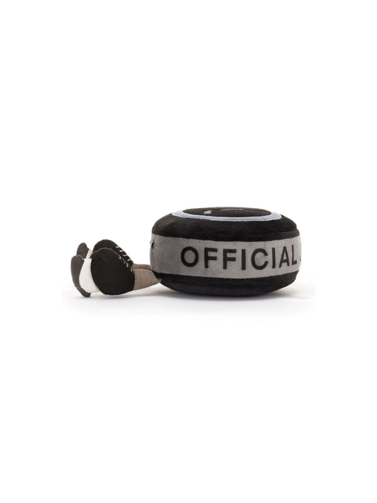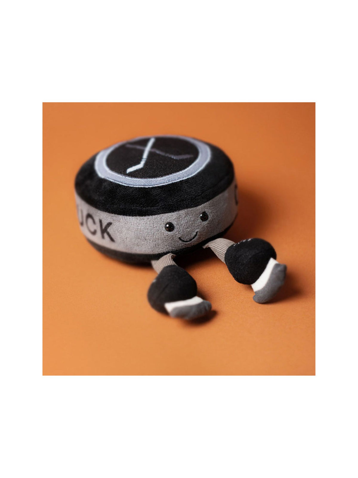 Meet the Jellycat Amuseables Sports Ice Hockey Puck—your new favorite puck with a fun twist! Covered in soft black fur, it sports a stylish grey tummy band and denim-blue suedette patches, all topped off with embroidered hockey sticks. Its mocha cord legs and quirky skates in black, cream, and grey faux-suede add a playful vibe. Perfect for fans who love a puck with personality!
