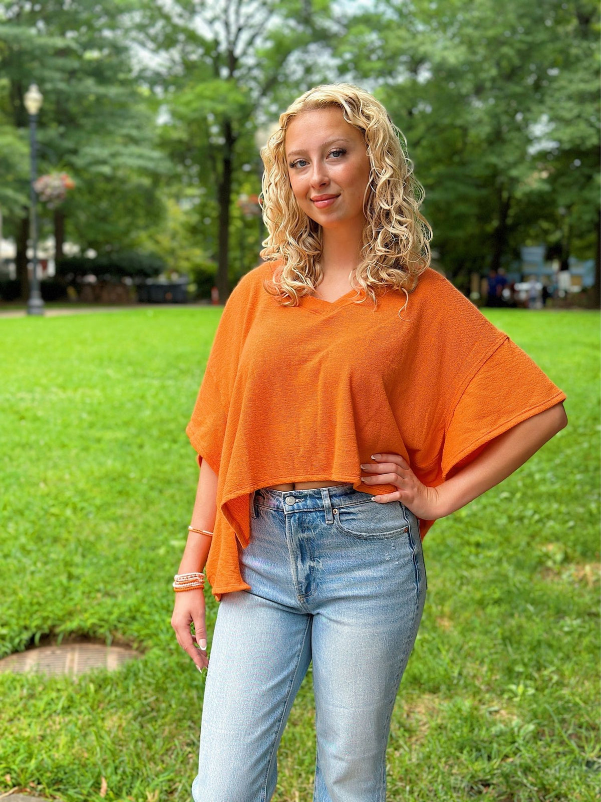 Get Vols game day ready with this playful V-Neck Oversized Knit Top! Crafted from soft, solid slub stretch fabric, it offers a comfy oversized fit with short sleeves and a trendy high-low silhouette. Side slits add a fun twist, making it perfect for cheering on the Tennessee Vols in style and comfort.