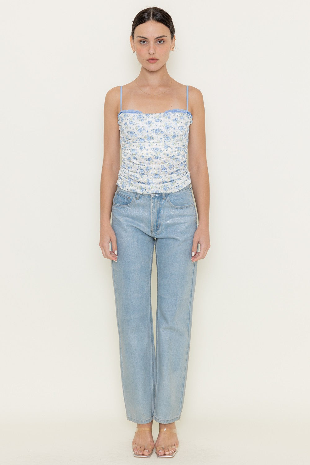 Introducing Paradise in Blue top! This semi-cropped cami top features a delicate ditsy floral print, adjustable spaghetti straps, and a charming ruched bust. The bra insert, made of beautiful eyelash lace, provides just the right amount of support and coverage. Add a touch of paradise to your wardrobe with this top!