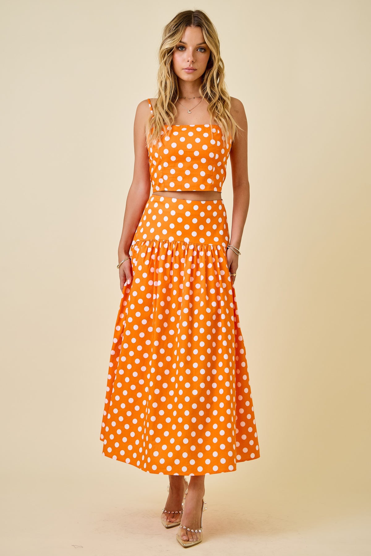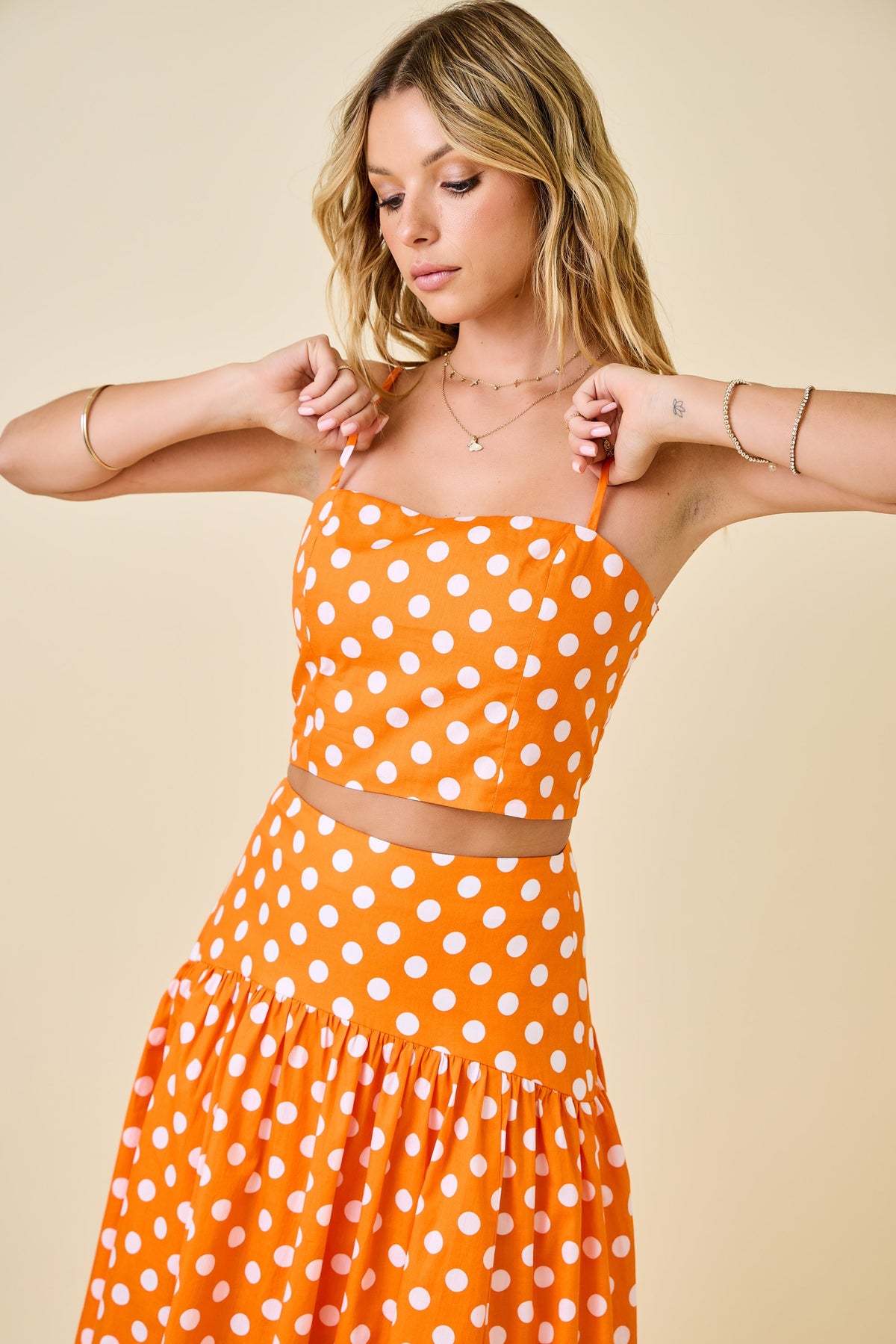 This playful polka dot crop top features delicate spaghetti straps and a flattering cropped fit, perfect for warm days and fun outings. Pair it with the matching skirt to complete a charming, coordinated look that turns heads wherever you go. Embrace effortless style with this cute and lively set.
