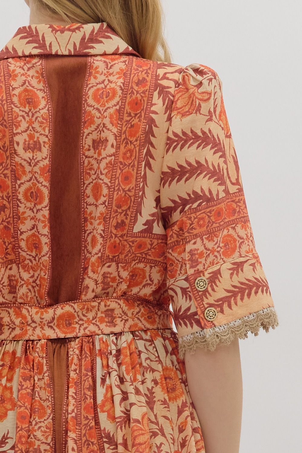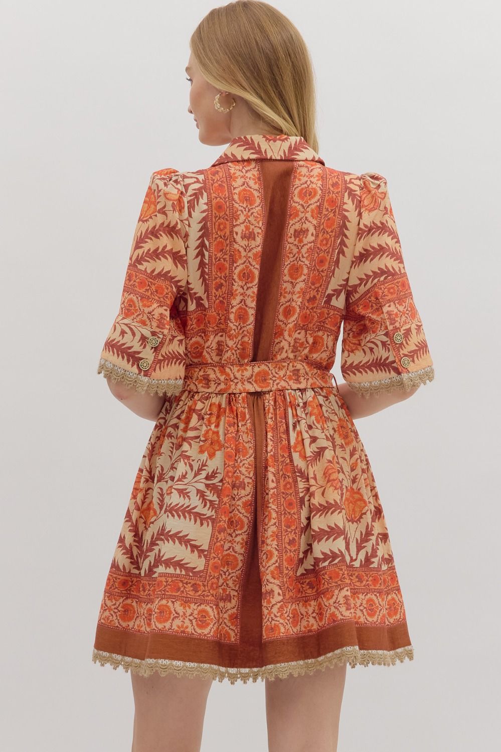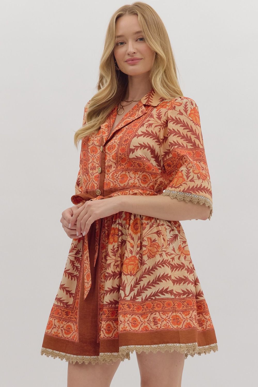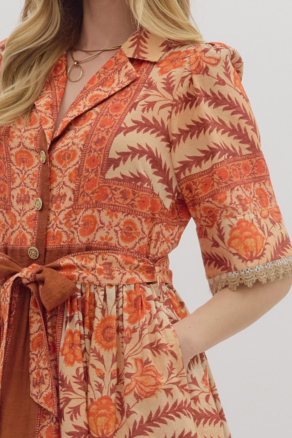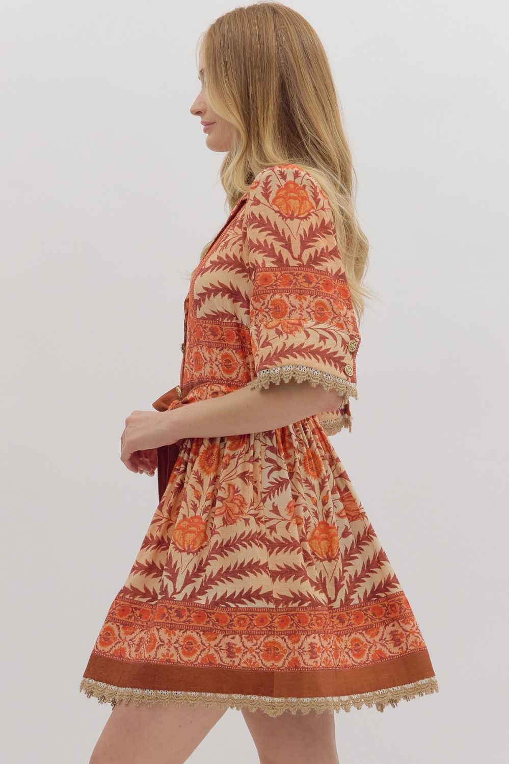 Fall florals meet timeless charm in the Autumn Botanical Belted Mini Dress. This botanical print mini features short puff sleeves, lace trim accents, and contrast detailing for a beautifully feminine touch. A removable self-belt and elasticated back waist create a flattering fit, while side pockets add everyday ease. Fully lined and finished with a button-front closure, it’s the perfect piece to transition your wardrobe into the new season.