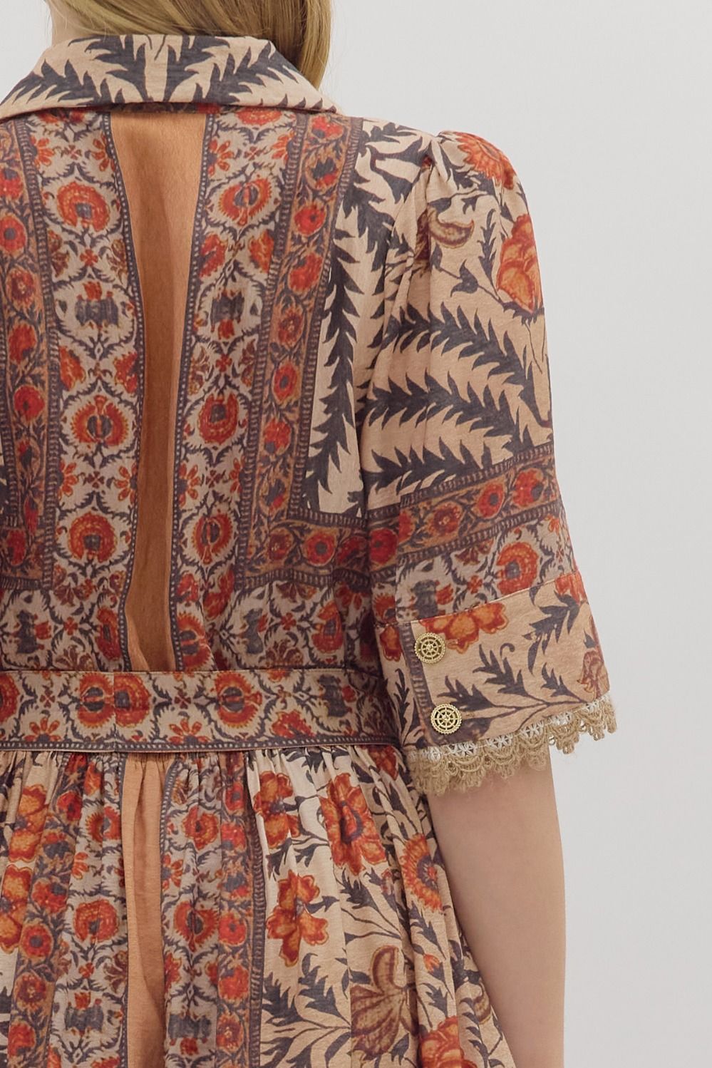 Fall florals meet timeless charm in the Autumn Botanical Belted Mini Dress. This botanical print mini features short puff sleeves, lace trim accents, and contrast detailing for a beautifully feminine touch. A removable self-belt and elasticated back waist create a flattering fit, while side pockets add everyday ease. Fully lined and finished with a button-front closure, it’s the perfect piece to transition your wardrobe into the new season.