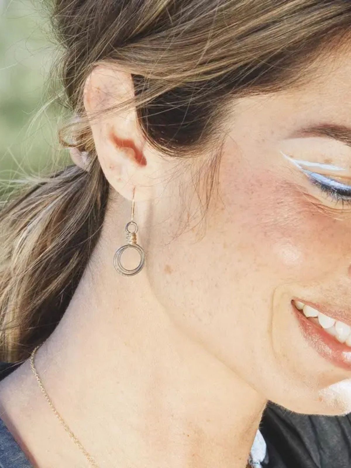 These Antique Gold Swirl Loop Earrings bring a twist to your everyday look with their double-looped wire design, hammered and oxidized to a magical black-gray shimmer. The delicate gold-filled wire wrapping adds a charming pop of mixed metal style, making these playful earrings a perfect match for any outfit—no matter the occasion.