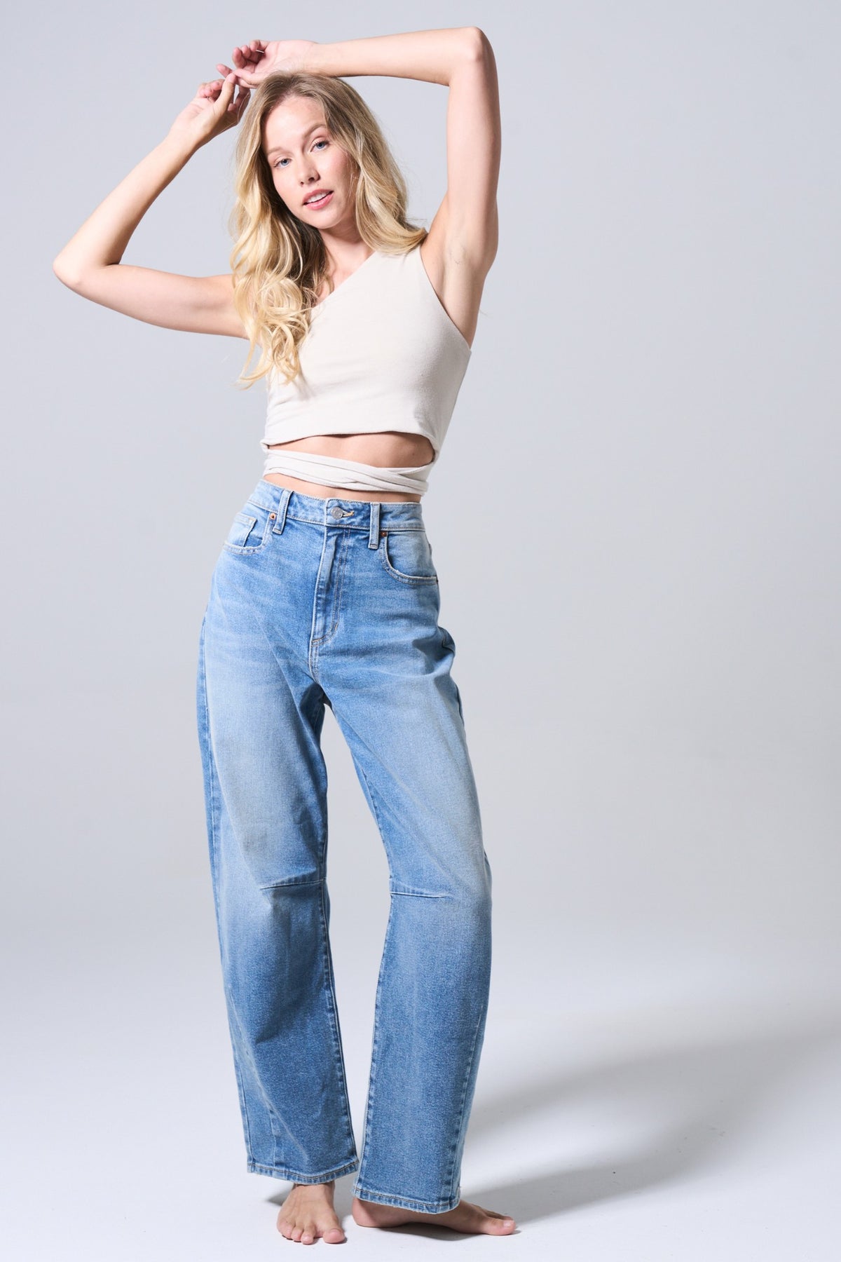 Get comfortable while turning heads with the High Rise Wide Straight Barrel Jeans by SneakPeek! Made with stretch fabric, these jeans offer a comfortable fit while maintaining a high rise waist. The wide straight barrel design adds a unique touch to any outfit. Available in medium light wash.