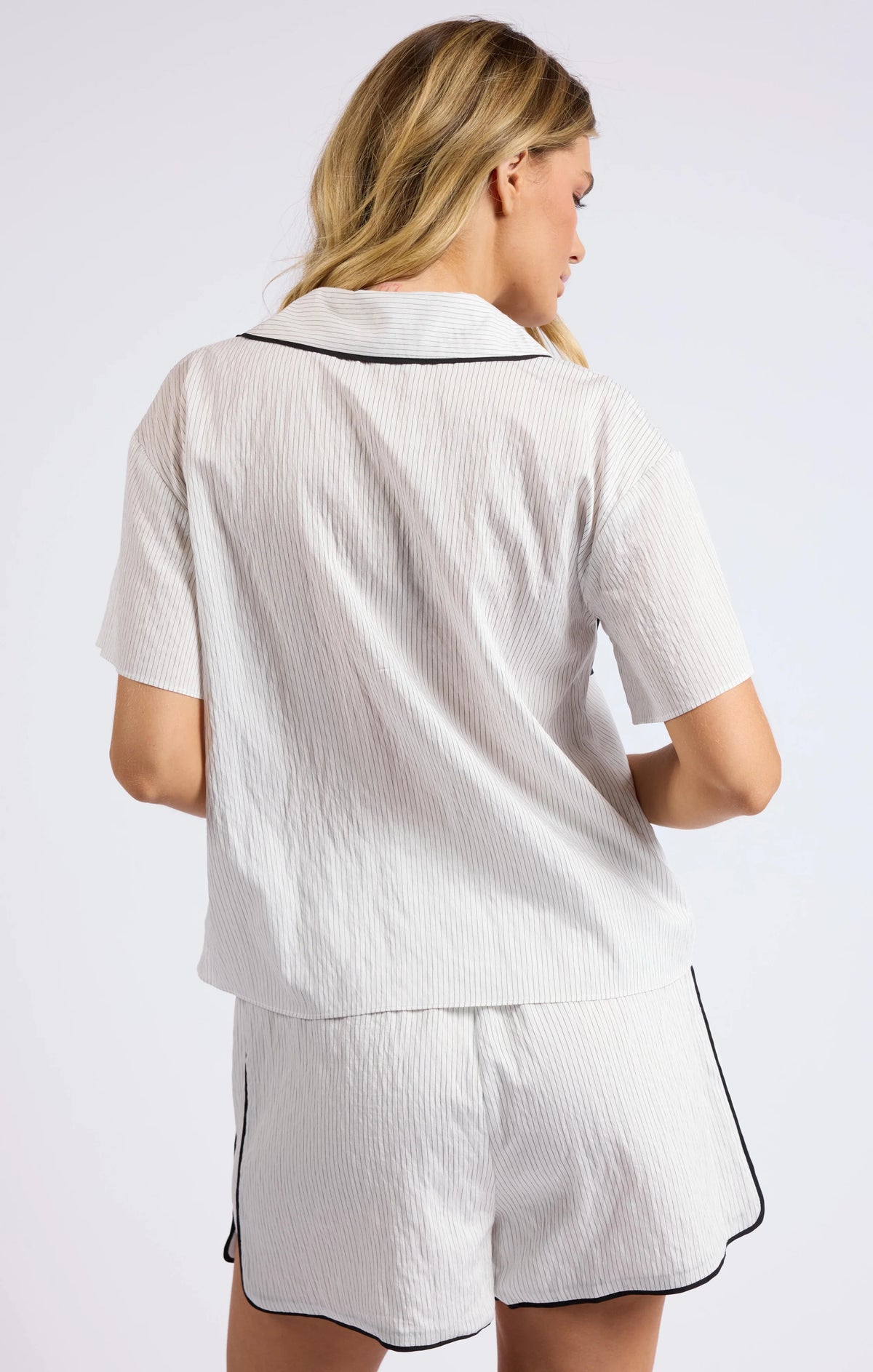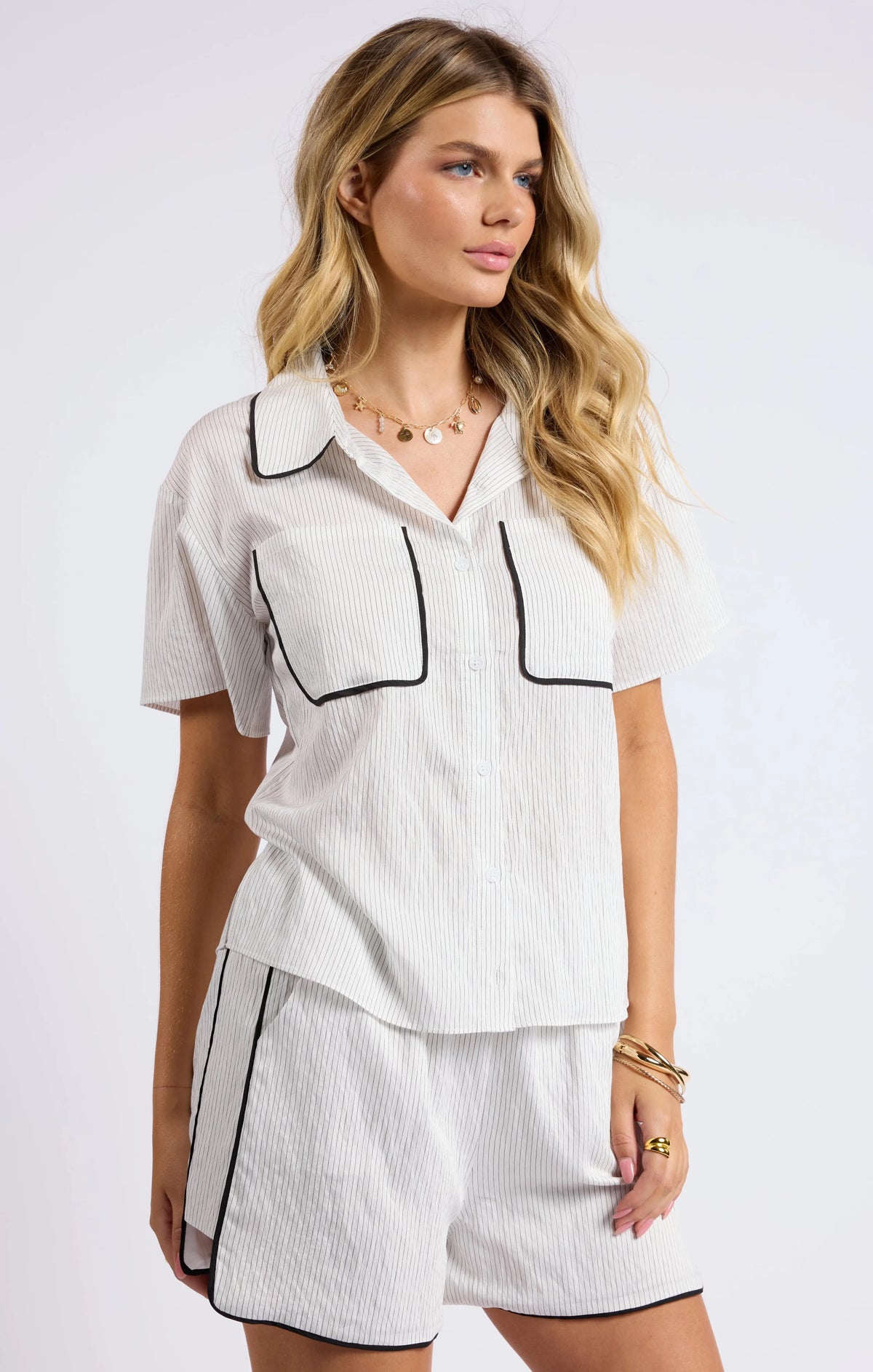 Unleash your playful side with the Sage the Label Community Contrast Piping Shirt. With its collared design and convenient front pockets, this button-up shirt is a staple in any wardrobe. But it's the contrast piping and striped pattern that give it that extra touch of fun and quirkiness. Get ready to stand out in style!