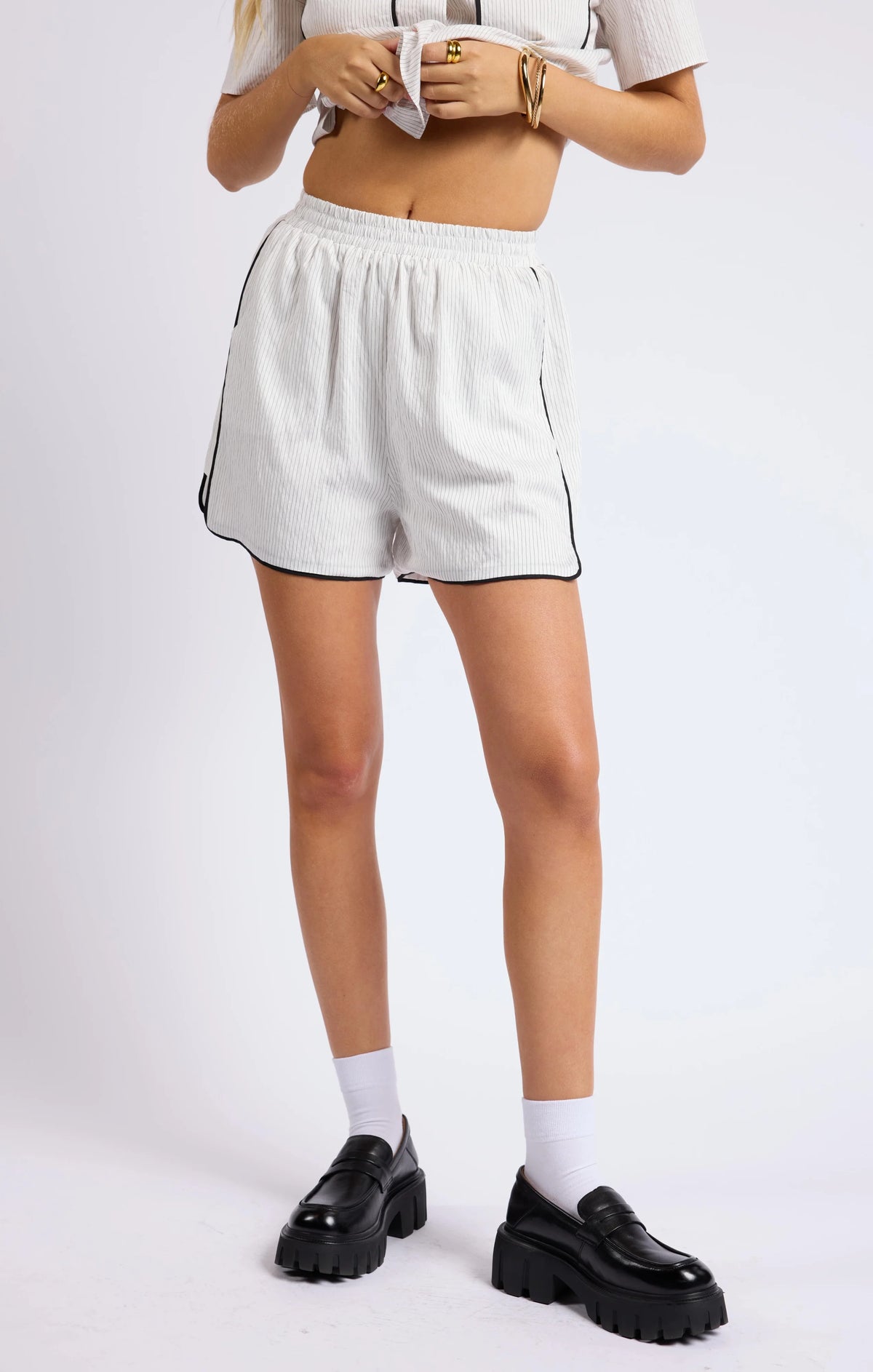 Unwind in style with Sage the Label Contrast Piping Shorts. These cozy shorts boast an elastic waist for the perfect fit and a playful striped design with eye-catching contrast piping. Perfect for a chill day or running errands, these shorts bring both comfort and trendiness to your wardrobe.