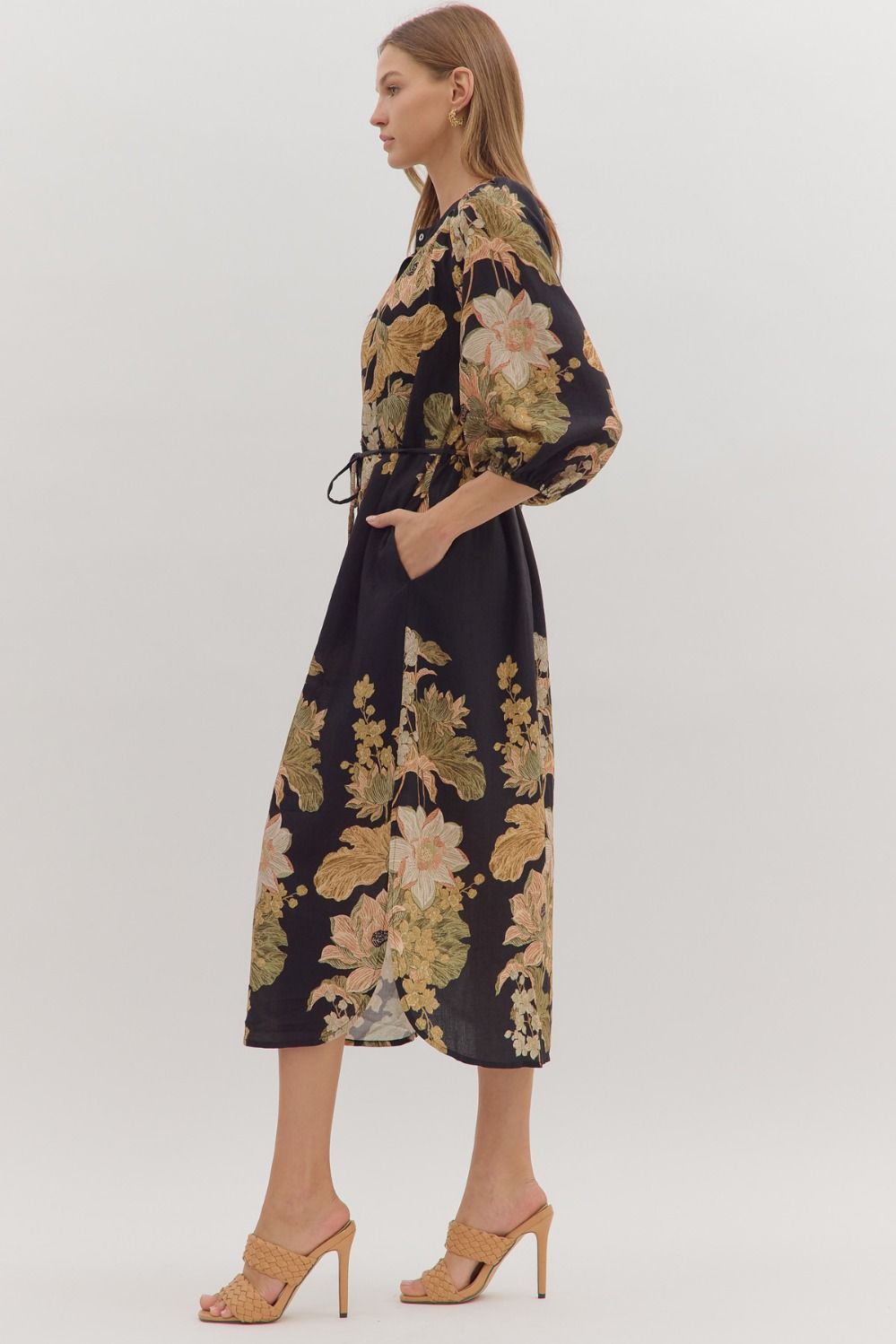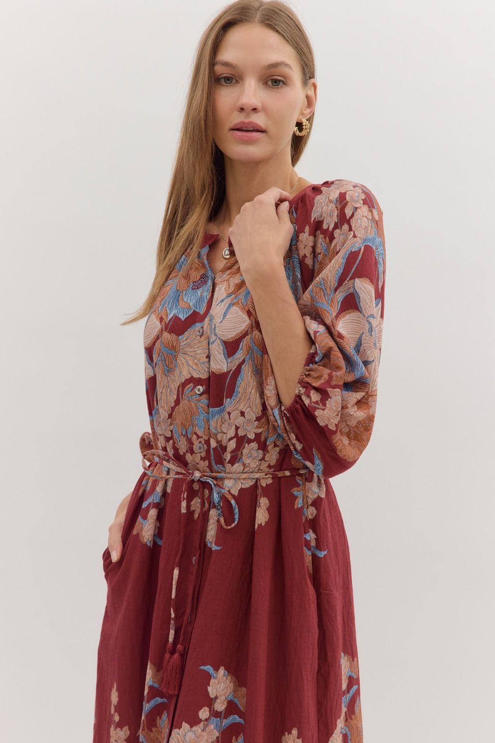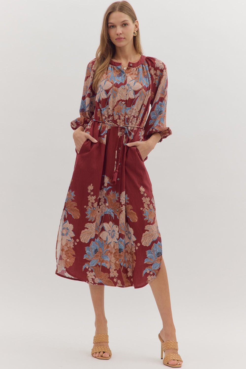 Romantic and effortless, the Wildflower Way Midi Dress is a timeless piece for the season. This floral print midi dress features long sleeves with elasticated openings, a button-front closure, and an adjustable drawstring waist for the perfect fit. Thoughtful details like side pockets and a full lining add both comfort and function. Soft, feminine, and easy to style, it’s the ideal dress for everything from brunch dates to fall festivities.