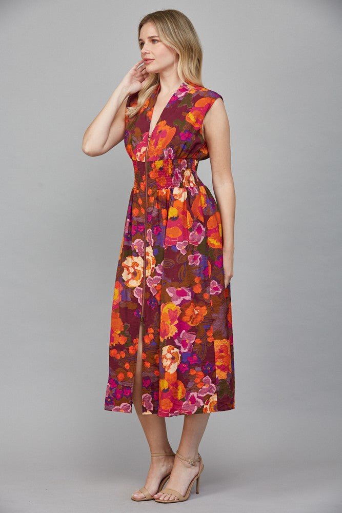 Stand out in style with the Vivid Bloom Zip Midi Dress, featuring a bold floral print that makes a statement. This sleeveless midi dress is designed with a flattering V-neckline and a sleek front zip closure for a modern, feminine edge. Perfect for special occasions or chic everyday wear, its vibrant print and structured silhouette bring confidence and color to any look.
