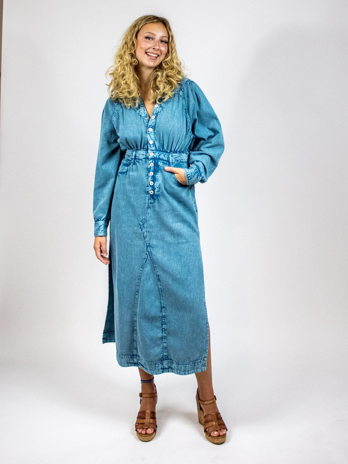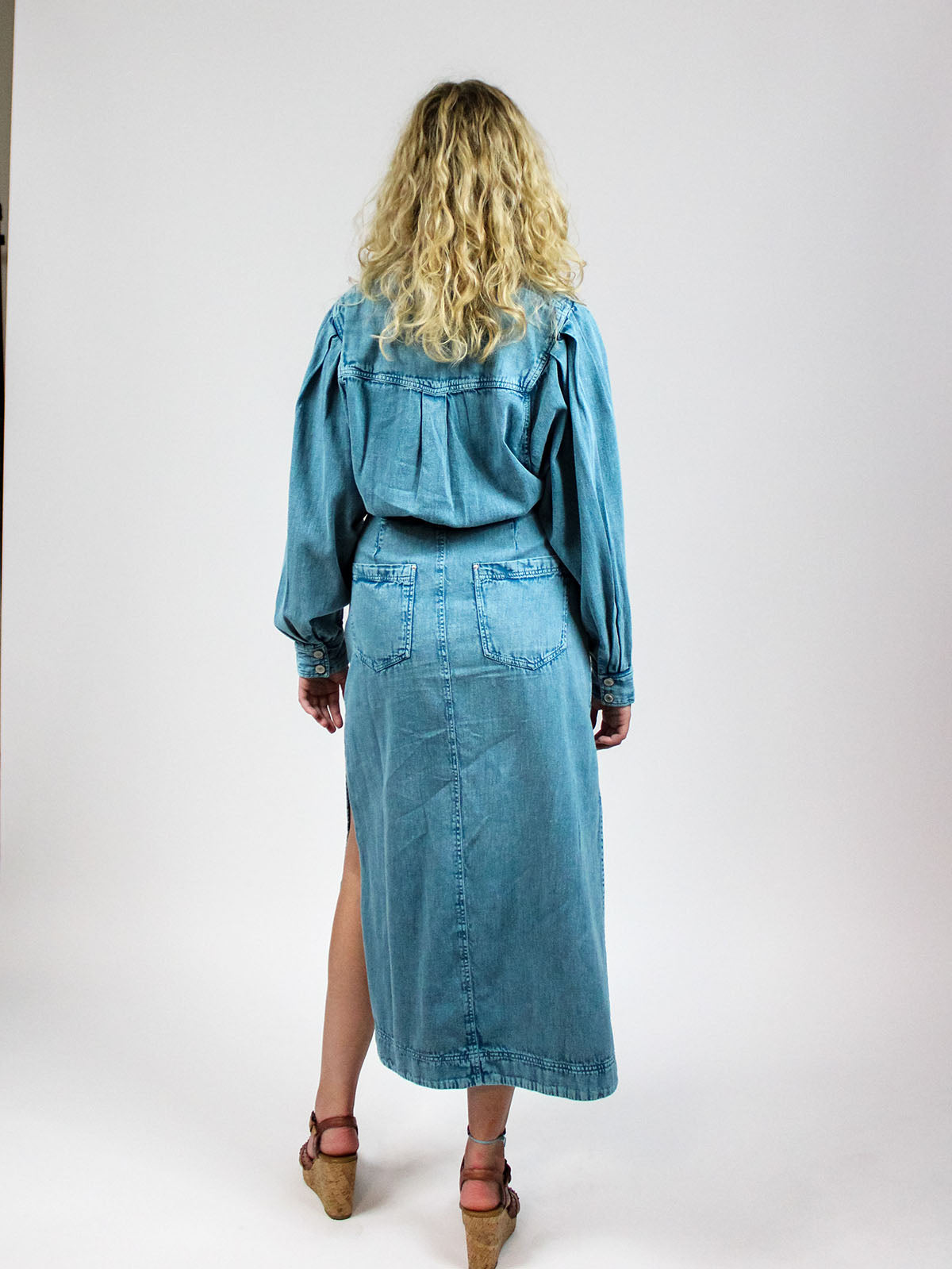 Introducing the Free People Mad Love Denim Midi Dress. Made to wear everywhere, this timeless midi is crafted from soft denim and features a classic shirt-inspired silhouette with a collared neckline and exaggerated side-slit detailing. With its shapeless silhouette and fitted waist detail, this midi offers versatile styling options. Perfect with a bold boot or cool sneakers, it's a must-have for any wardrobe.