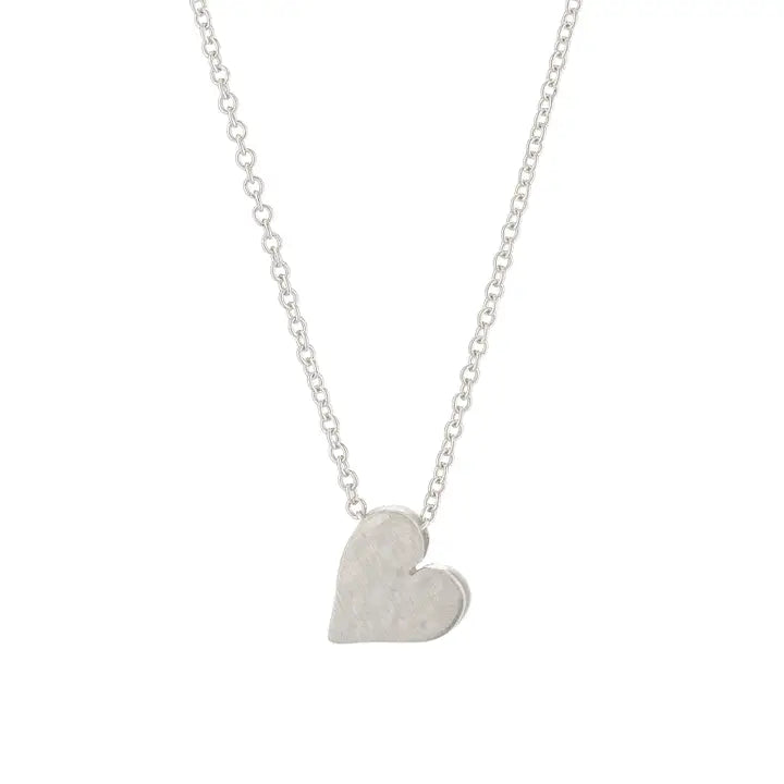 This necklace is a perfect balance of bold and delicate, with its mini but chunky hammered heart pendant. Made of silver with a lightly sanded finish, it adds a touch of whimsy to any outfit. Comes on a matching silver chain.