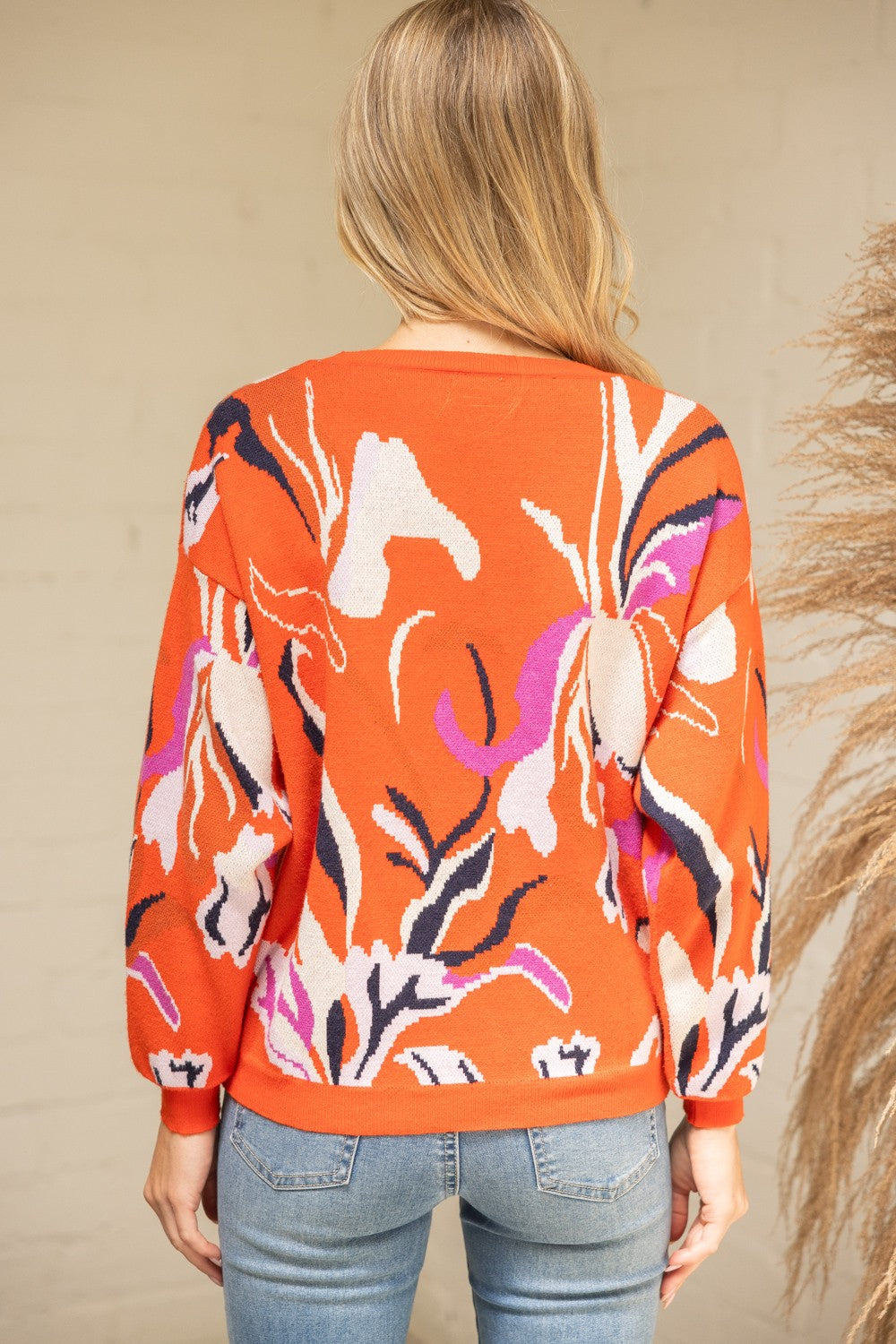 Embrace effortless fall style with the Cozy Blooms Oversized Sweater. This long sleeve sweater features a vibrant floral print on a soft, oversized silhouette, complete with a round neckline and ribbed knit cuffs, hem, and neckline for a polished finish. Perfect for layering or wearing on its own, it’s your go-to piece for cozy autumn days.