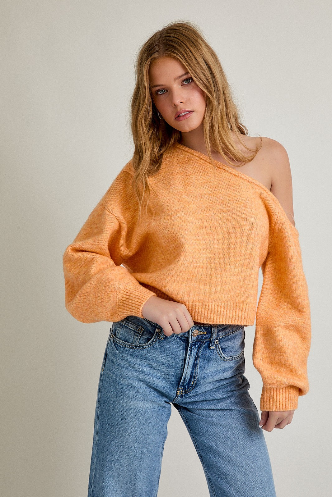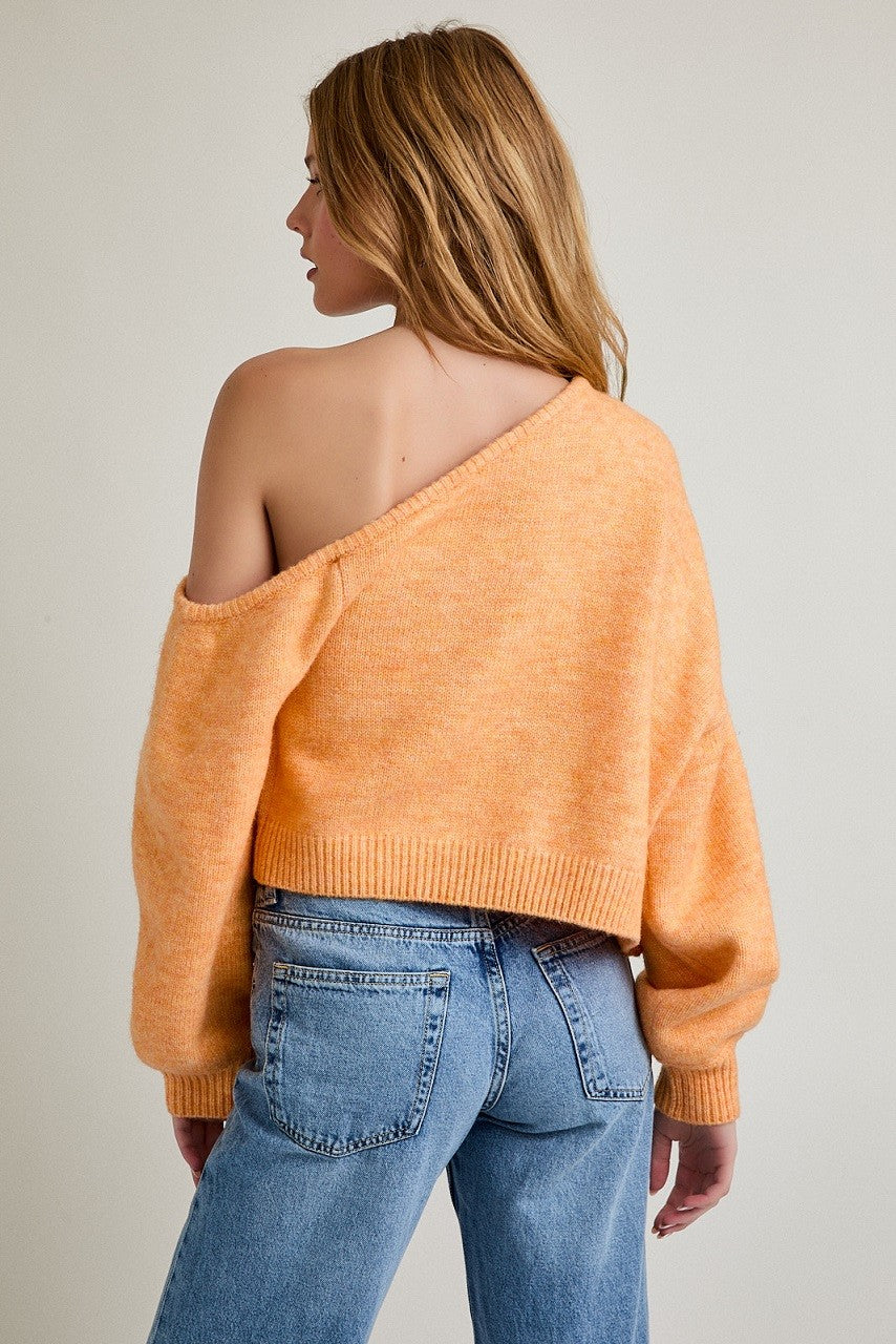 Add a flirty twist to your Vols gameday look with this asymmetrical shoulder sweater in a soft orange hue. Featuring a relaxed fit and cozy knit fabric, it’s the perfect mix of casual and chic. Pair it with denim for an effortlessly spirited outfit that stands out from kickoff to celebration!