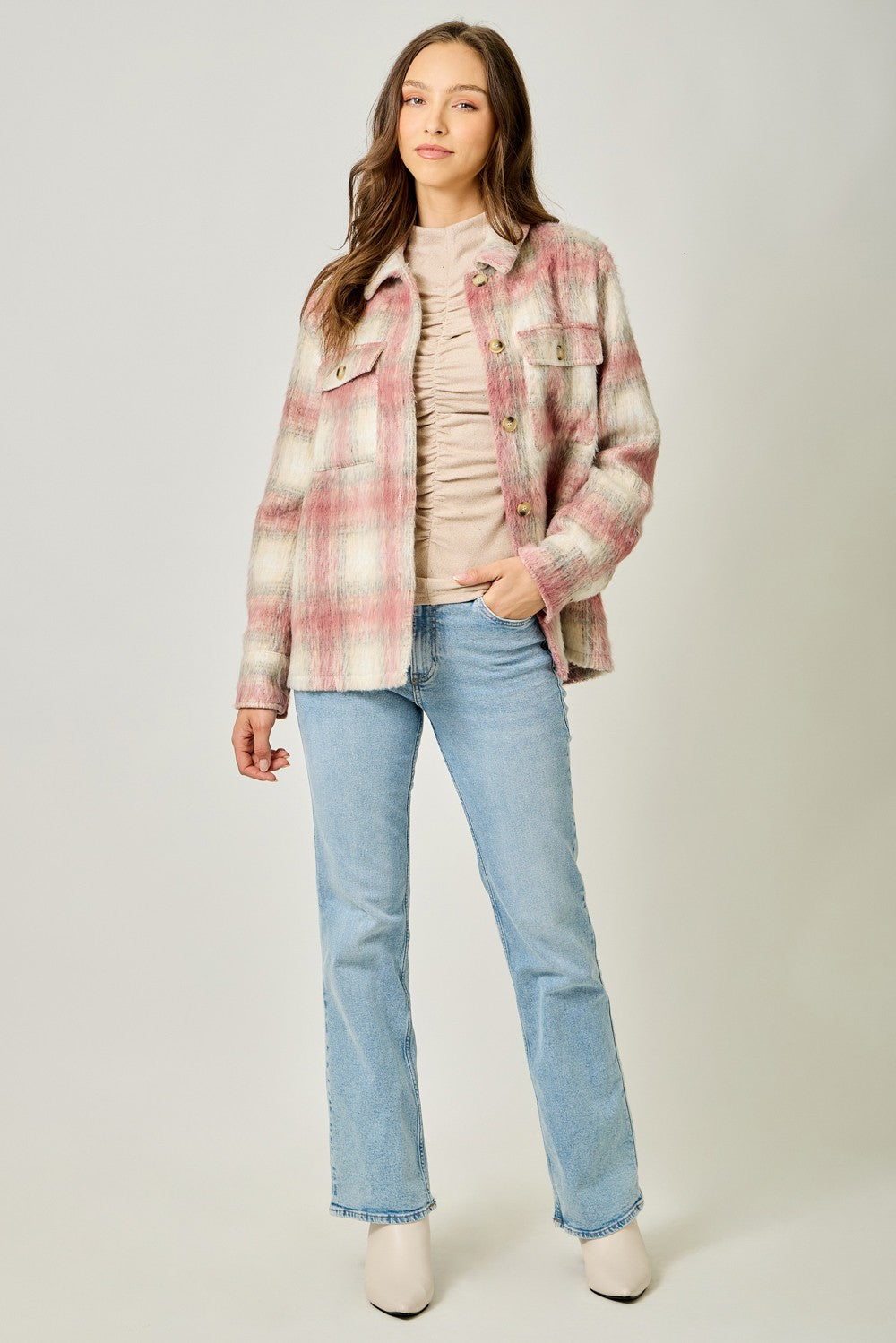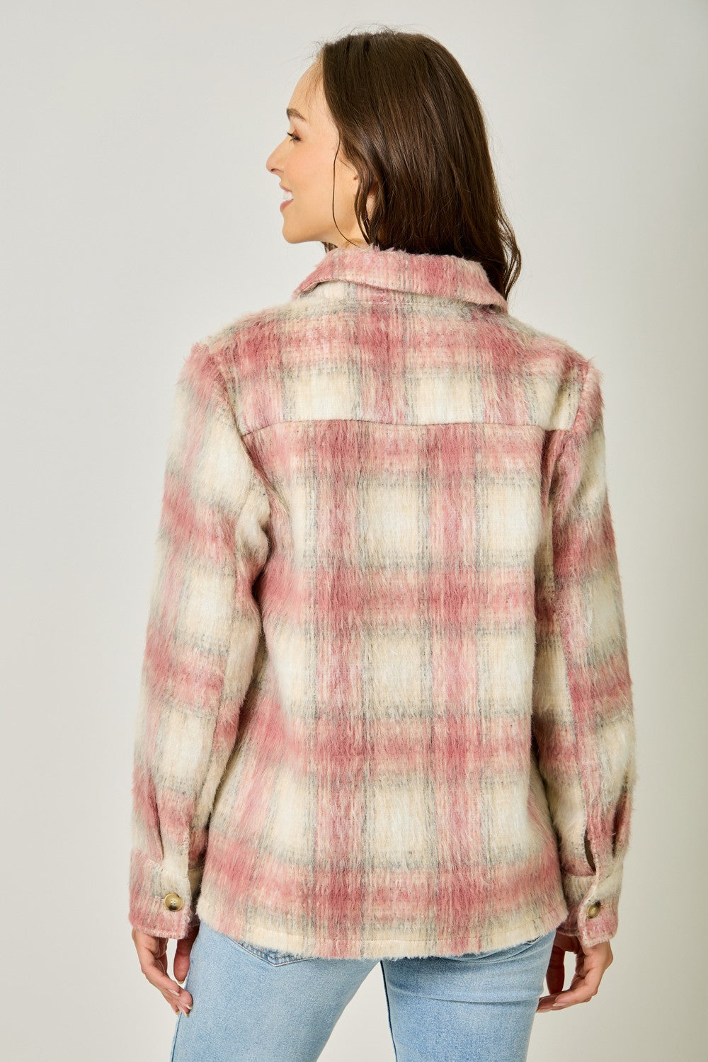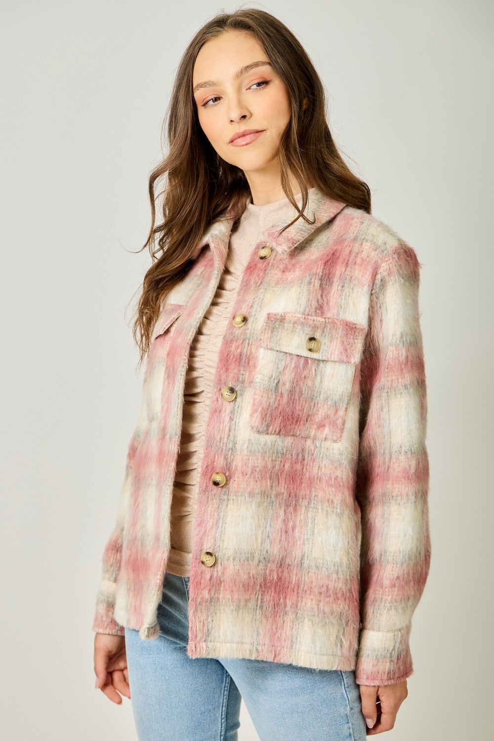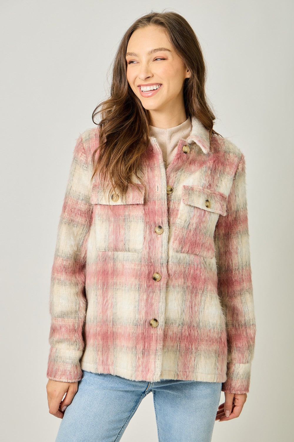 Stay warm in style with the Blushwood Plaid Fur Jacket. Featuring a soft cream-and-rose fur texture and classic button-down plaid design, this jacket combines cozy comfort with a feminine, fall-ready palette. Designed with chest pockets, long sleeves, and a relaxed fit, it’s perfect for layering over knits or tees for a chic, cold-weather look.