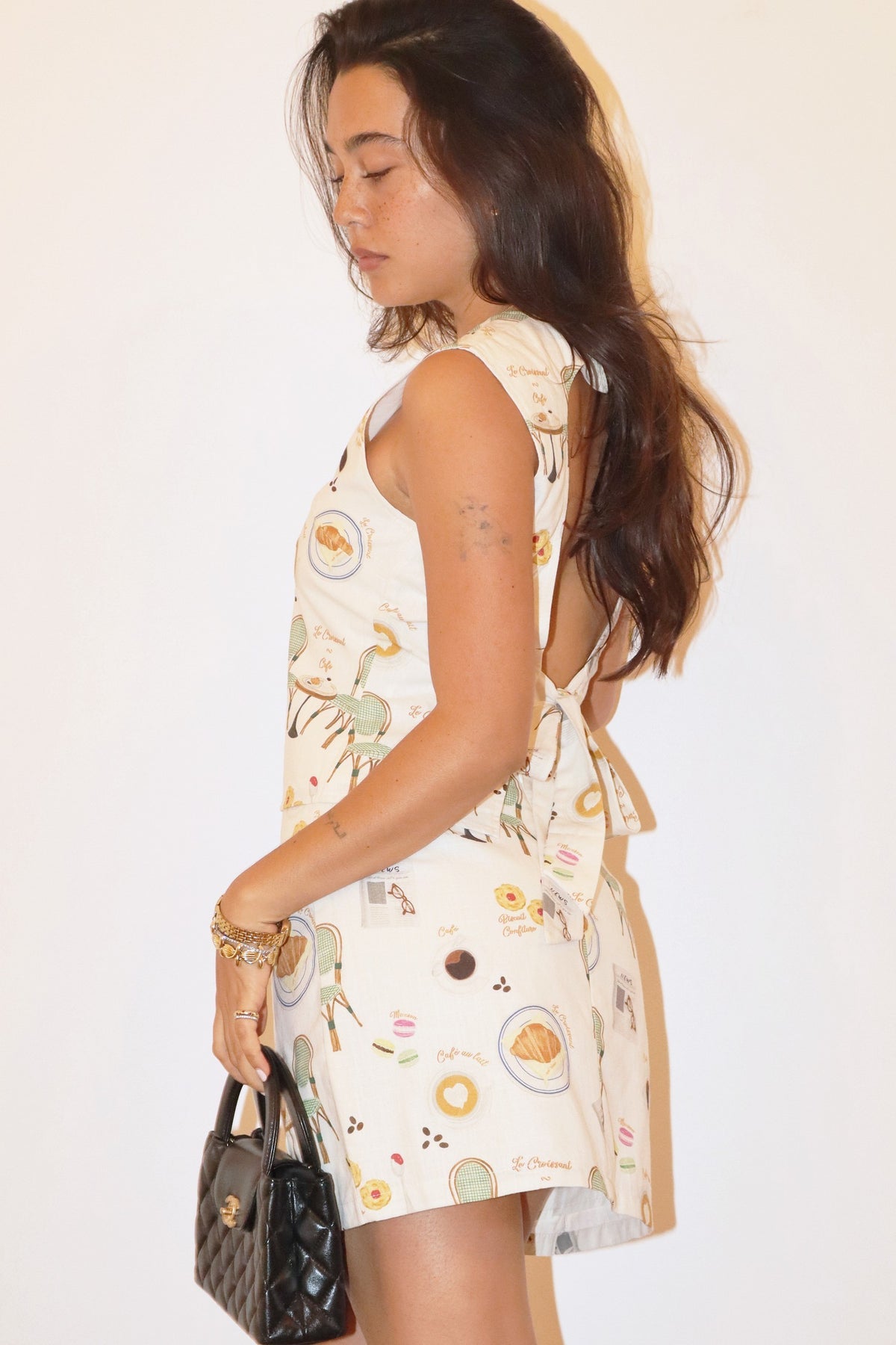 A love letter to leisurely mornings and sidewalk cafés. The Cafe Scene Top features a charming café-inspired print with croissants, coffee cups, and bistro chairs that instantly sets a playful, Parisian mood. Designed with a clean sleeveless front and a statement open back, it ties delicately at the waist for a flattering, adjustable fit. Lightweight and easy to wear, this top pairs perfectly with the matching skirt or your favorite denim for an effortlessly styled look. Equal parts sweet and statement-making, it’s made for coffee dates, sunny strolls, and everything in between.