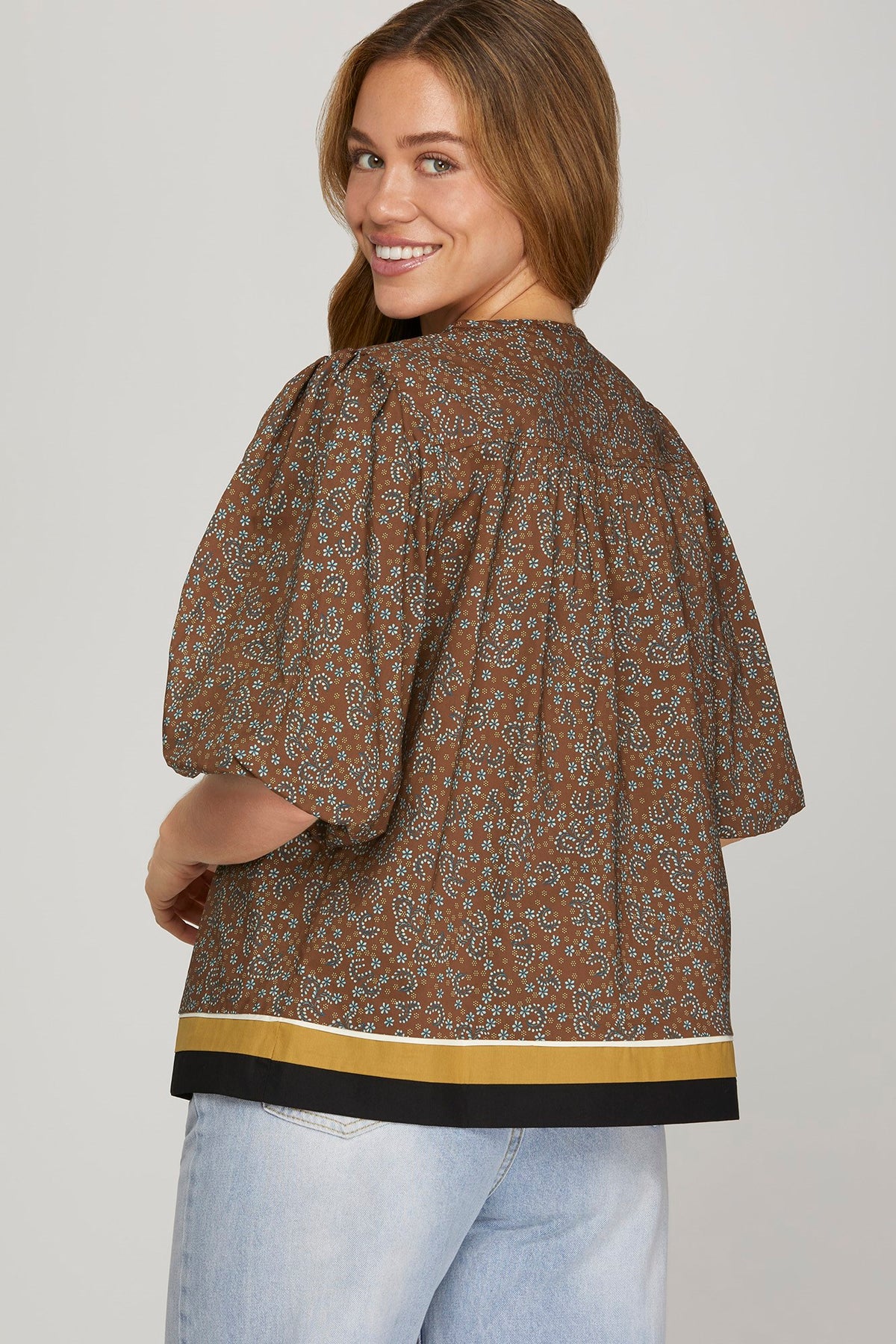 Bring cozy charm to your fall wardrobe with the Harvest Hues Puff Sleeve Top. Featuring a flattering V-neck and voluminous puff sleeves, this printed woven top is elevated with a striking color-block hem for a modern twist. Lightweight and versatile, it pairs beautifully with denim, skirts, or tailored pants—making it a go-to piece for crisp autumn days and layered seasonal looks.