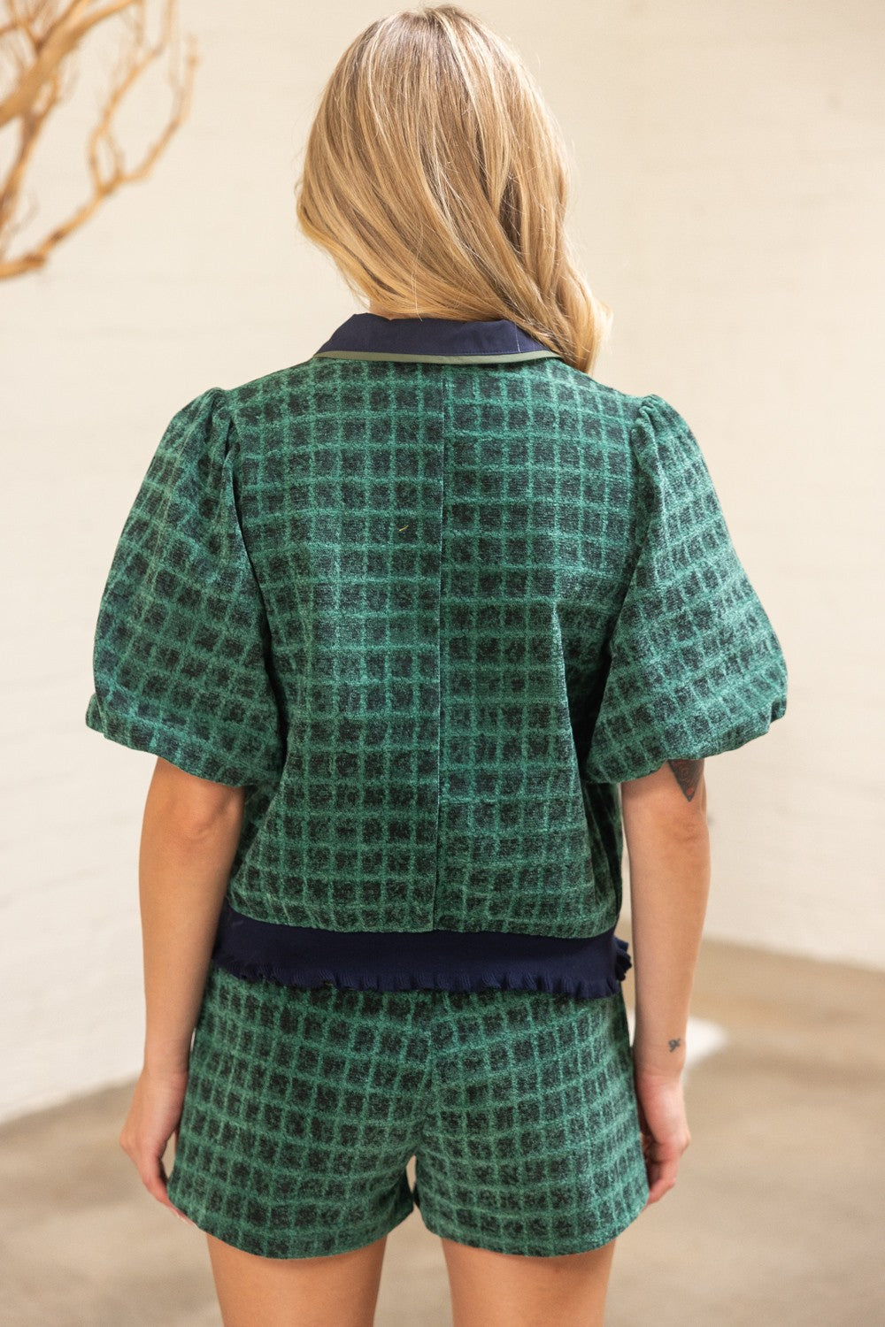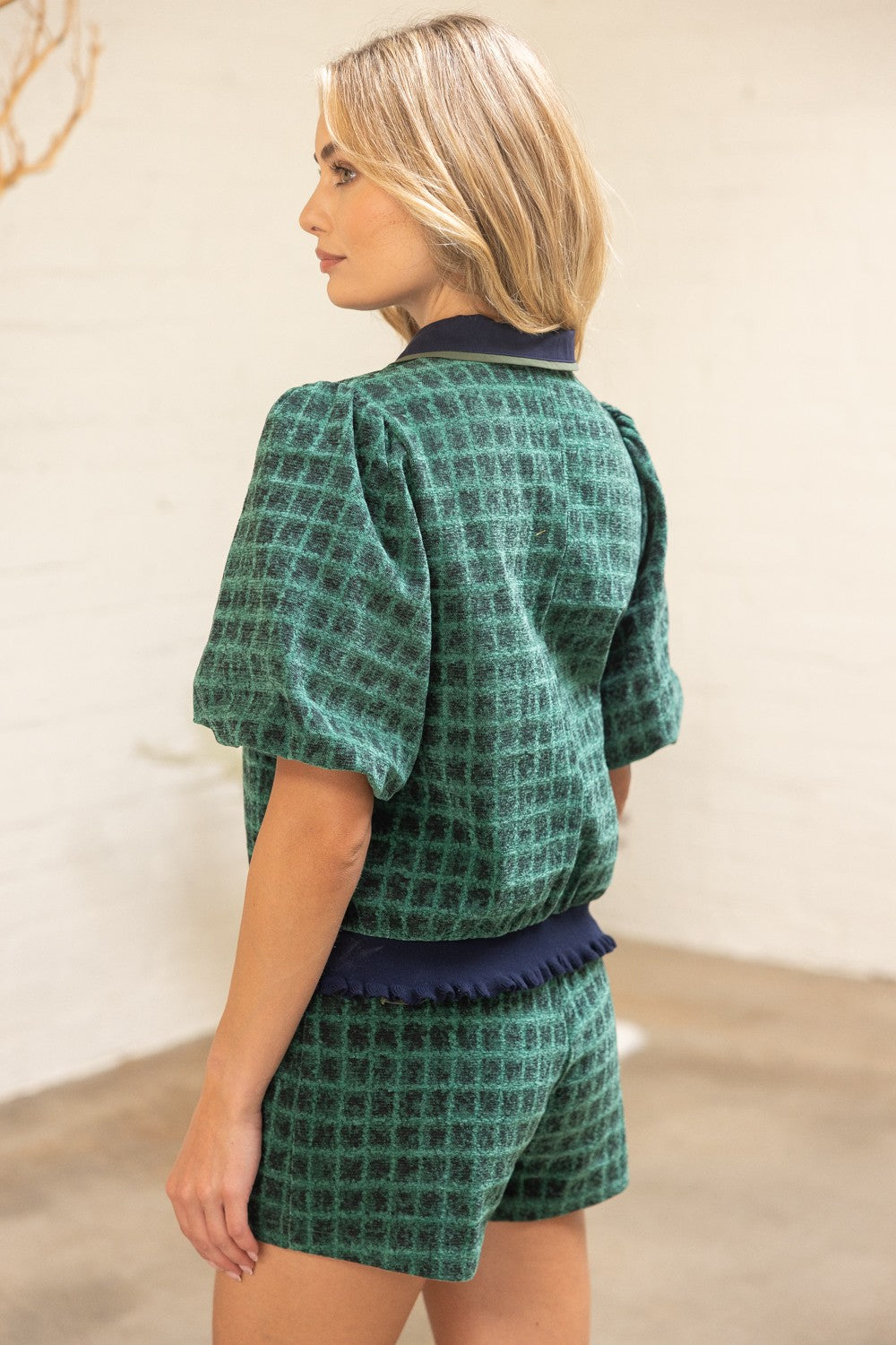 Add a touch of classic charm to your fall wardrobe with this green plaid top featuring subtle navy accents. The contrast collared V-neckline and solid placket create a polished look, while short bubble sleeves add playful volume. Finished with a ruffle ribbed knit hem for a flattering fit, this plaid woven top blends timeless style with cozy, seasonal appeal.