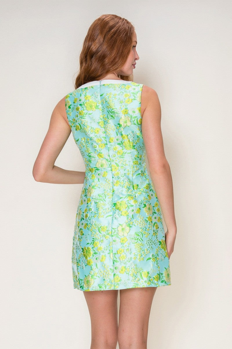 Step into a garden of style with this enchanting sleeveless mini dress. A chic keyhole neckline is elegantly accented with two delicate white bows, adding a touch of playful sophistication. The A-line silhouette flatters the figure, creating a timeless and feminine look perfect for any cocktail party or celebratory occasion. Crafted from a textured brocade fabric, this dress offers a subtle sheen and a luxurious feel. It's a delightful choice for those who appreciate vintage-inspired fashion with a modern twist, promising to make you feel radiant and stylish at any event.