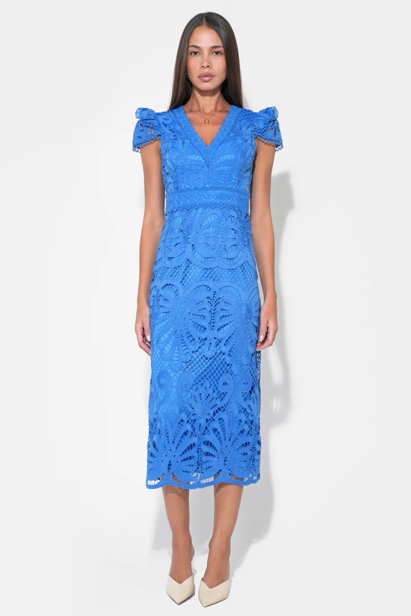 Rendered in the serene and sophisticated Cornelia Blue, this dress is a masterclass in delicate detailing. It features an exquisite all-over daisy floral lace that breathes life into a timeless silhouette. The design is elevated by feminine cap sleeves and intricate scalloped edges along the neckline and hem, adding a touch of vintage-inspired elegance.