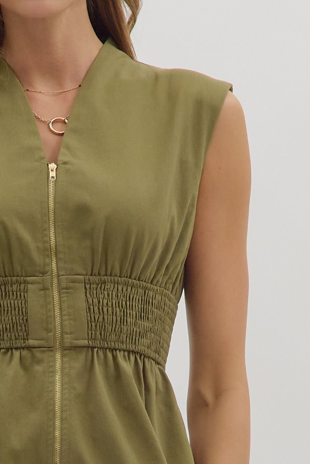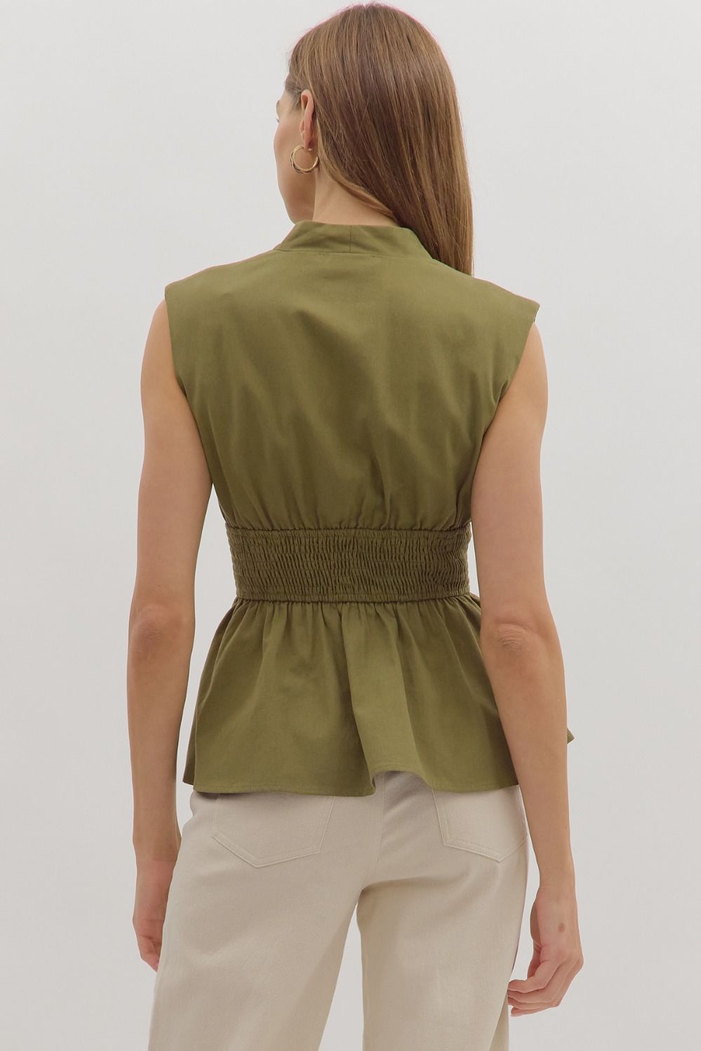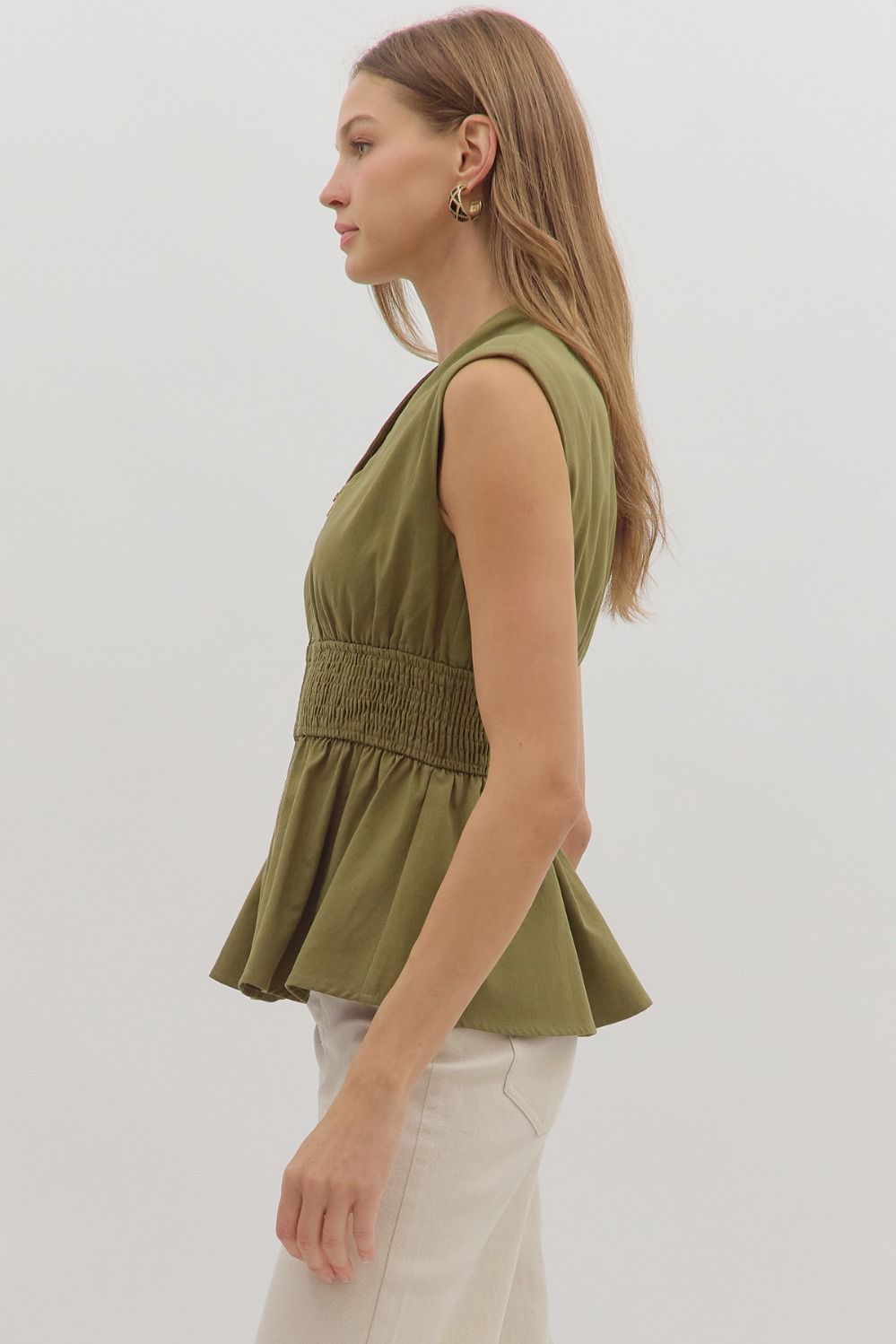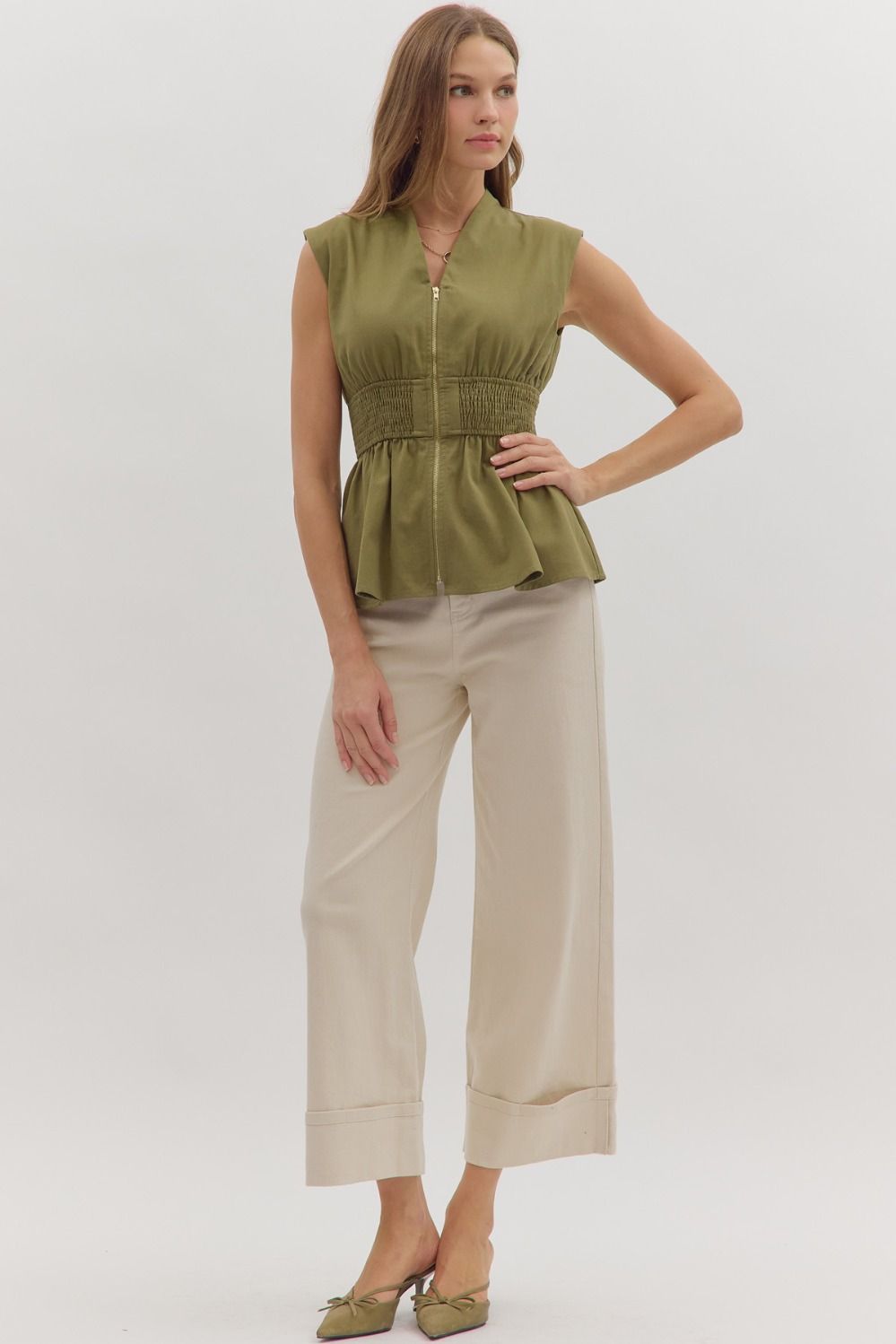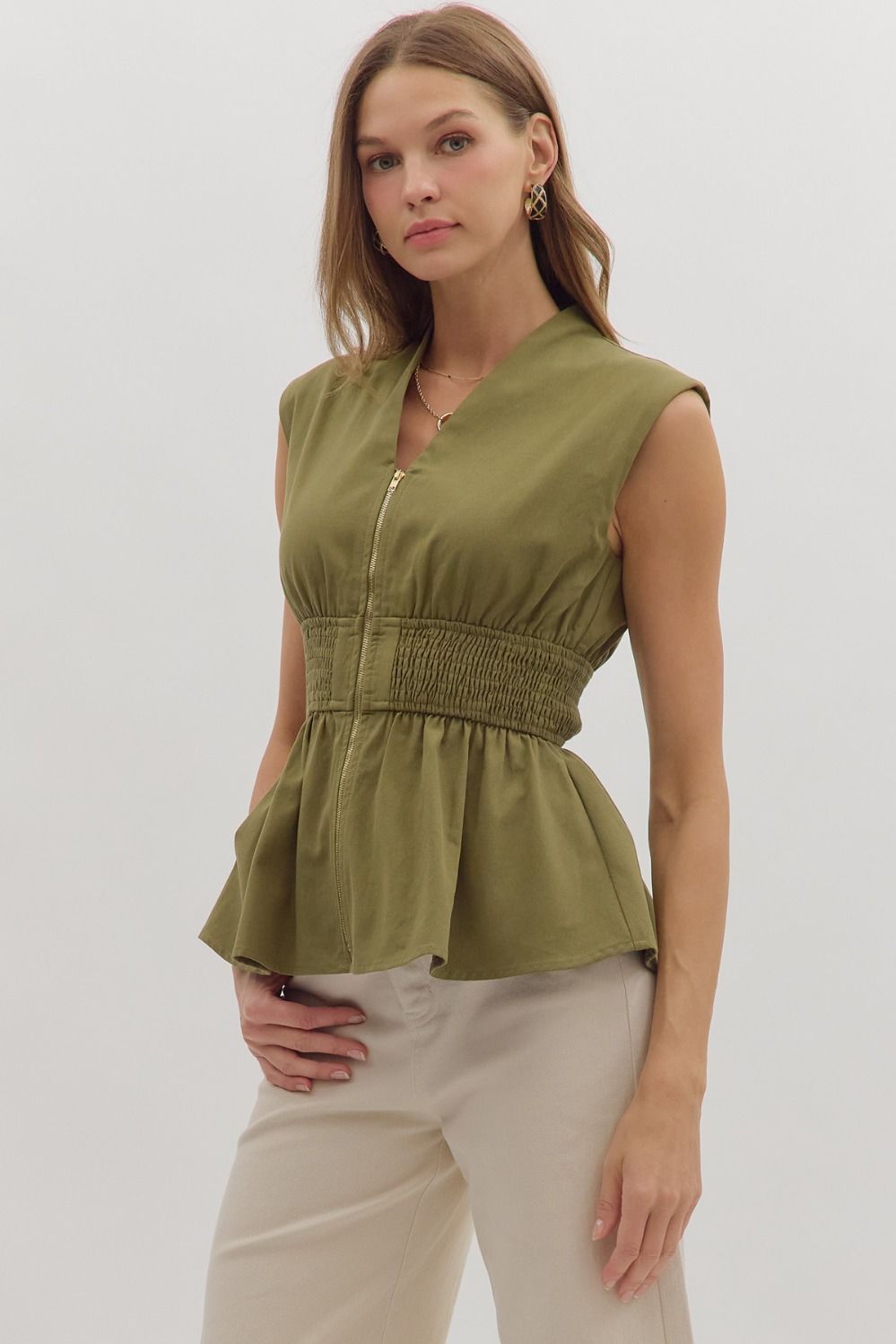 This playful denim peplum top is sleeveless and showcases a wide smocked waist with a front zipper. Crafted from lightweight woven fabric, it’s unlined and not see-through, perfect for adding fun flair to any outfit.