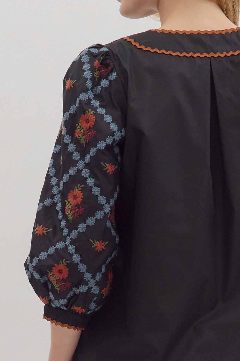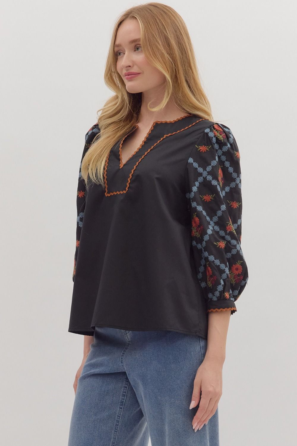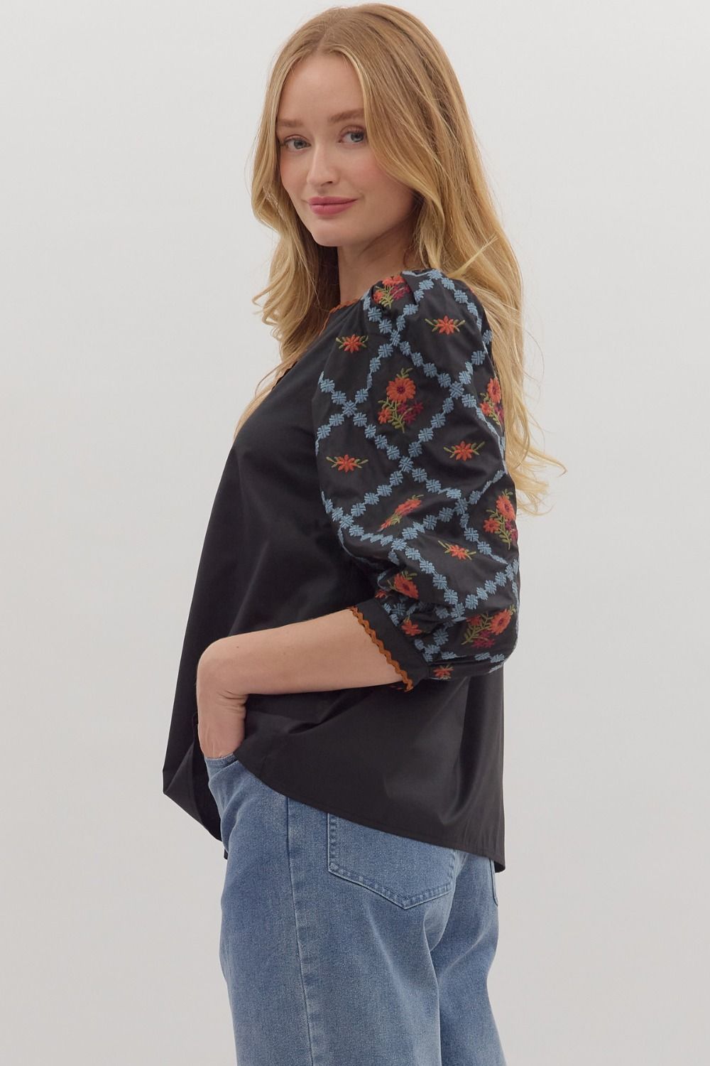 Delicate details meet timeless style in the Autumn Grace Embroidered Top. This pullover blouse features elegant embroidery throughout and 3/4 sleeves for a refined, feminine look. The contrast scallop trim along the neckline adds a charming touch of texture, perfect for elevating your everyday fall wardrobe. Effortless to style and comfortable to wear, this top pairs beautifully with denim, skirts, or tailored pants for any autumn occasion.