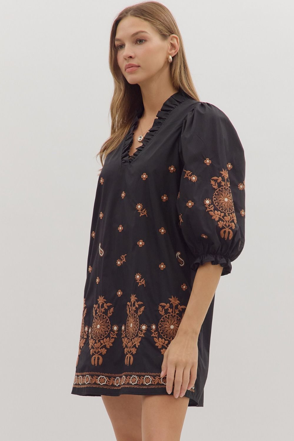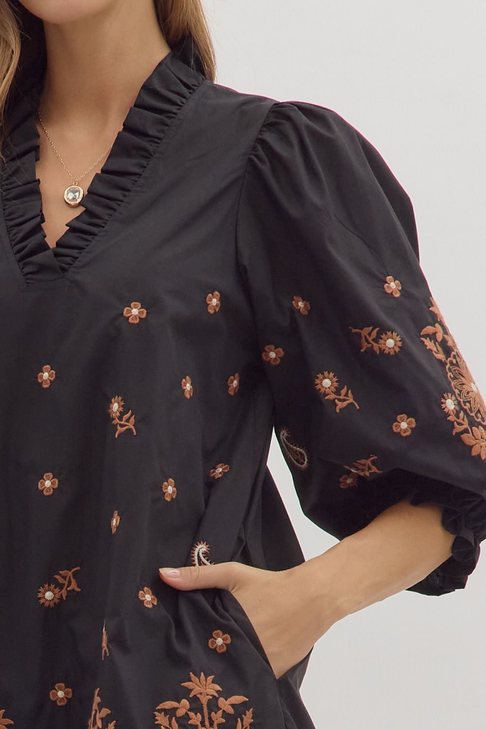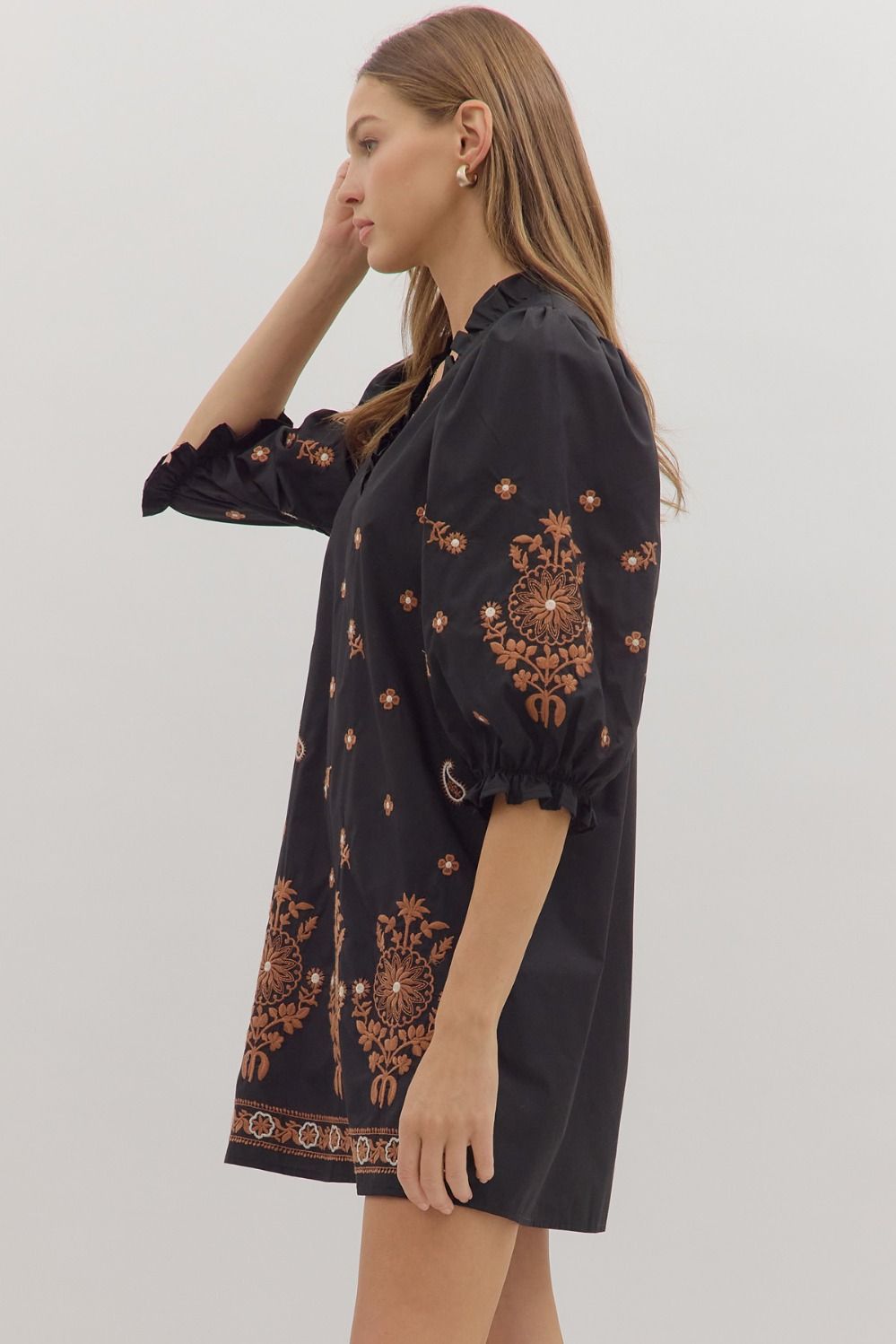 Effortlessly charming and fall-ready, the Autumn Bloom Embroidered Mini Dress features delicate floral embroidery on a soft woven fabric. Designed with 3/4 puff sleeves, an elasticated opening, and a ruffle-trim V-neckline, this mini brings a touch of romance to your seasonal style. Finished with handy side pockets and a comfortable lining, it’s the perfect piece for cozy gatherings or a crisp fall day out.