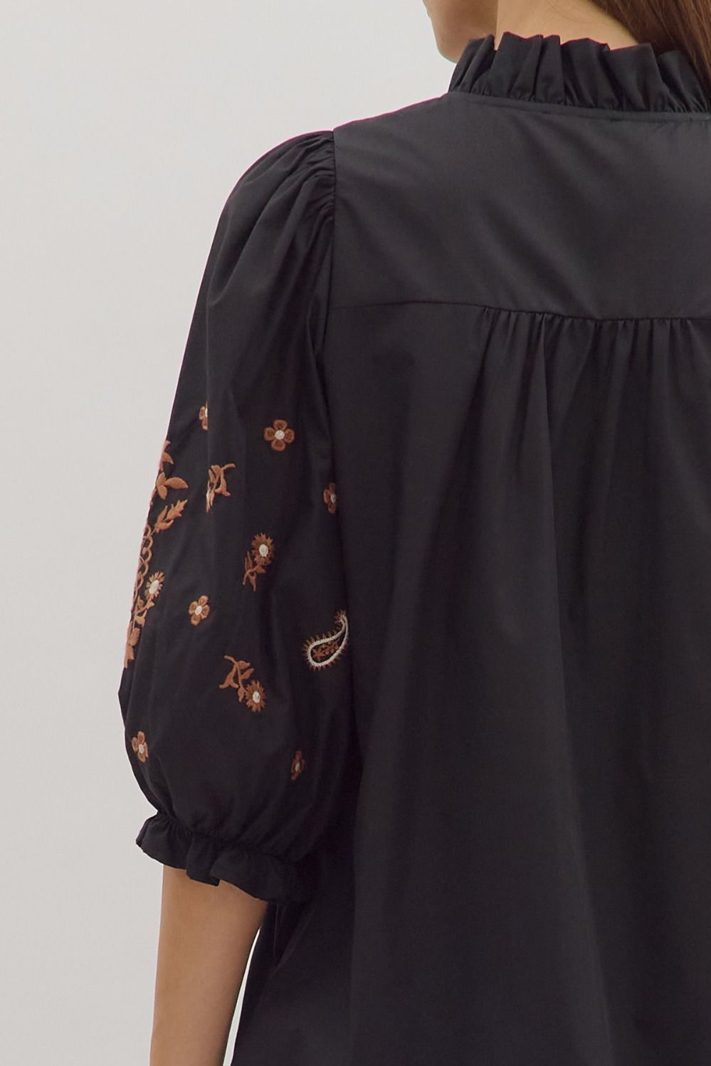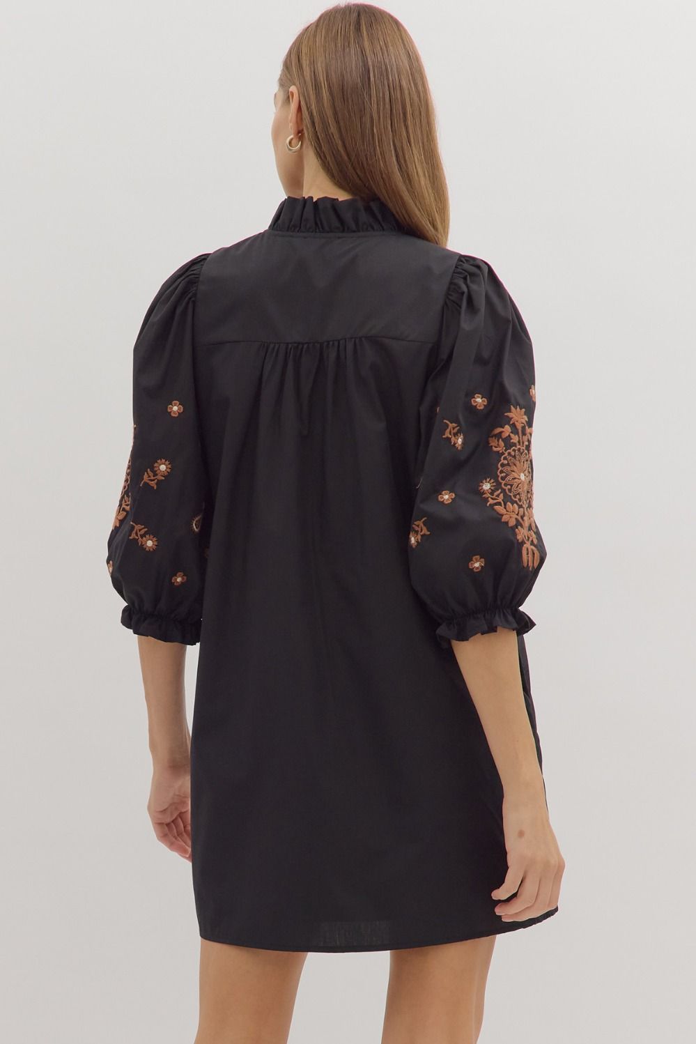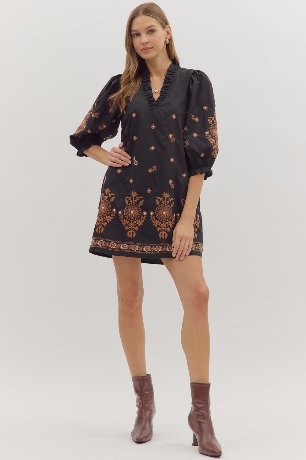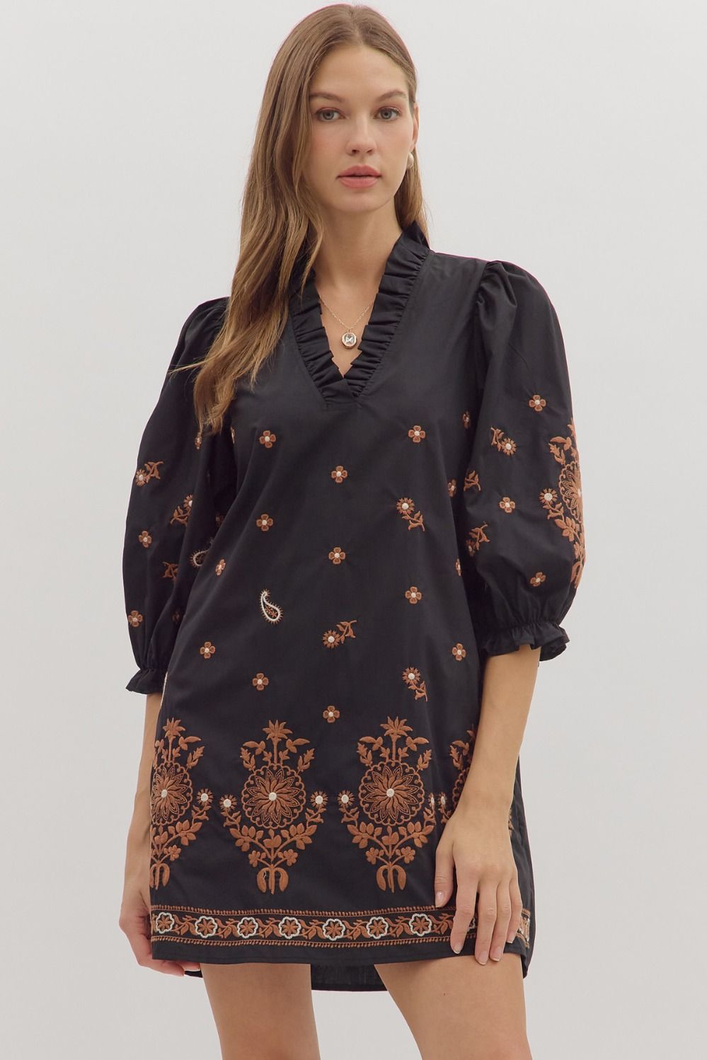 Effortlessly charming and fall-ready, the Autumn Bloom Embroidered Mini Dress features delicate floral embroidery on a soft woven fabric. Designed with 3/4 puff sleeves, an elasticated opening, and a ruffle-trim V-neckline, this mini brings a touch of romance to your seasonal style. Finished with handy side pockets and a comfortable lining, it’s the perfect piece for cozy gatherings or a crisp fall day out.