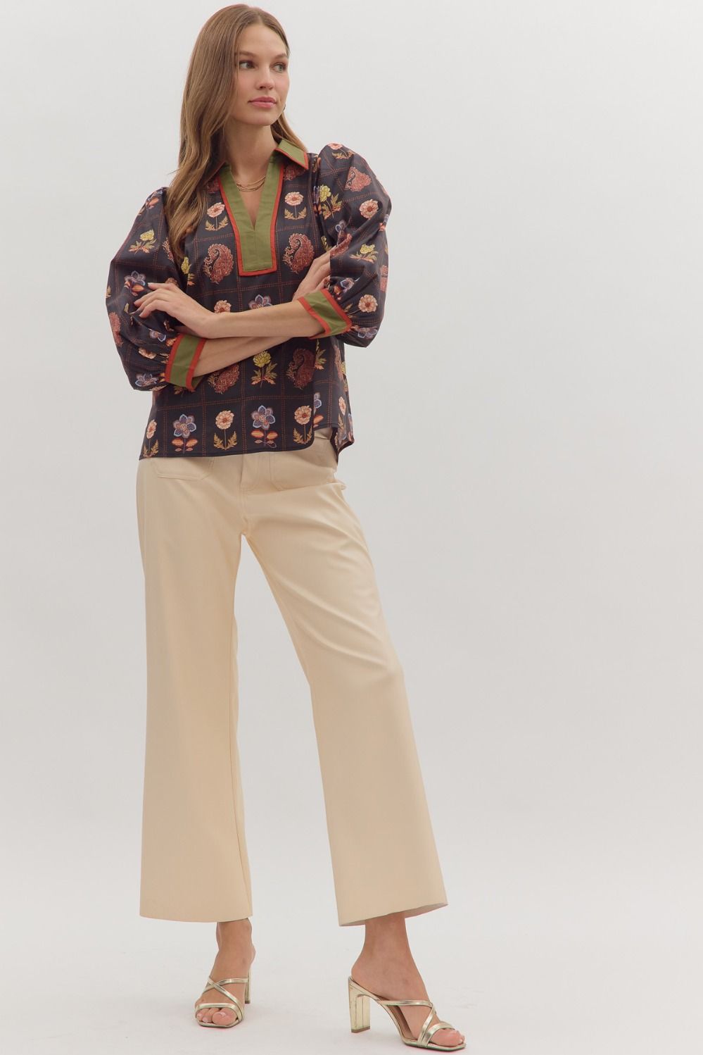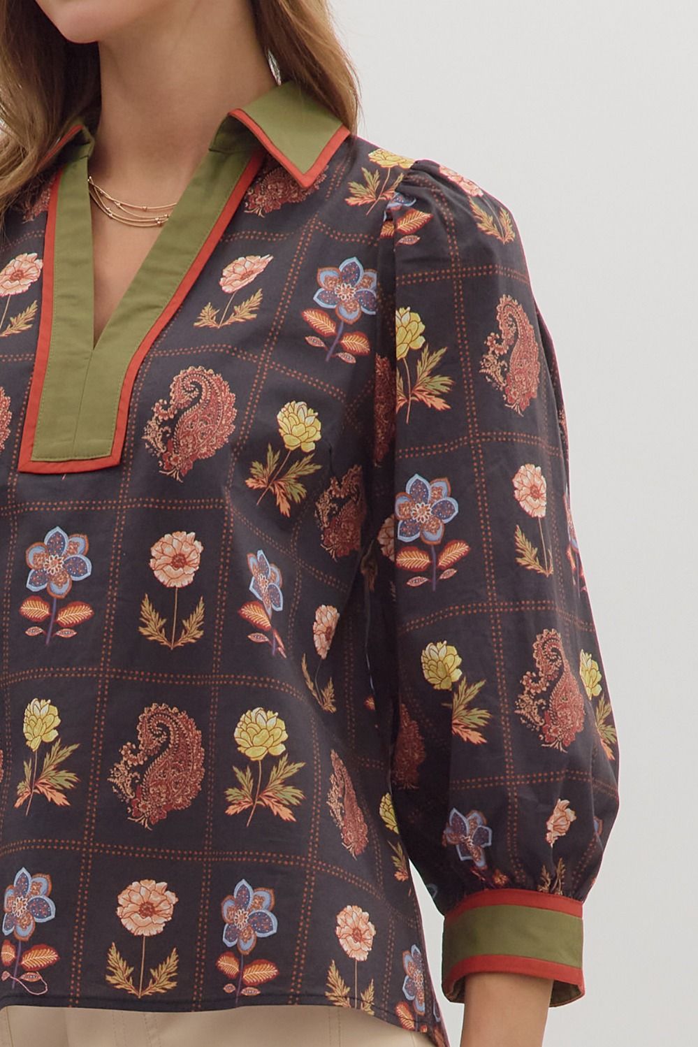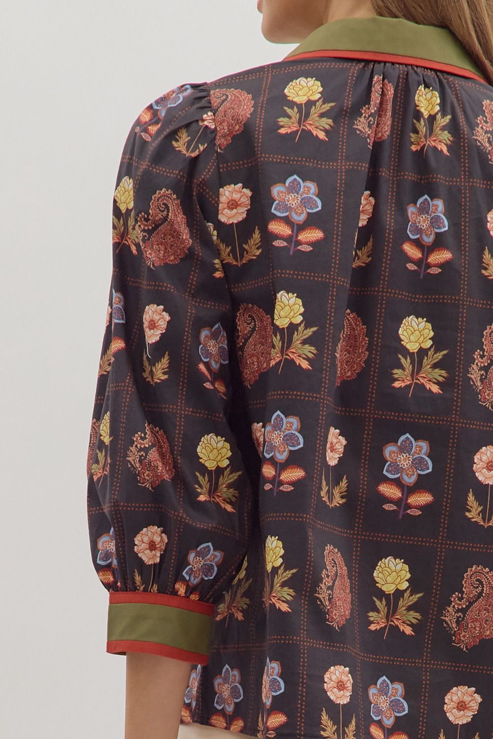 Fresh florals meet effortless elegance in the Harvest Bloom Puff Sleeve Top. This lightweight woven blouse features a charming floral print and 3/4 puff sleeves for a feminine touch. The contrast collar and V-neck band add a pop of detail, creating a perfect balance of classic and modern style. Unlined and non-sheer, it’s an easy, breathable piece to pair with jeans or skirts for a polished fall look.