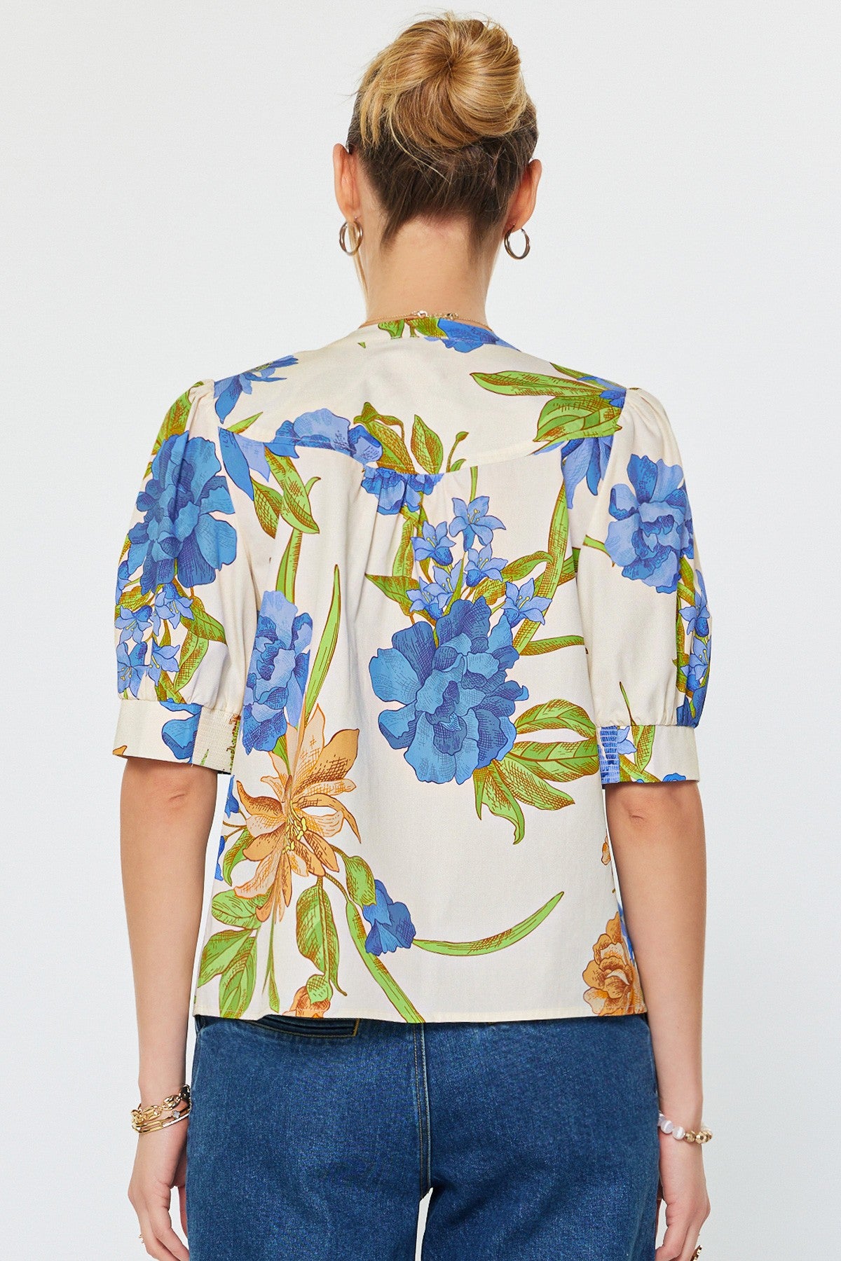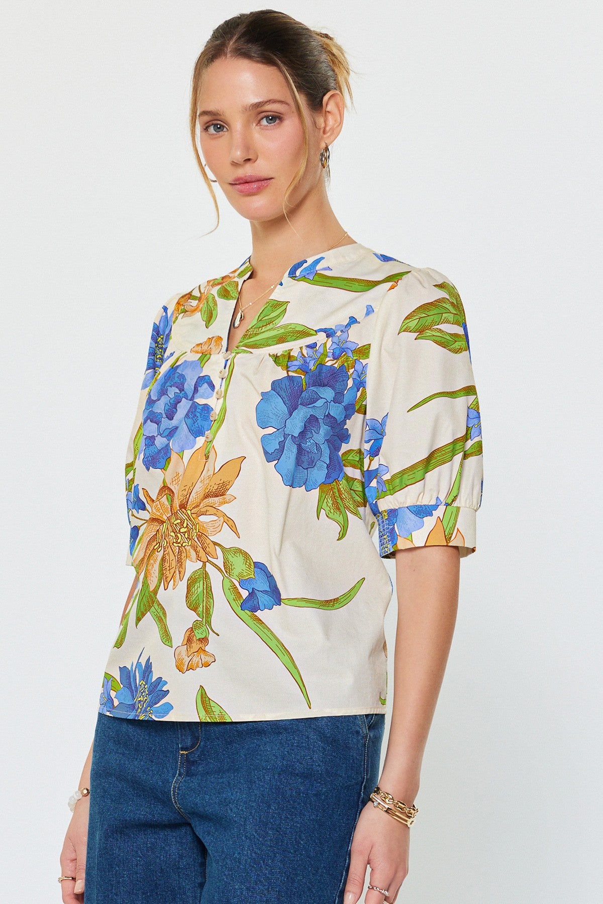Fresh and effortlessly polished, the Botanical Breeze Floral Blouse features a vibrant digital botanical print that brings a pop of color to your everyday wardrobe. Designed with a flattering split neckline accented by delicate shell shank buttons, this top also features short puff sleeves with smocked cuffs for a soft, feminine finish. The gathered yoke detail and relaxed fit create an easy, flowy silhouette that pairs perfectly with denim, shorts, or tailored trousers for a chic everyday look.