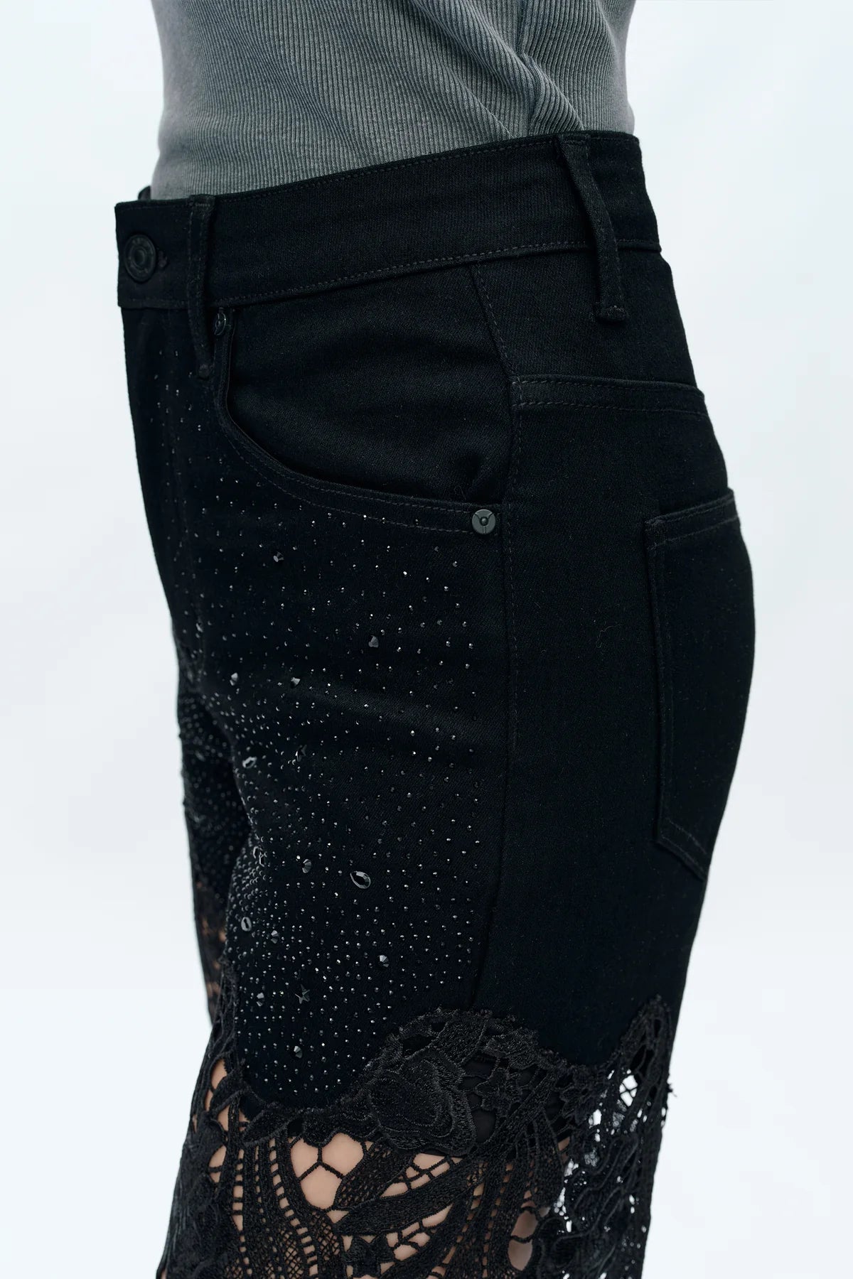 These high-rise wide-leg jeans are where bold meets beautiful. Sheer lace panels and sparkling rhinestone embroidery transform a denim classic into a statement piece that demands attention. The ultra-stretch fabric moves with you, while the five-pocket design keeps things timeless. Zip closure, endless compliments.