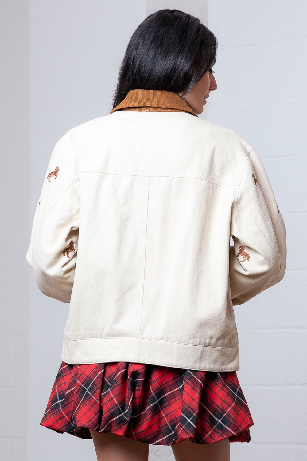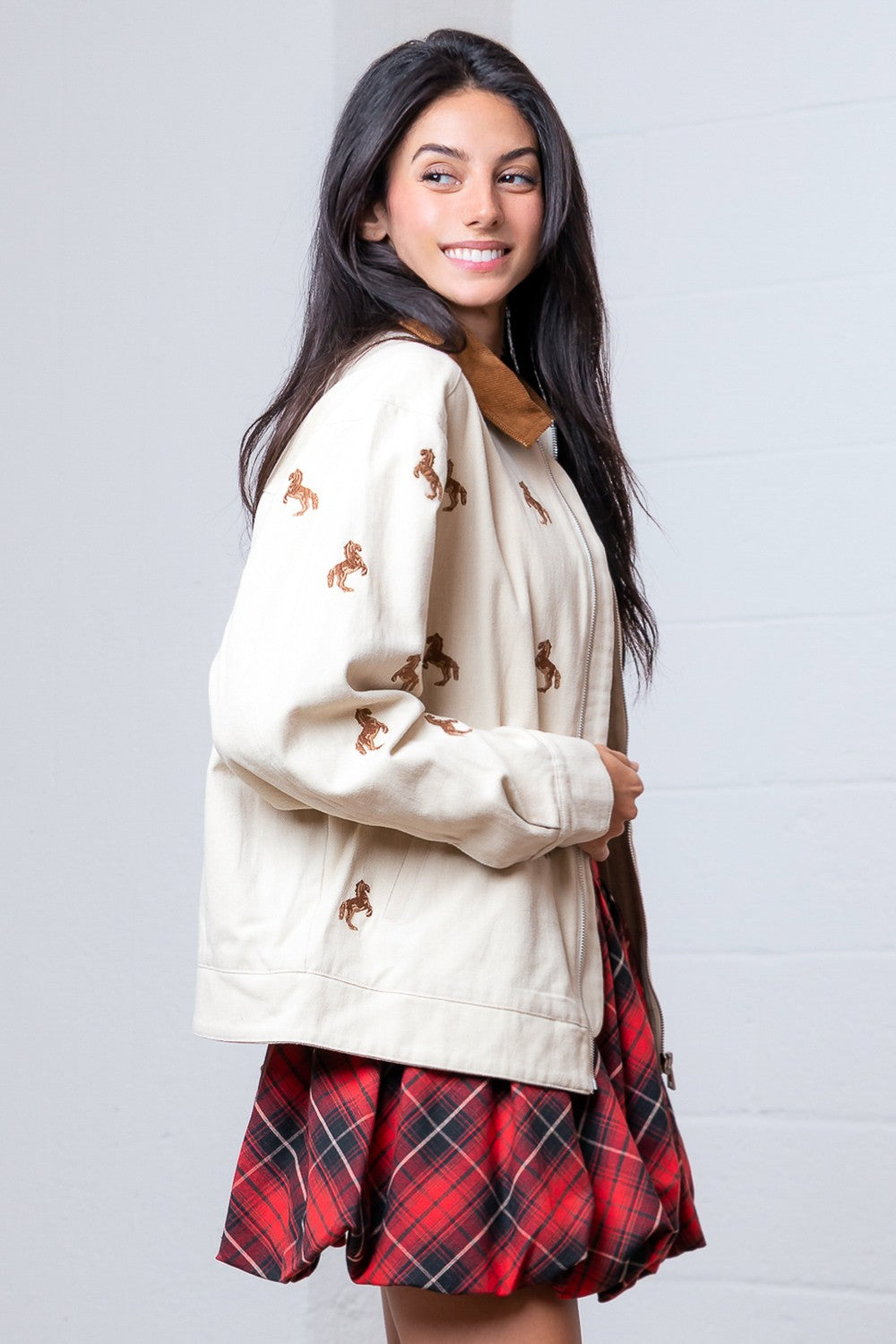 This brown textured jacket brings a playful twist to your wardrobe with its charming horse embroidery detail. Featuring a relaxed fit, long sleeves, and a contrasting collar, it zips up easily for a cozy yet stylish look. Perfect for adding a touch of equestrian flair to any casual outfit.