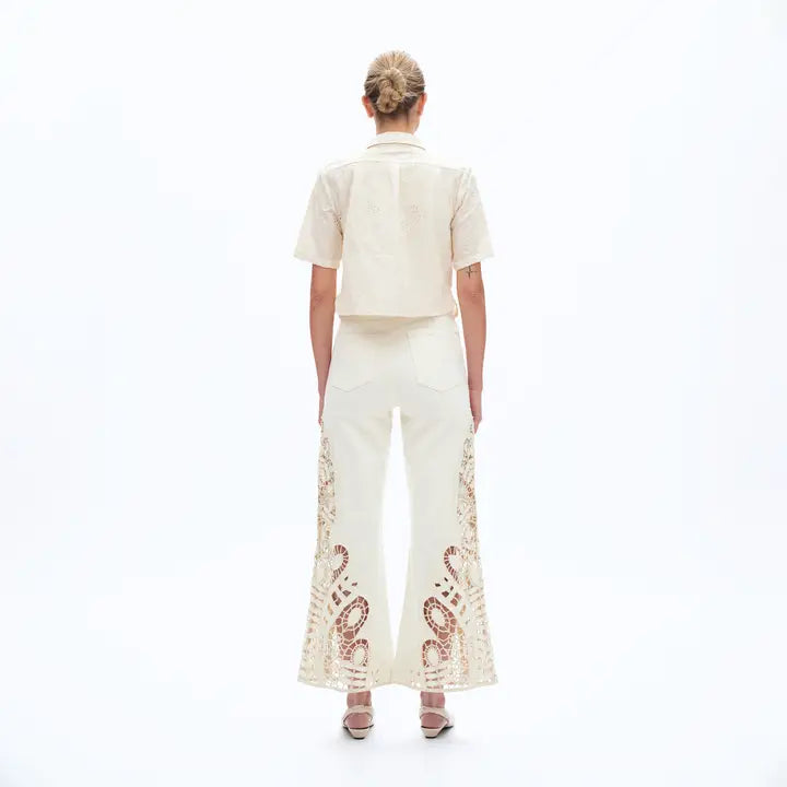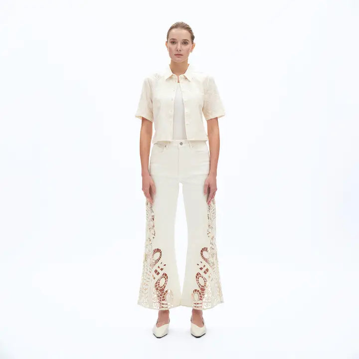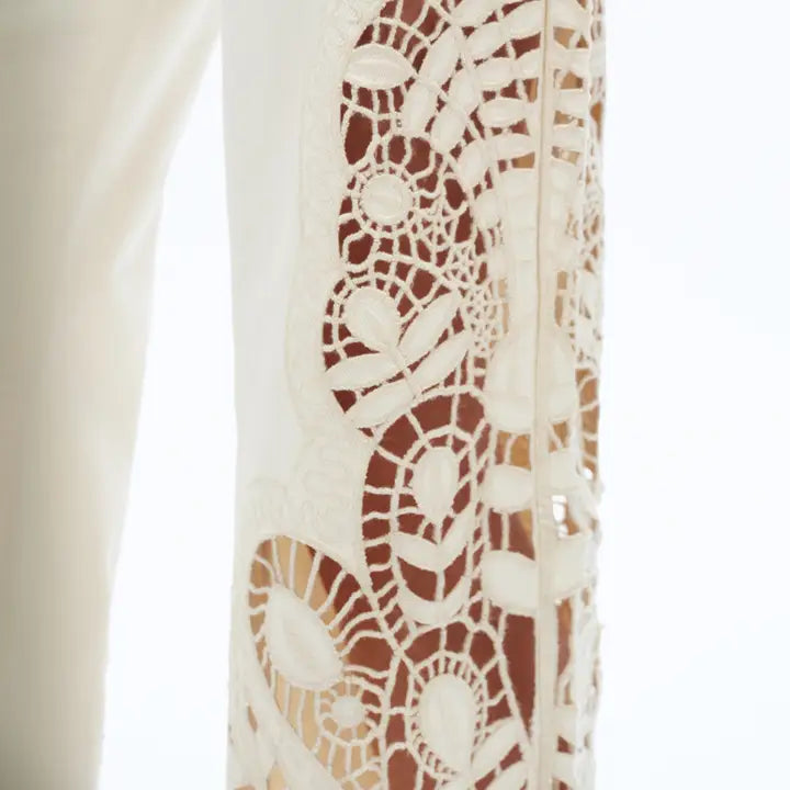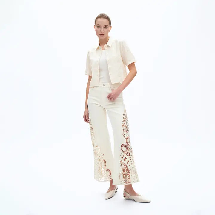 Elevate your everyday style with the Meadow Breeze Wide Leg Pants, a chic blend of structure and softness. Crafted from comfort stretch twill in a versatile beige hue, these high-rise pants feature five functional pockets, a zipper fly, and a flattering wide-leg silhouette. Delicate floral cutout embroidery adds a feminine touch, while the raw hem keeps the look modern and relaxed. Perfect for pairing with sweaters, blouses, or tees, these pants transition effortlessly from casual days to dressed-up occasions.