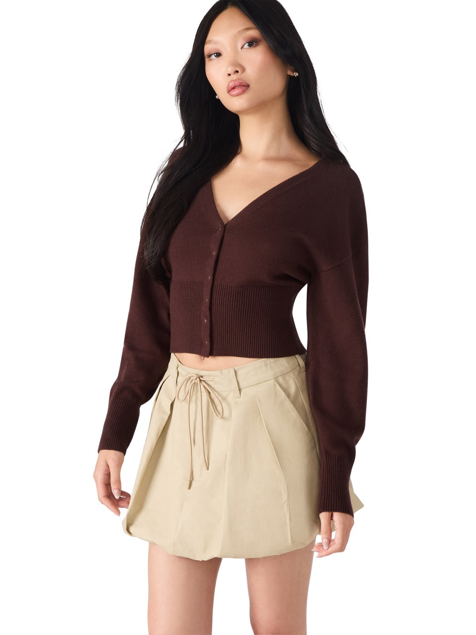 This cropped cardigan brings cozy charm with a playful twist. Featuring a deep V-neckline and a fitted cut, it hugs your silhouette just right. The delicate button front adds a sweet touch, making it ideal for layering or rocking on its own for a fun, flirty vibe.
