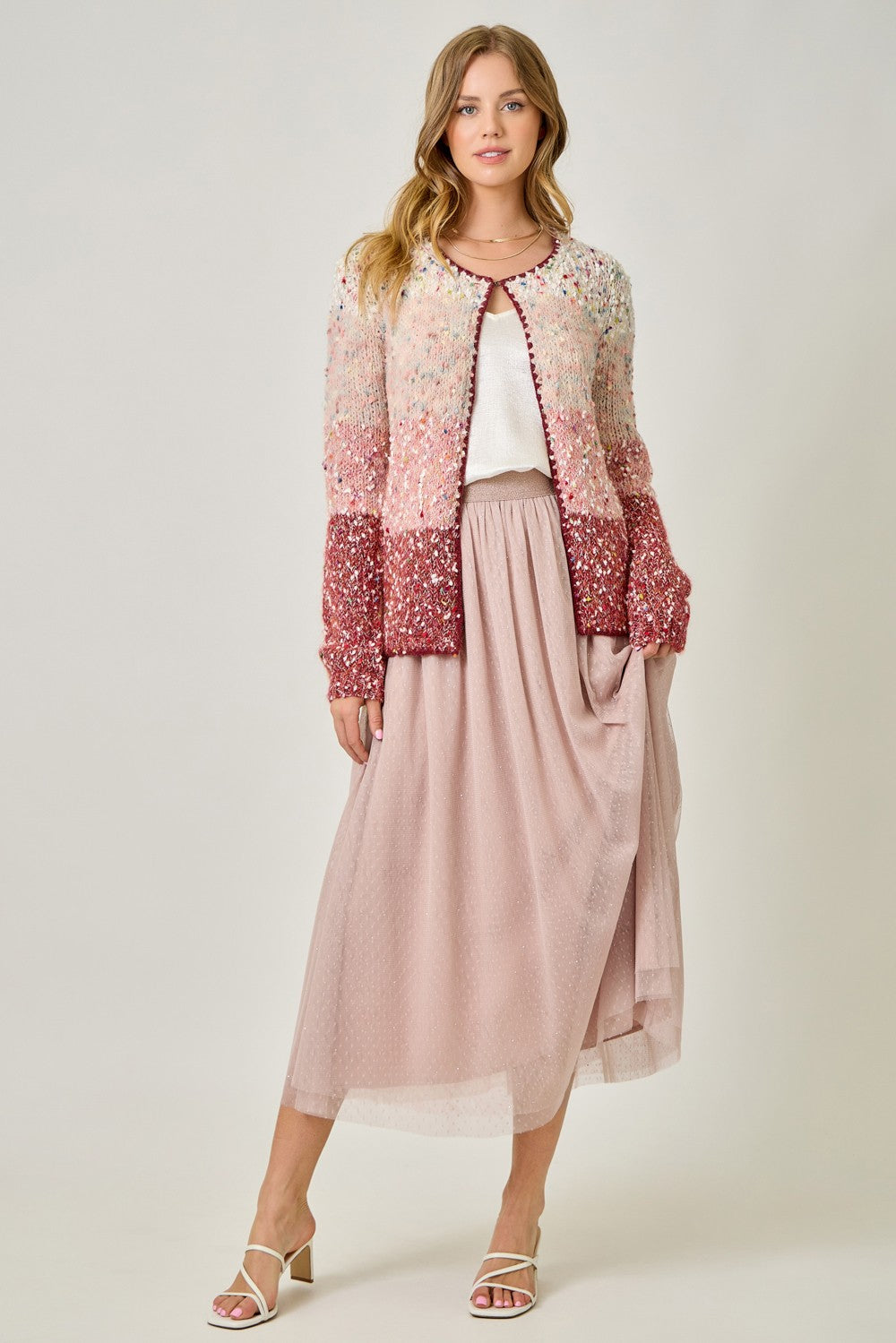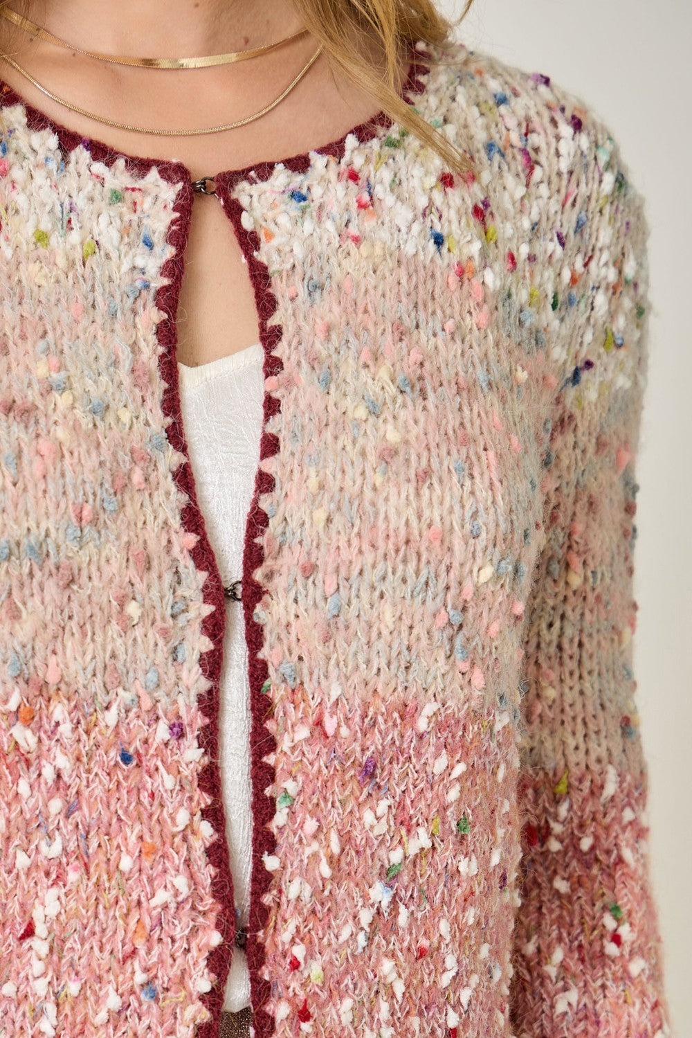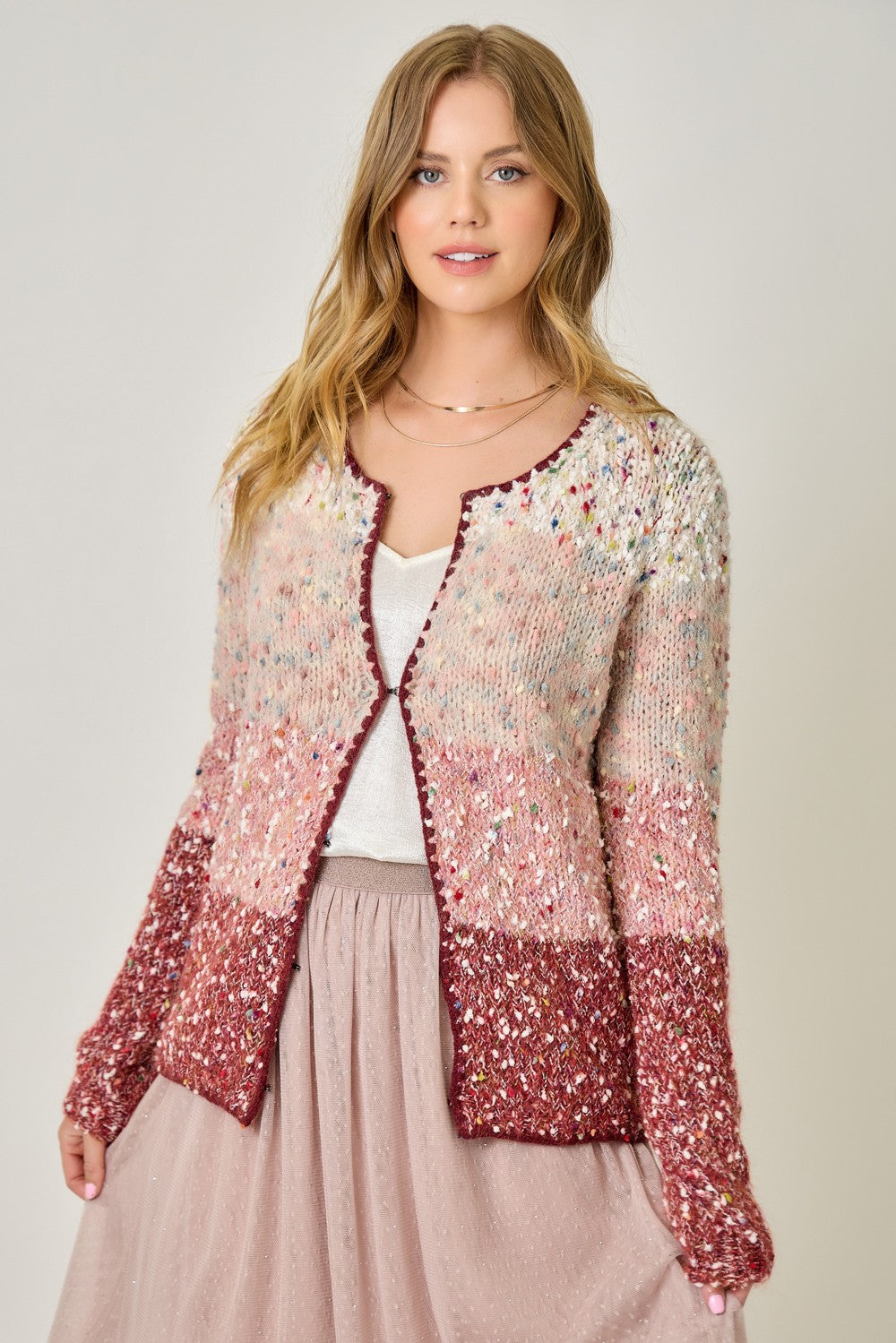 Add cozy sophistication to your fall wardrobe with the Berry Patch Colorblock Cardigan. Featuring a hook-front closure, scalloped hem detail, and long sleeves in a rich berry mix, this melange colorblocked cardigan blends texture and color for a stylish layered look. Perfect over tees, blouses, or dresses, it’s a versatile piece that brings warmth and charm to any outfit.