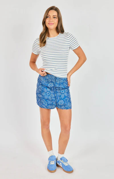 Stripes never go out of style—especially when they're this charming. The Memento Stripe Tee pairs classic ivory and blue stripes with a relaxed short sleeve cut that's perfect for layering or wearing solo. Soft, breathable fabric keeps you comfortable all day long, whether you're running errands or grabbing coffee with friends. A timeless wardrobe essential that works harder than it looks.