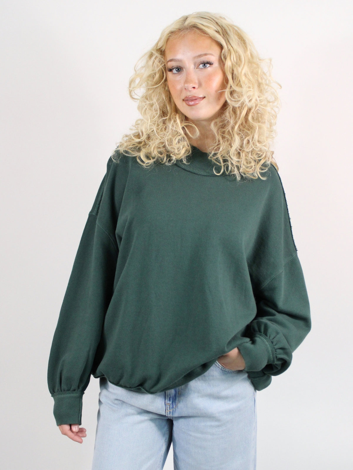Stay cozy and stylish in this oversized pullover from We The Free. Made with soft French terry fabric, it features a trendy mock neck and relaxed, slouchy fit that’s perfect for layering. The drop-shoulder sleeves and ribbed trim add a laid-back vibe, while exposed seams give it a cool, effortless edge. Pair it with a fitted turtleneck for an extra warm, playful look you'll want to wear all season long.