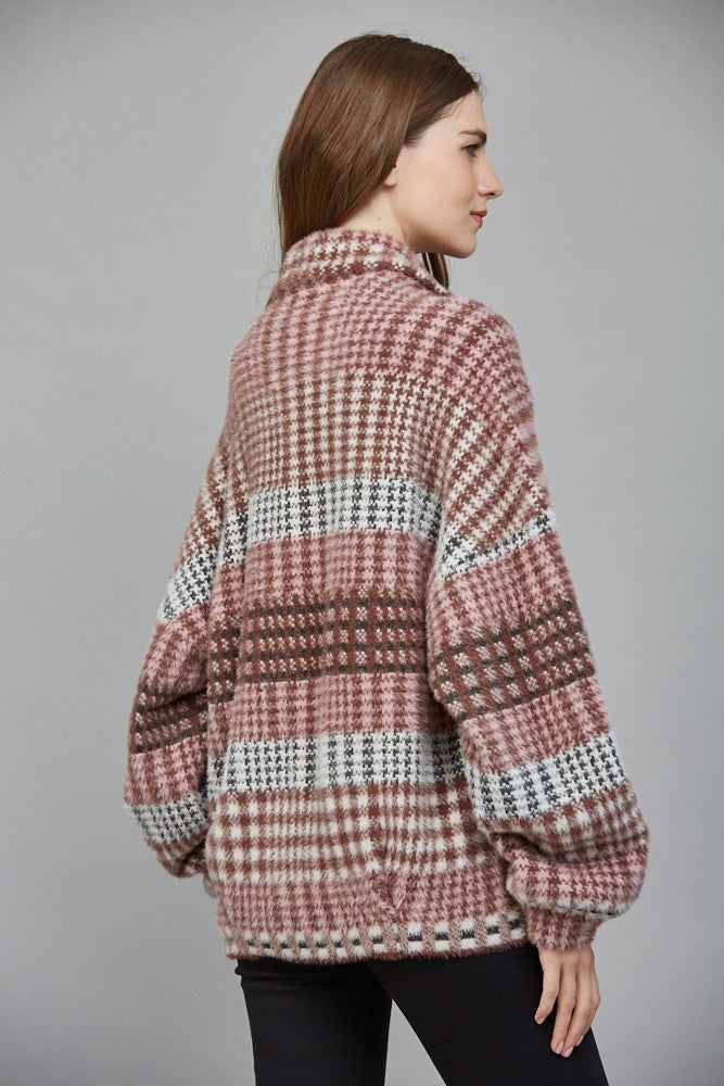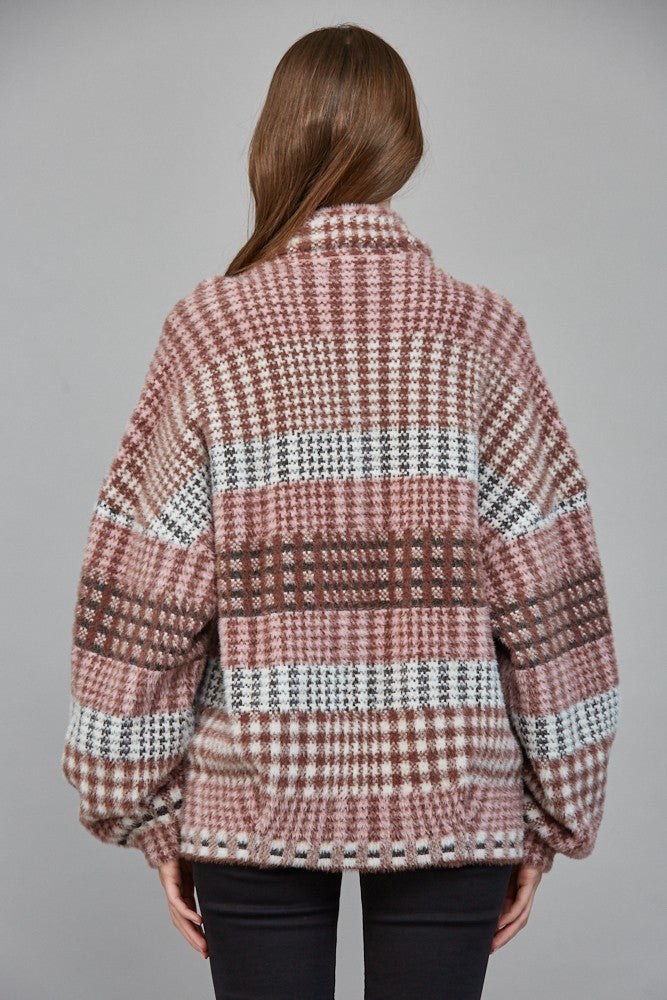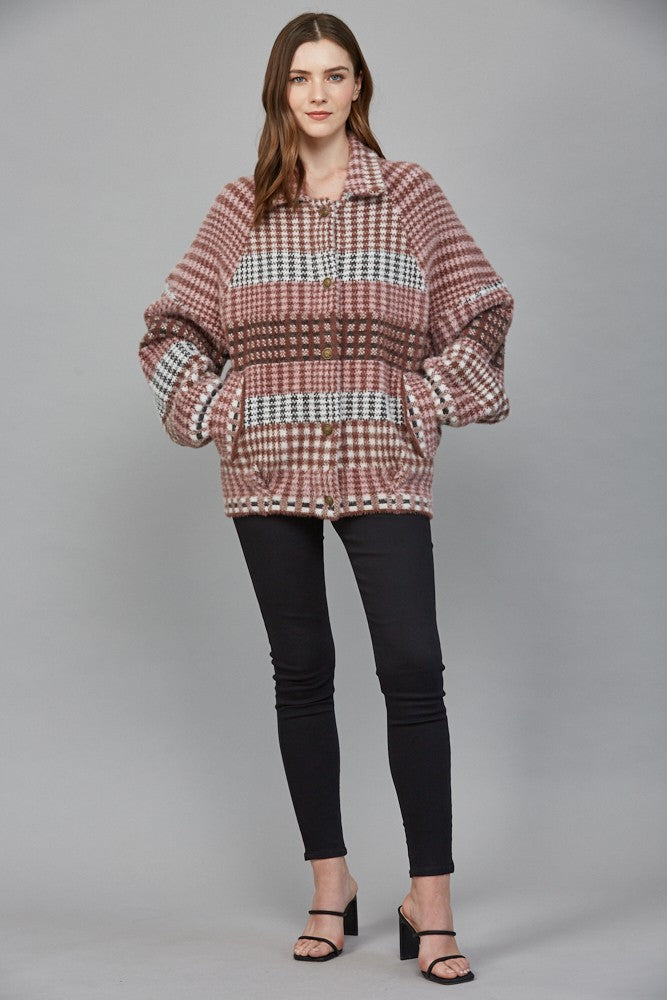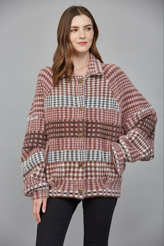Stay warm in style with the Cozy Plaid Fuzzy Jacket. Featuring a classic plaid pattern and a button-front closure, this fuzzy sweater jacket offers a soft, comforting feel with effortless fall charm. Perfect for layering over tees, blouses, or lightweight sweaters, it pairs seamlessly with jeans or leggings for a cozy, casual look.