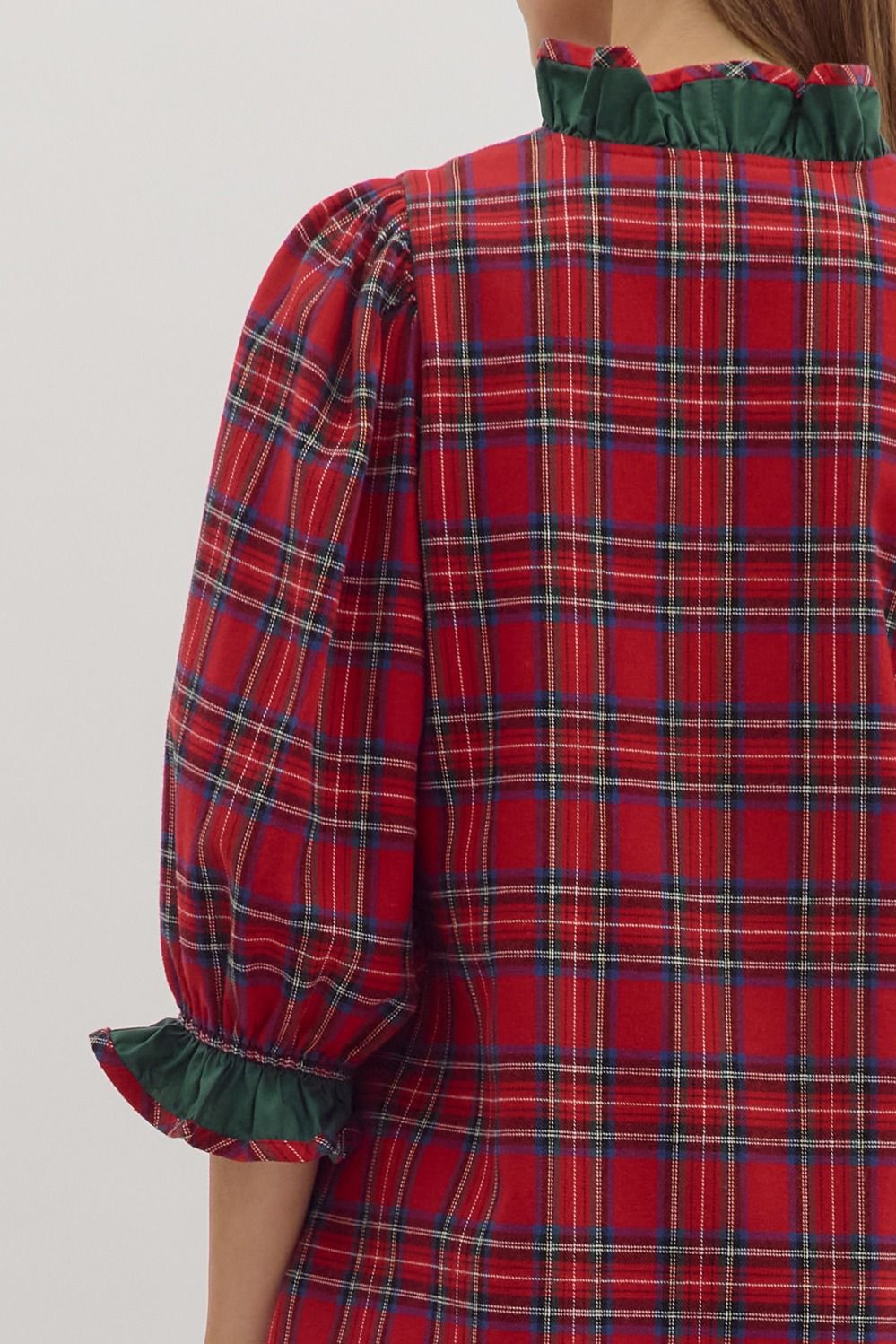 Celebrate the season in style with the Merry & Bright Plaid Mini Dress. This red holiday plaid mini dress features 3/4 puff sleeves and a contrast ruffled trim along the neckline and front placket for a charming, festive touch. Button-front closure, side pockets, and full lining add both comfort and function. Perfect for holiday gatherings, seasonal parties, or cozy winter outings, this dress combines classic plaid with playful, feminine details.