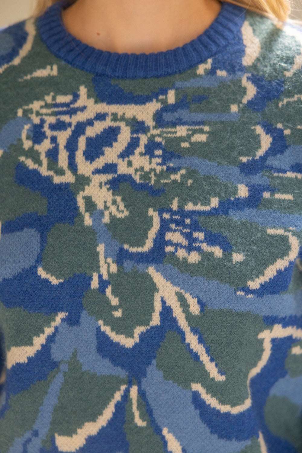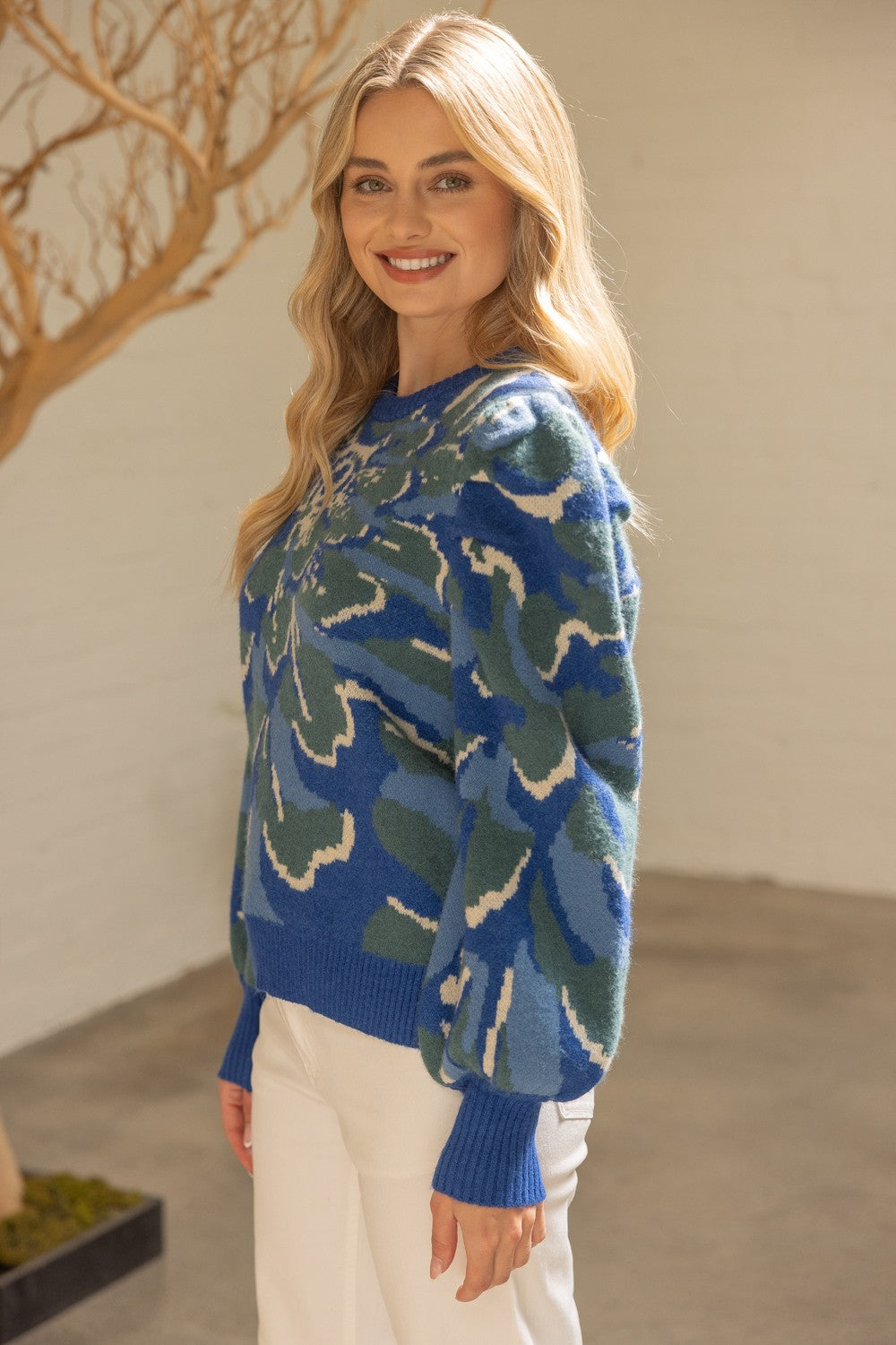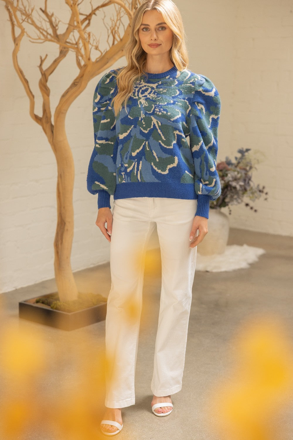 Capture the essence of fall with this blue floral print sweater, featuring long pleated puff sleeves and a classic round neckline. Contrast ribbed knit at the cuffs, neck, and hem adds structure and style, making this cozy, feminine piece perfect for layering or wearing on its own for a polished seasonal look.