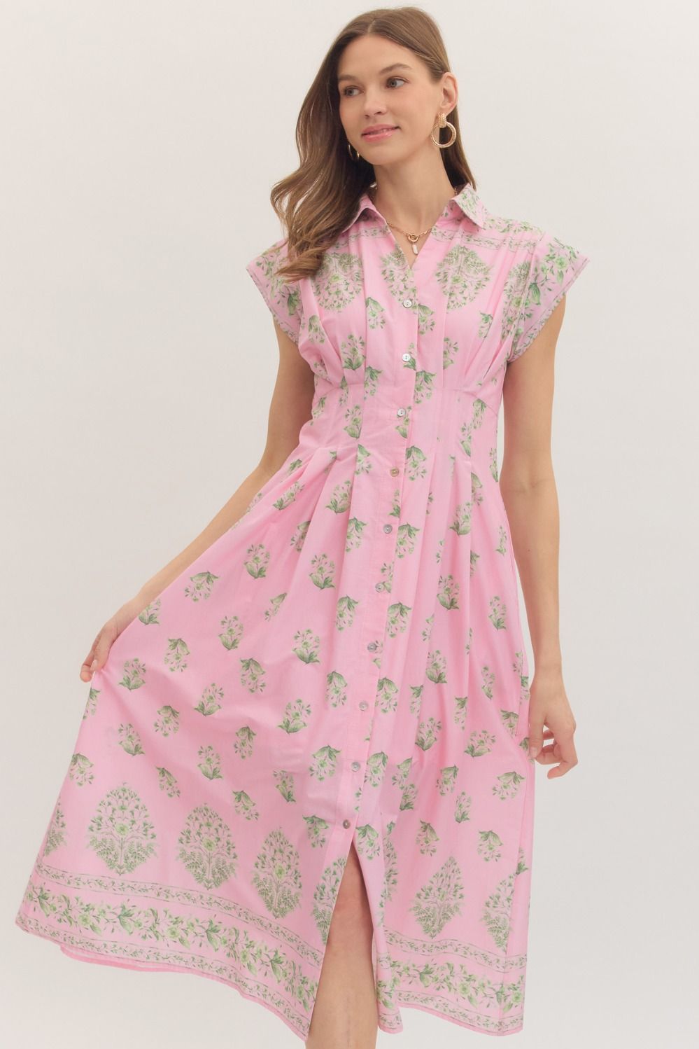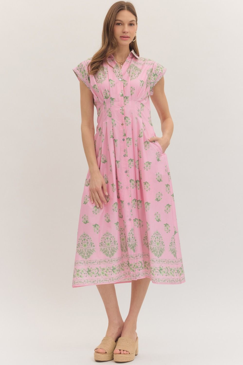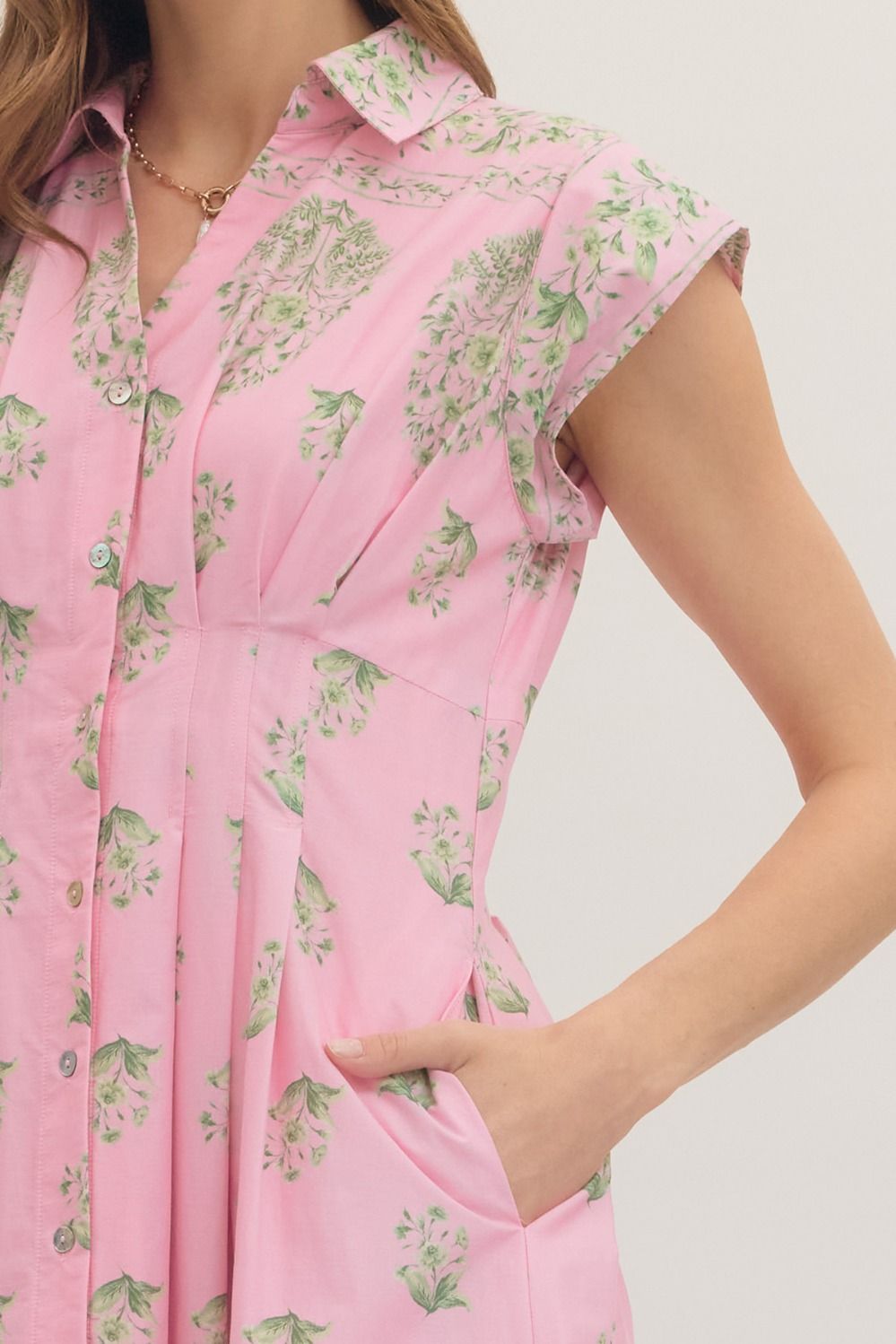 Charming and effortlessly refined, the Petal Poise Ruffle Sleeve Midi Dress is perfect for any spring-to-summer occasion. Featuring a soft botanical print, this midi dress is designed with delicate ruffle cap sleeves and a flattering pleated waist that enhances your silhouette. The button-front closure adds a classic touch, while side pockets offer everyday functionality. Crafted in a lightweight woven fabric and fully lined for comfort, it’s an easy, feminine style you’ll reach for again and again.