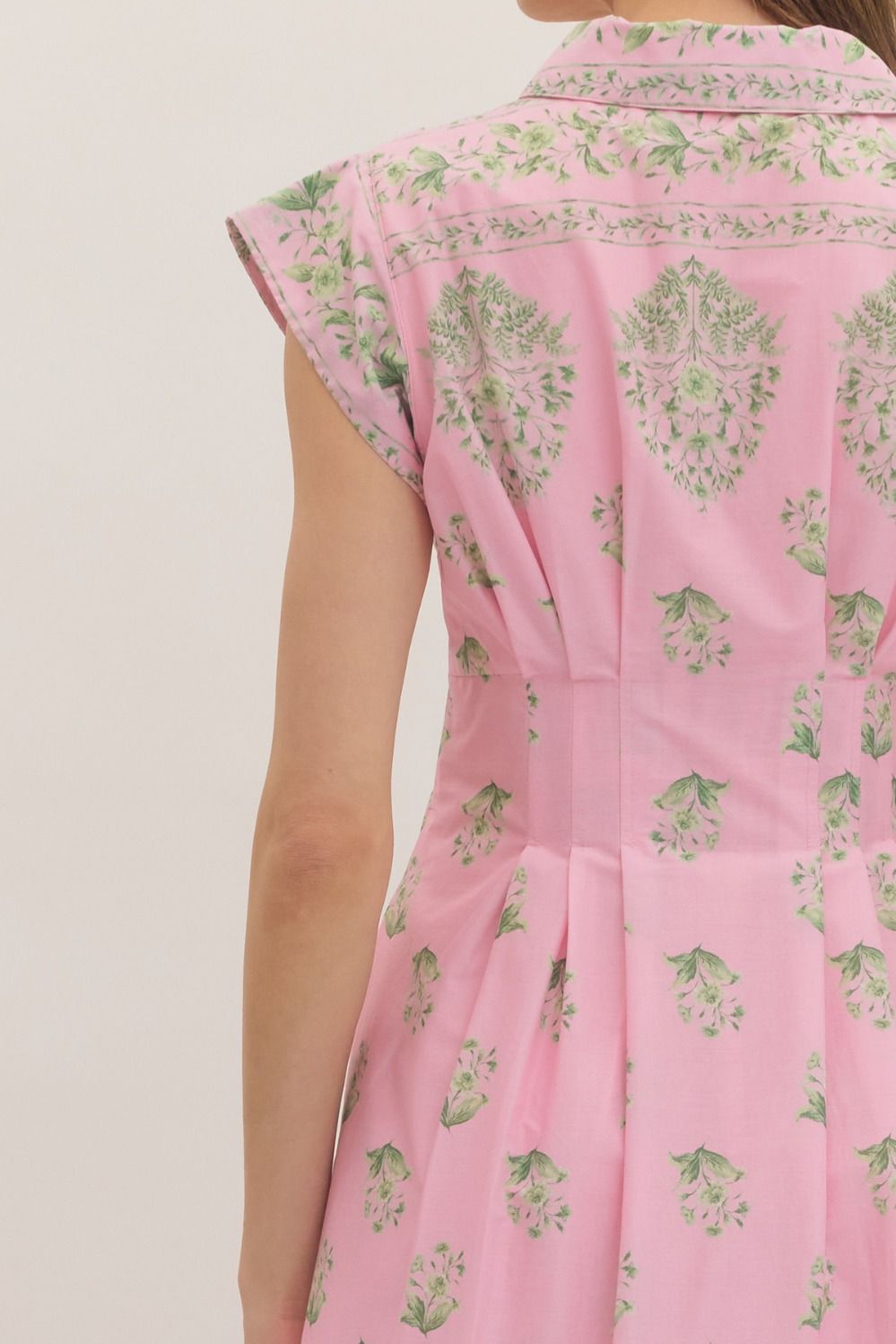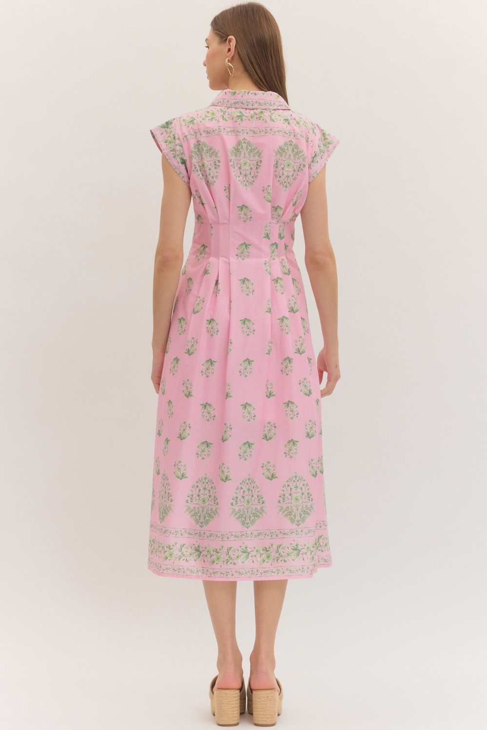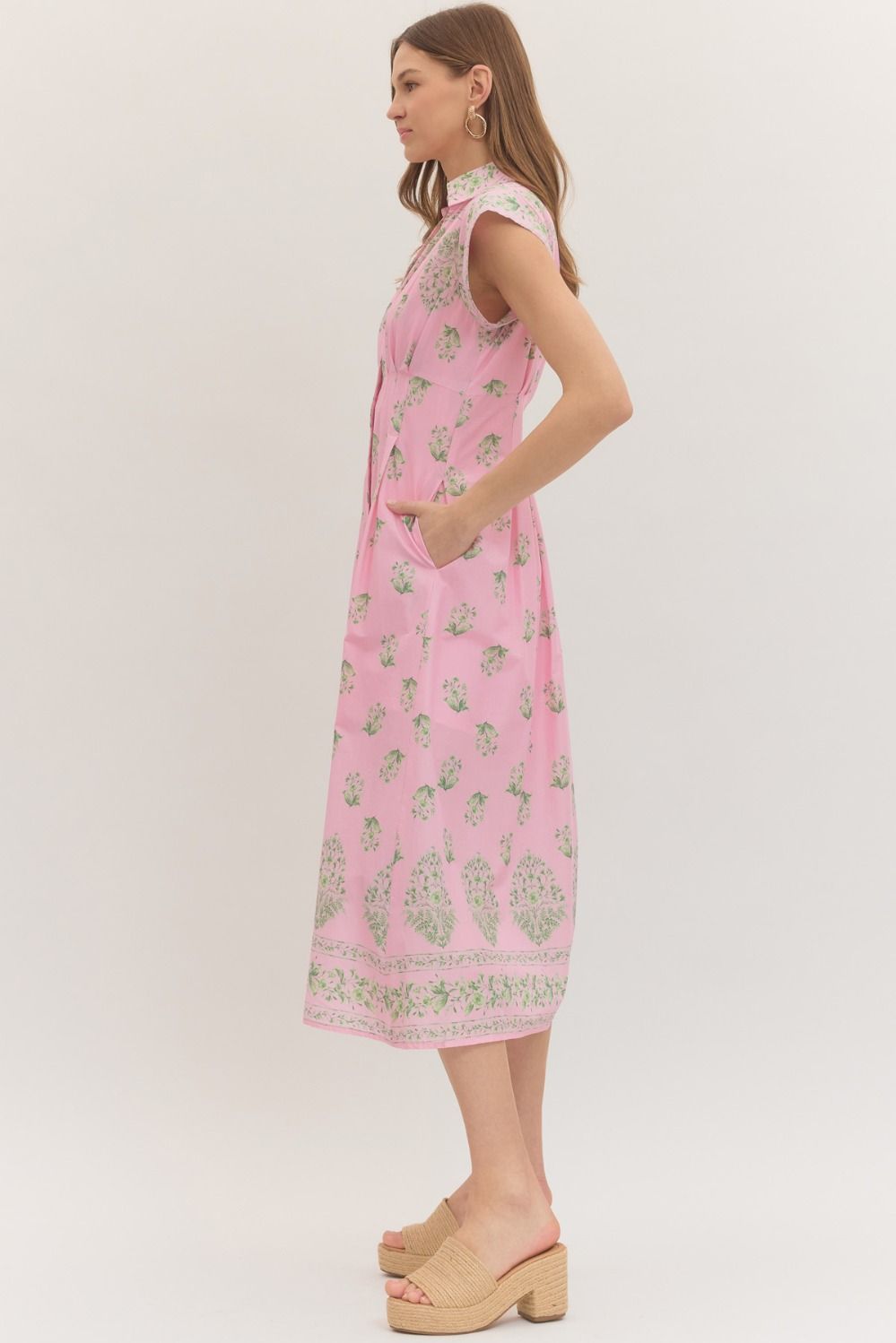 Charming and effortlessly refined, the Petal Poise Ruffle Sleeve Midi Dress is perfect for any spring-to-summer occasion. Featuring a soft botanical print, this midi dress is designed with delicate ruffle cap sleeves and a flattering pleated waist that enhances your silhouette. The button-front closure adds a classic touch, while side pockets offer everyday functionality. Crafted in a lightweight woven fabric and fully lined for comfort, it’s an easy, feminine style you’ll reach for again and again.