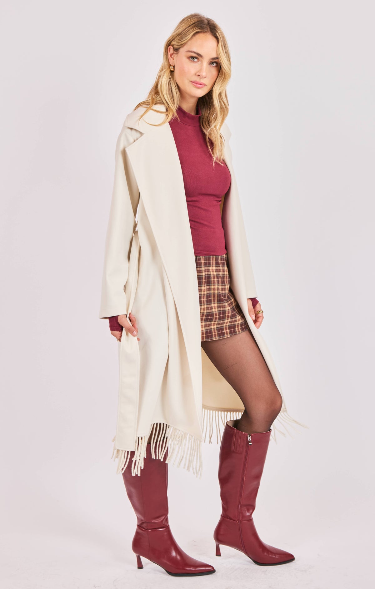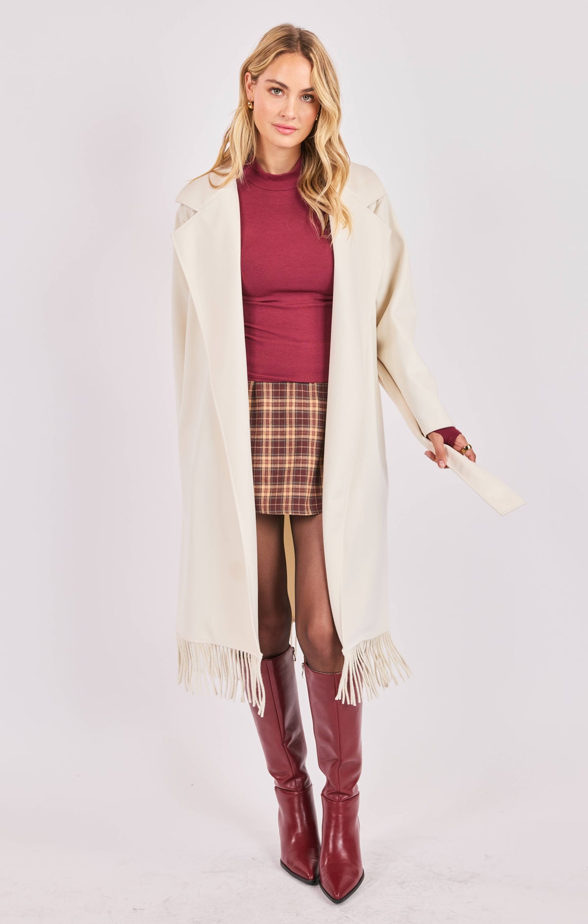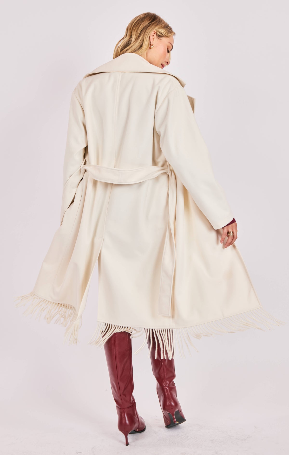 Wrap yourself in cozy sophistication with the Reeve Braided Fringe Belt Coat. This statement piece features charming braided fringe detailing that adds movement and texture to your everyday look. The included belt cinches at the waist for a flattering silhouette, while the relaxed fit keeps comfort front and center. Perfect for layering over your favorite outfits, this coat brings playful personality to transitional weather styling.