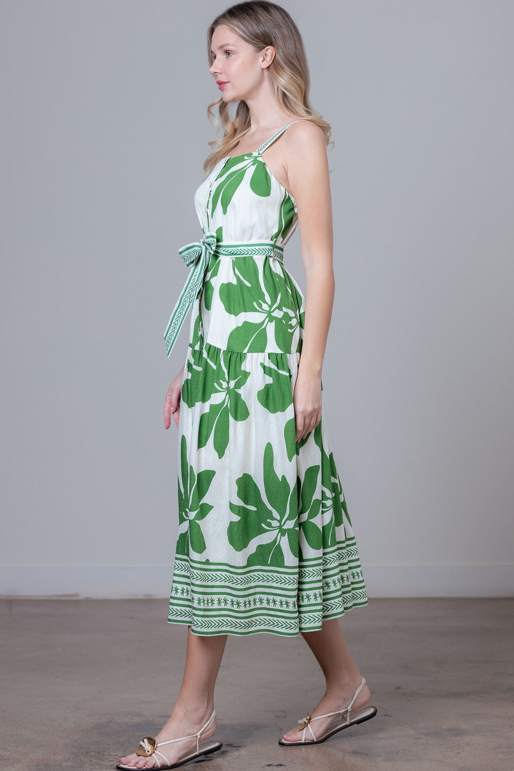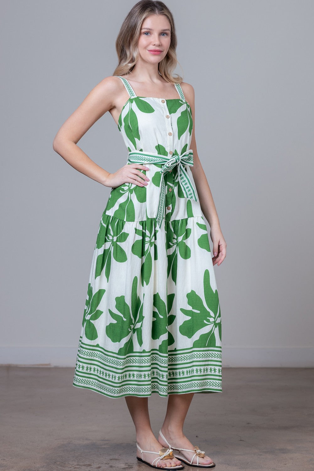 Fresh, feminine, and effortlessly charming, the Garden Blooms Midi Dress is made for sunny days and easy styling. Designed with a flattering square neckline and delicate spaghetti straps, this sleeveless midi features a full button-down front with seven buttons for a classic touch. The soft fabric drapes beautifully, while the adjustable belt cinches the waist for a customizable, relaxed fit. Finished in a vibrant floral print, it’s perfect for everything from casual daytime outings to weekend brunch plans.