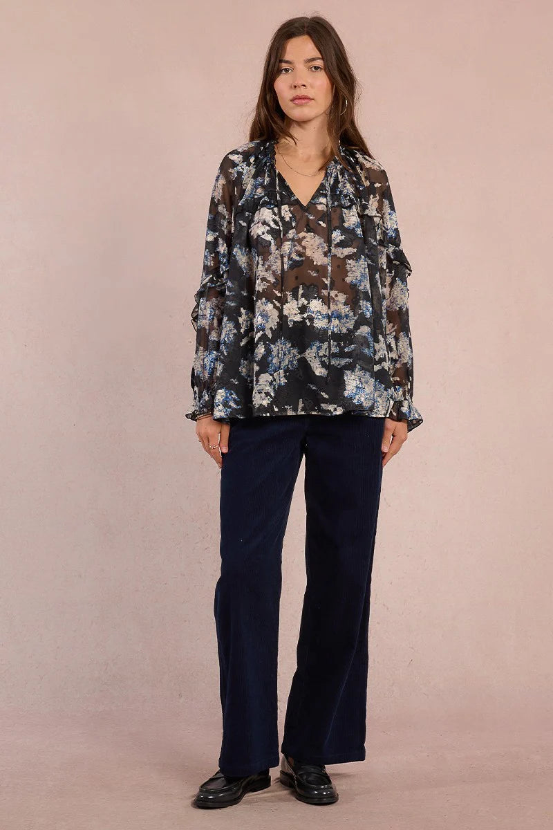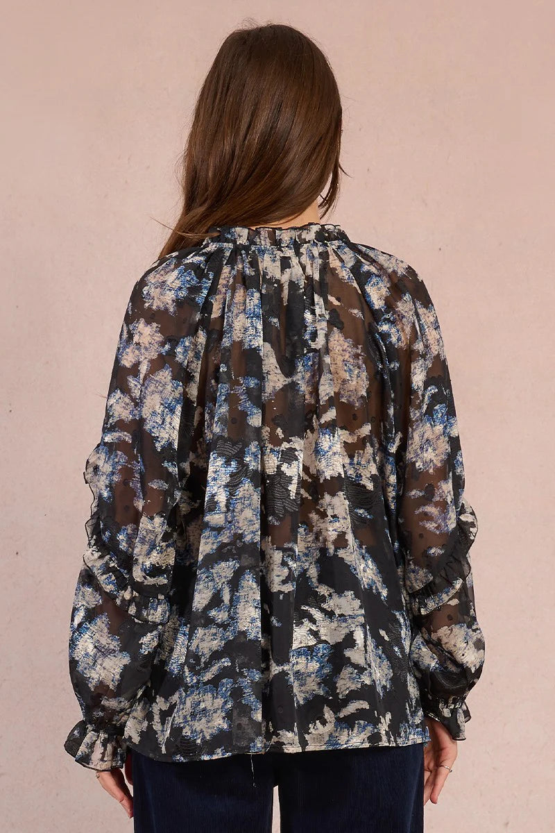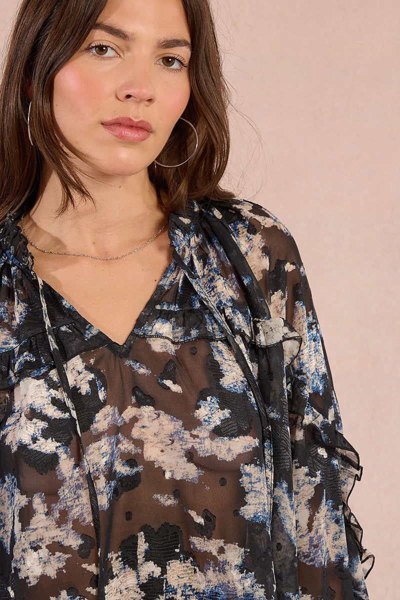 This Molly Bracken Printed Blouse brings a flirty touch to your wardrobe with its semi-transparent fabric and playful ruffled officer collar tied with a chic bow. The long sleeves end in elasticated cuffs for a comfy fit, while the horizontal ruffle band draws attention to your bust and arms. Featuring a slight V-neckline and a flattering straight cut, it’s perfect for adding a dash of fun elegance to any outfit.