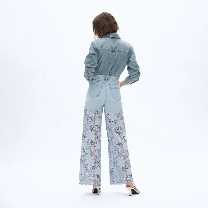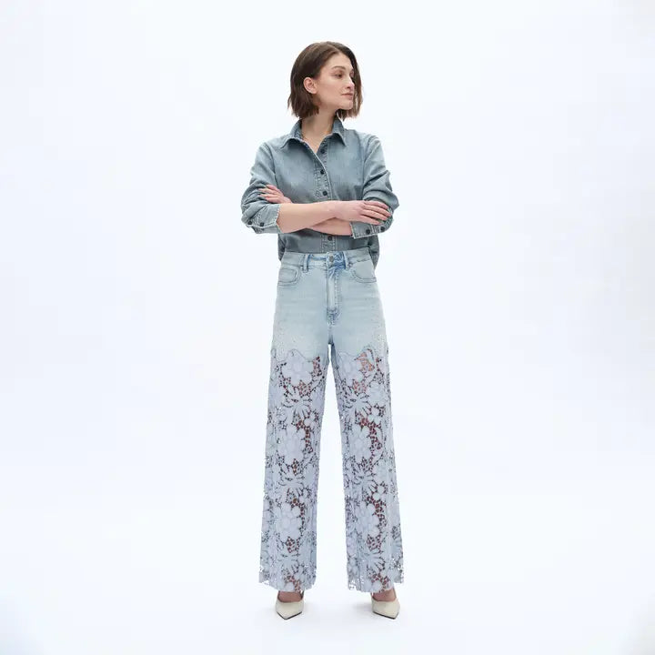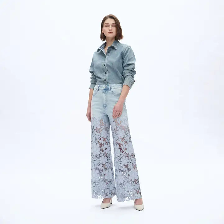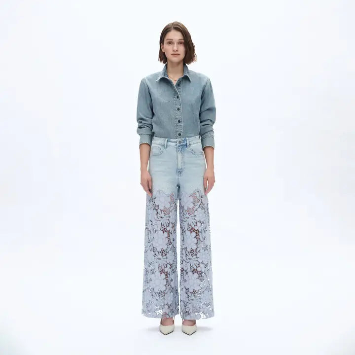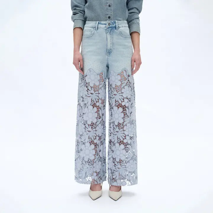 Make a statement in the Starlight Bloom Wide Leg Jeans, designed with a super high-rise waist and a flattering wide-leg silhouette. Crafted from power stretch denim in a light blue wash, these jeans feature delicate floral cutout embroidery accented with rhinestones for a subtle sparkle. The natural washing effect adds a lived-in feel, while the raw hem gives the look a modern, edgy finish. With five pockets and a classic zipper fly, these jeans blend everyday function with standout style—perfect for dressing up or down.