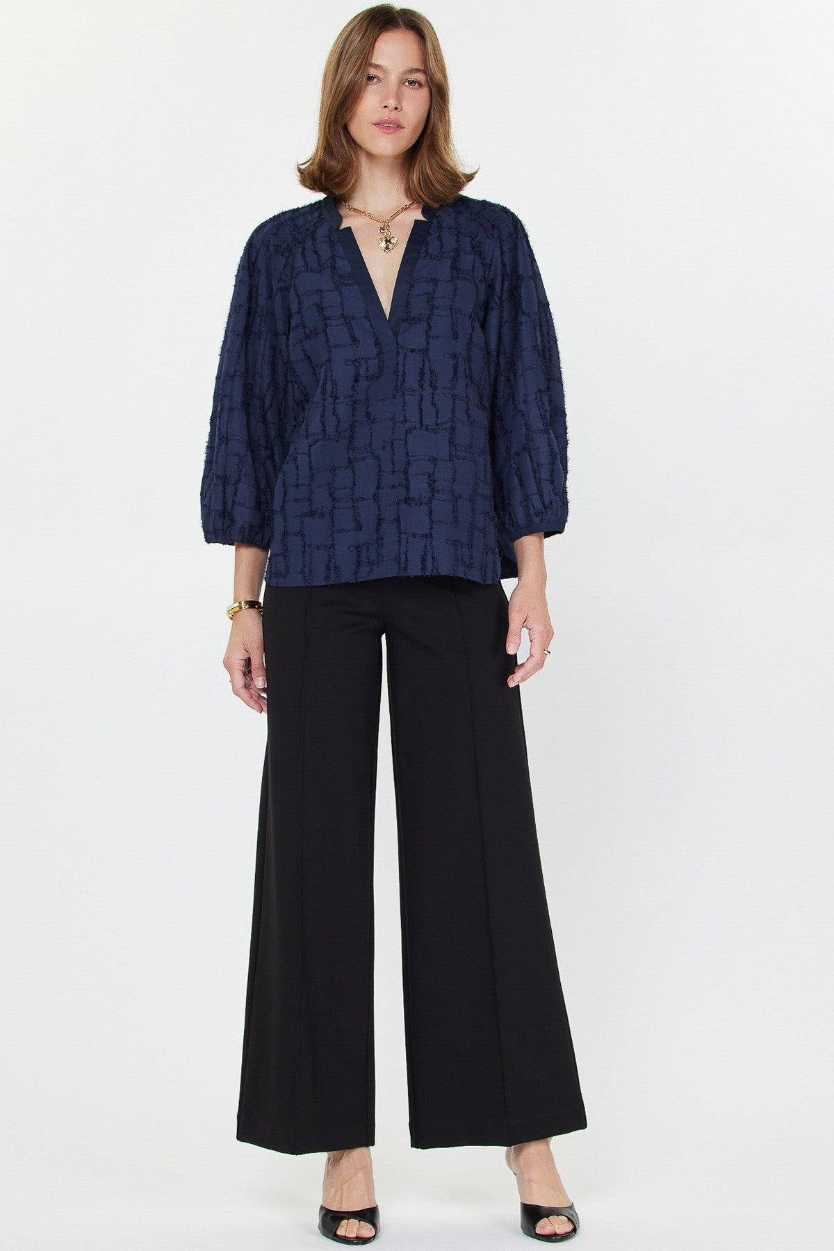 Refined yet effortless, the Autumn Textured Jacquard Blouse features a subtle grid-patterned jacquard texture and a split V-neckline with a standing collar for a modern touch. 3/4 length sleeves with elasticized cuffs and a relaxed fit make it easy to wear from desk to dinner. Pair with tailored trousers or your favorite jeans for a polished, versatile fall look.