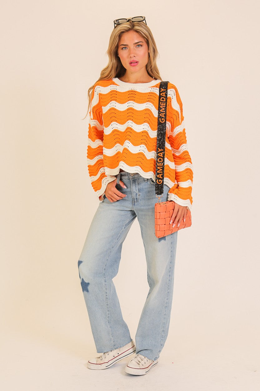 Make a bold statement while cheering on the Vols in this vibrant orange wavy textured knit sweater. The scalloped wave pattern adds eye-catching dimension and movement, while the soft open-knit design keeps you cozy yet breathable. With its relaxed fit and long sleeves, it’s perfect for layering on cool gamedays or pairing with your favorite denim for an effortlessly spirited look.